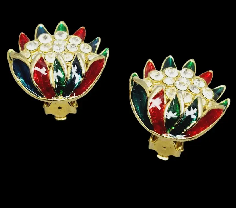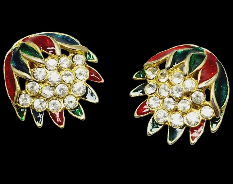 Lovely vintage flower brooch with green and red enamel, adorned with sparkling clear rhinestones.