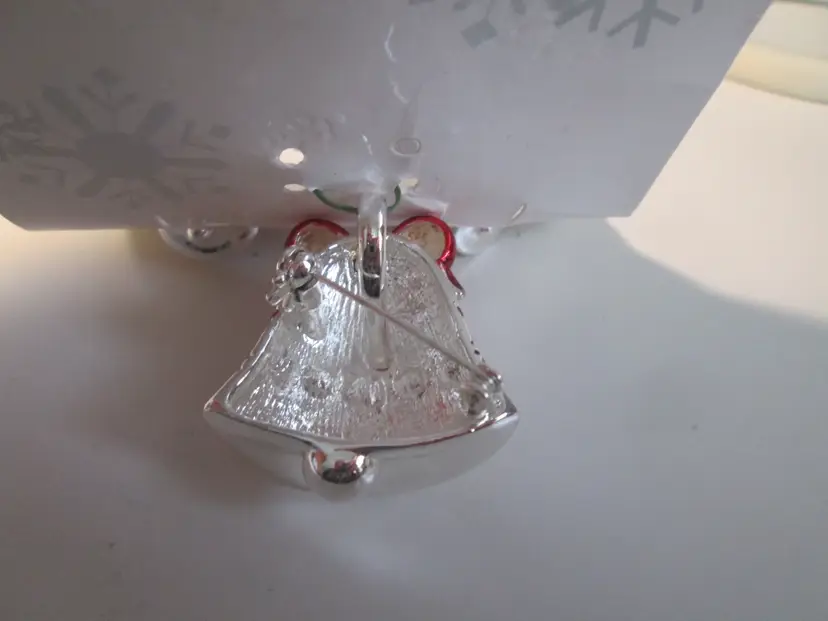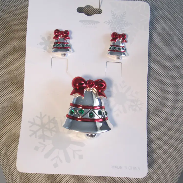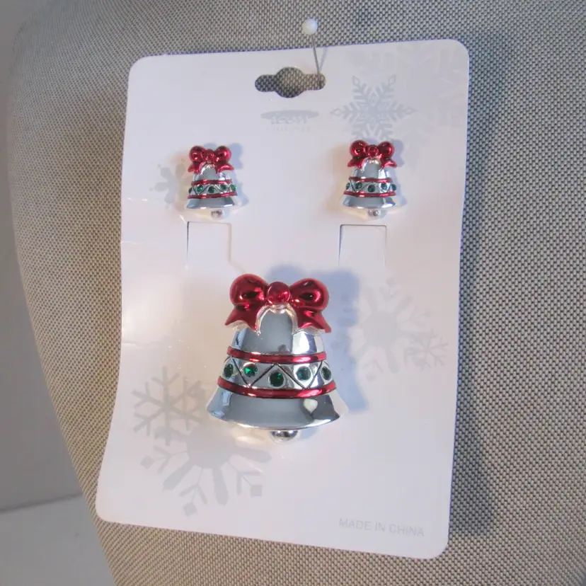 New old stock vintage enamel silver bell and rhinestone brooch or pendant with matching earrings. The red berries are created with crystal rhinestones. The brooch can be used as a brooch or pendant and measures 1 5/8" x 1 3/8". The earrings have a stud back and measure 5/8" x 3/4". Note they are still attached on the original paper retail tag.