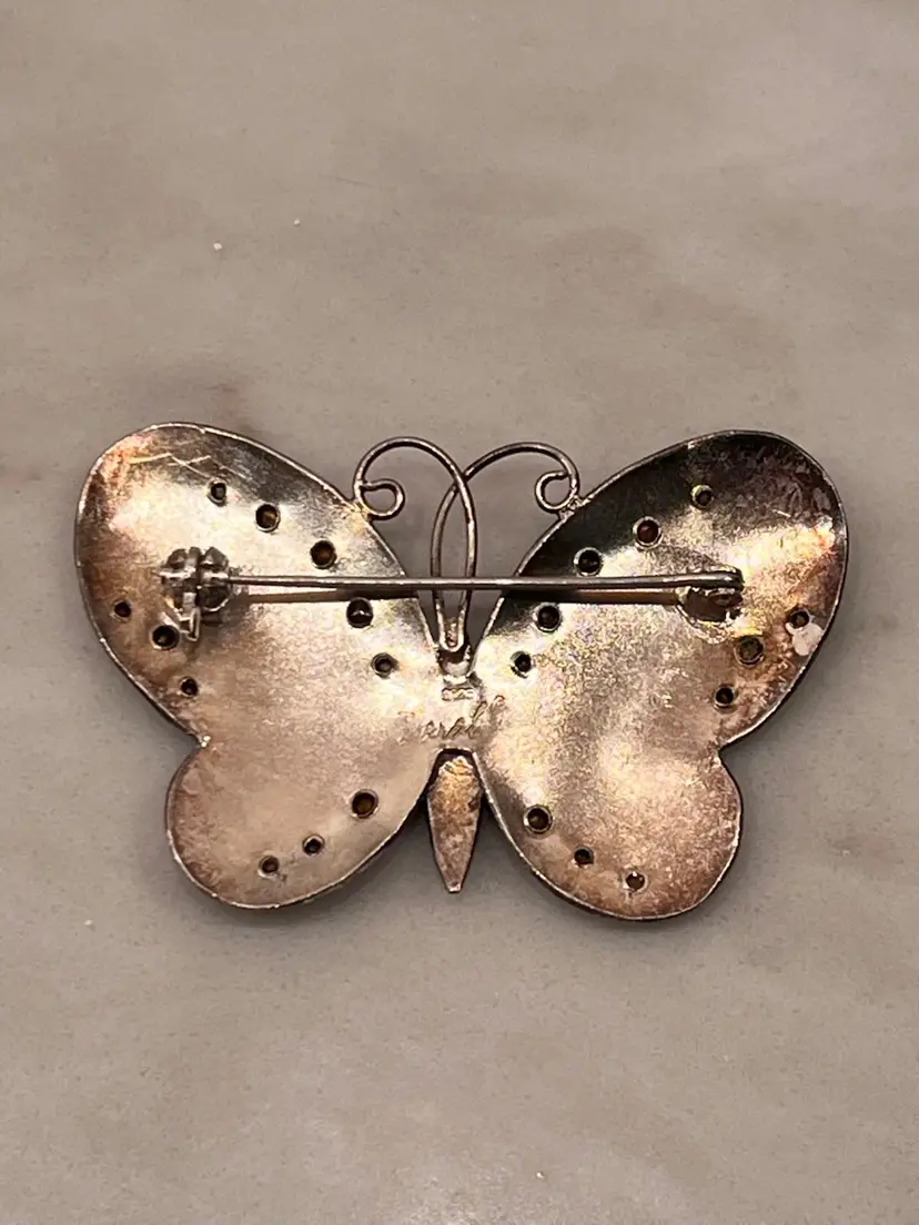 Vintage Enameled Sterling Silver Blue & Green Rhinestone Butterfly Brooch!