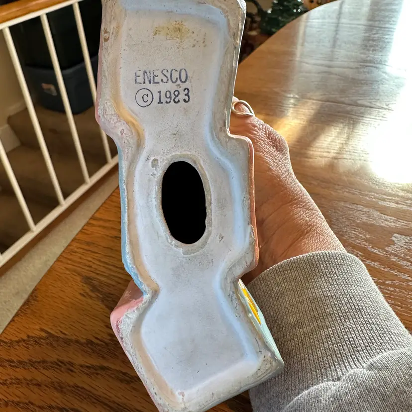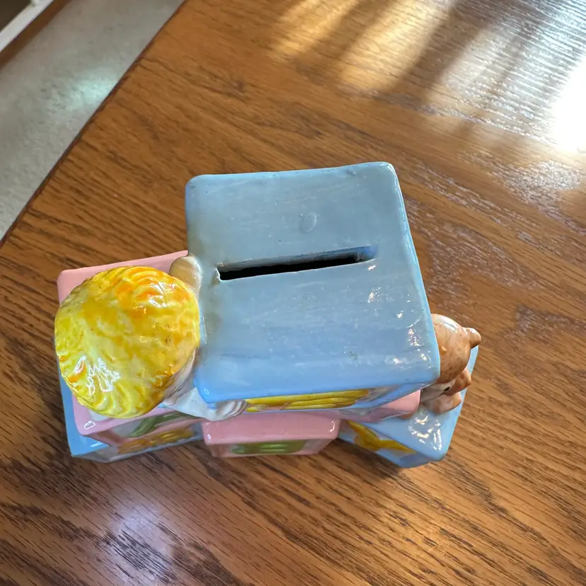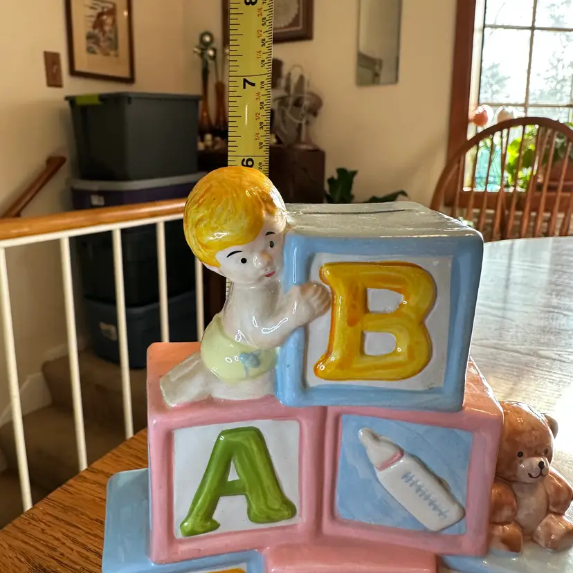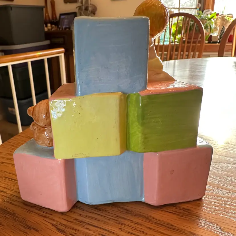 Vintage Enesco Ceramic Baby Blocks Coin Bank dated 1983. Colorful blocks spelling out "BABY". Stacked blocks in pink, blue, yellow green. No chips or cracks. Measures 6" tall x 6 1/4" wide.