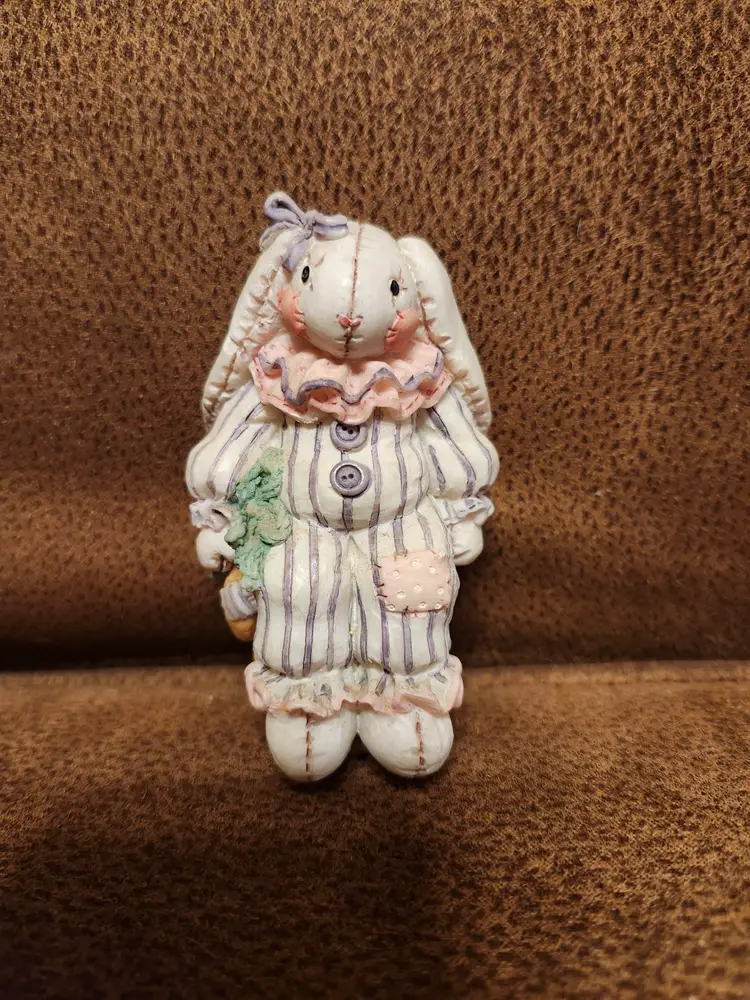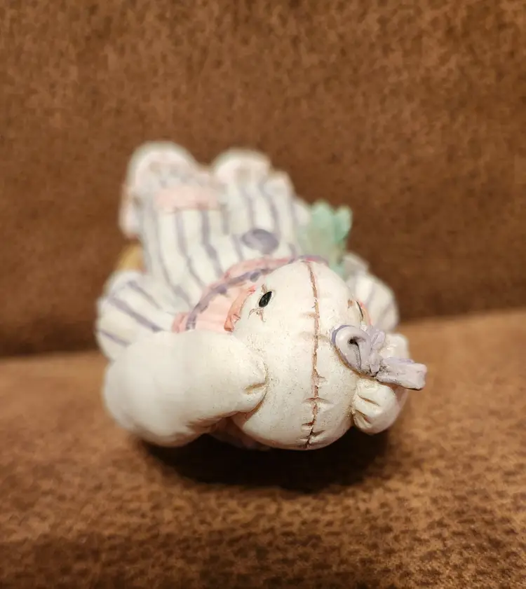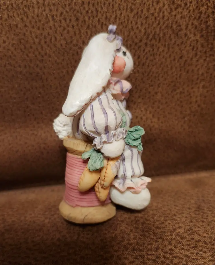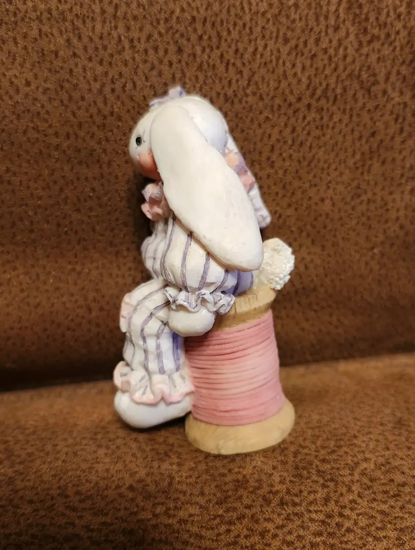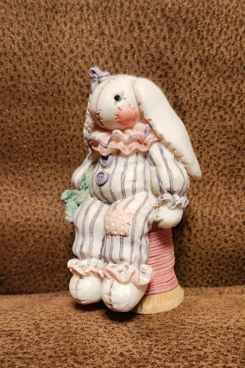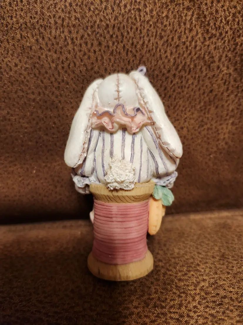 Vintage Enesco ceramic rag doll bunny on a spool of thread. Part of the Mary Rhyner collection. 4" tall