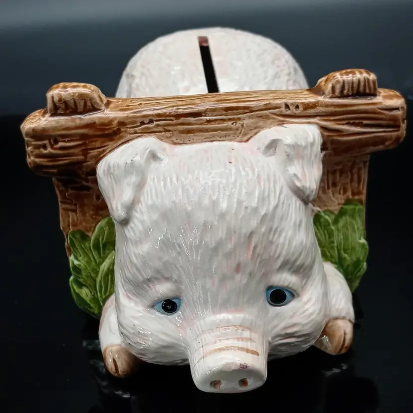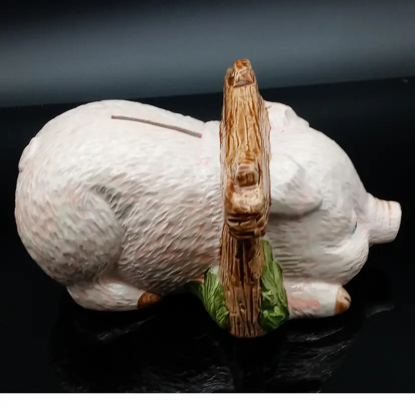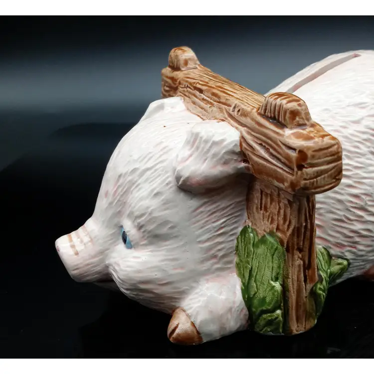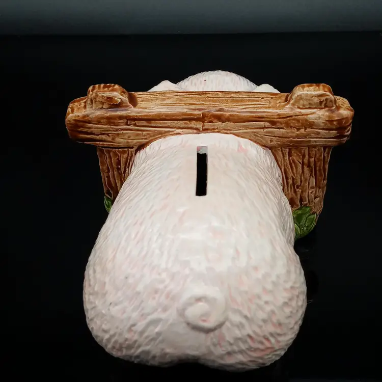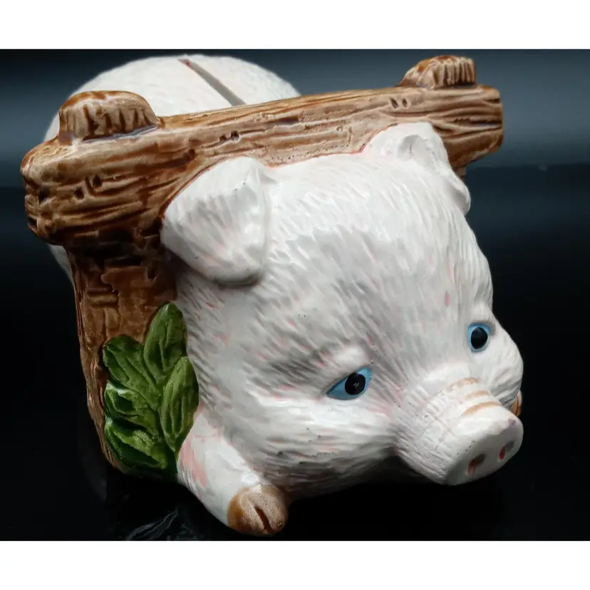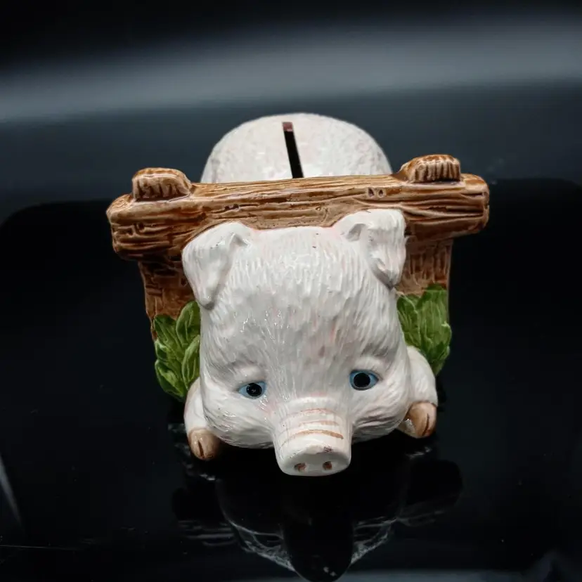 Vintage Enesco 1984 Ceramic Pig Bank Pig with Head Poking Through Fence Very Good Condition. Minor wear on the piggy's cheek. Please look at all pictures to see condition. Measures 3"H x 4 3/8" W