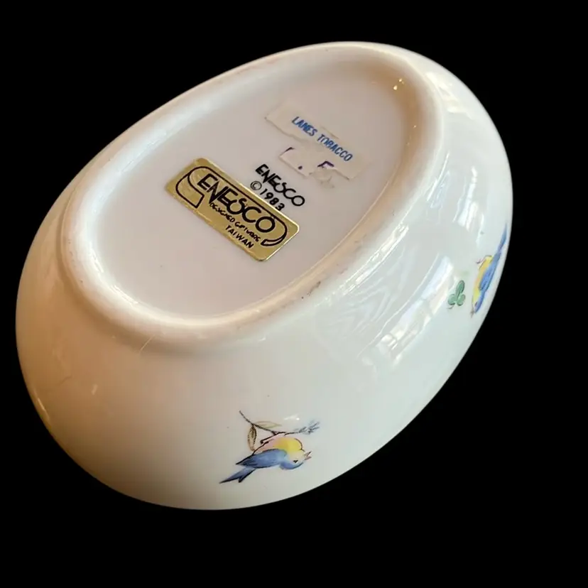 This particular egg-shaped trinket box made by Enesco, with its charming depiction of woodland creatures and flora, fits within the tradition of decorative ceramics from the late 20th century.