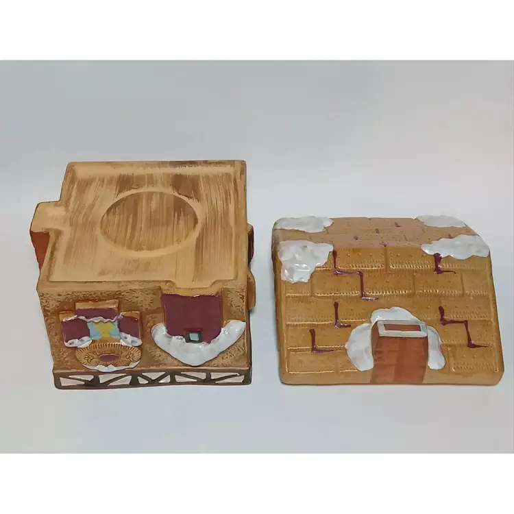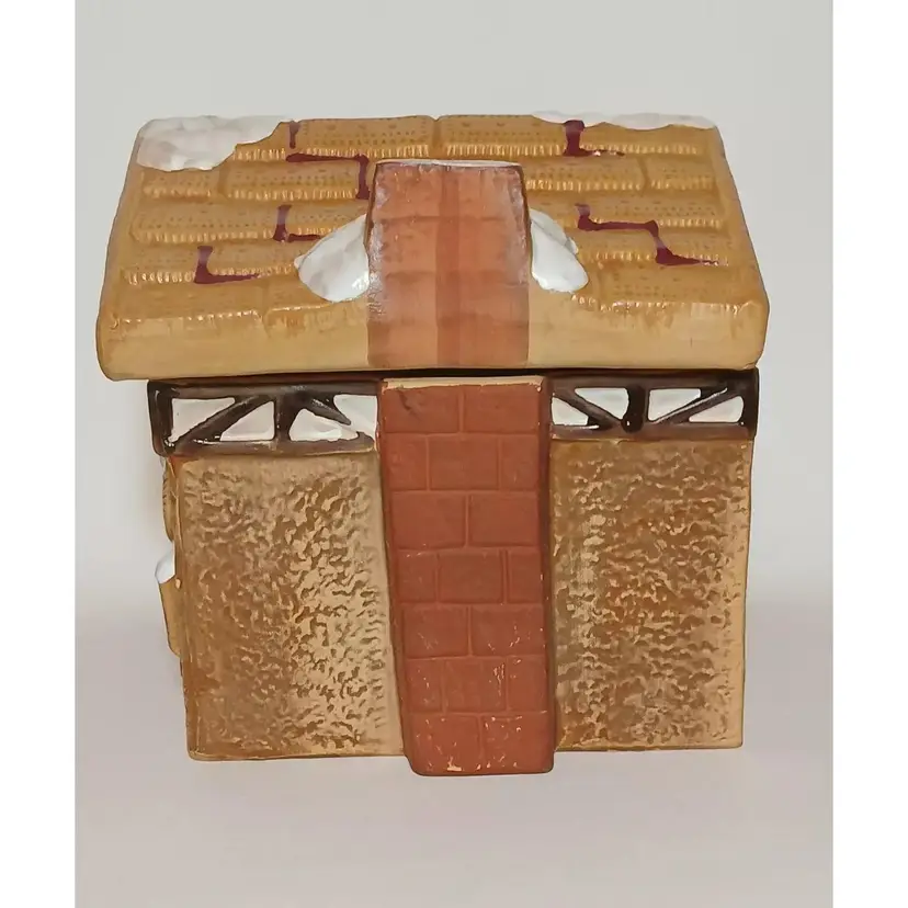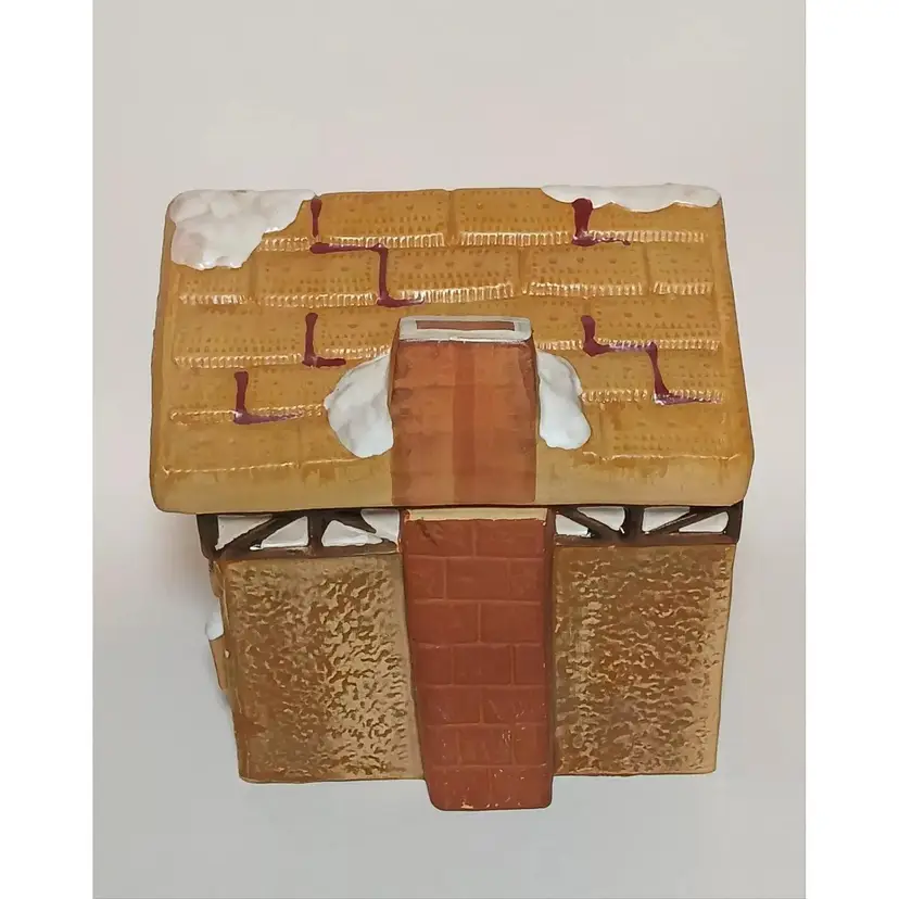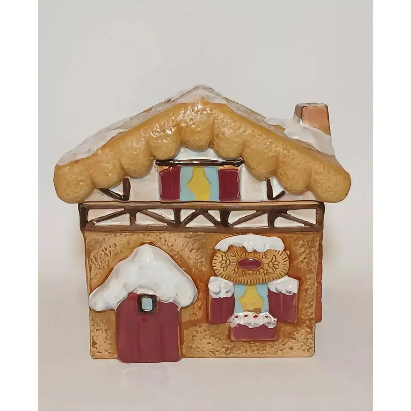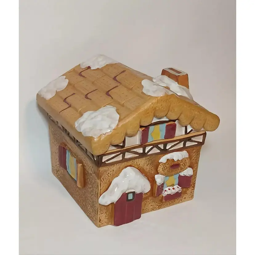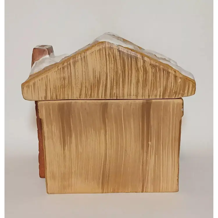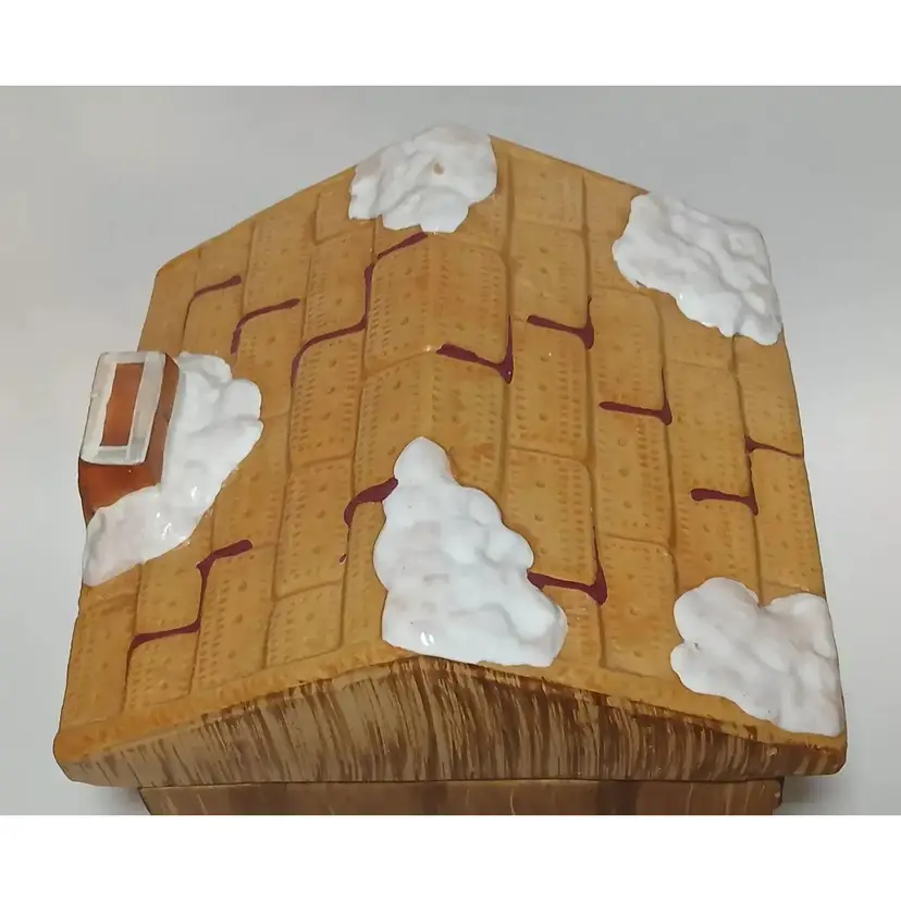 Vintage Japan Enesco Christmas Cookie Jar. Gingerbread House design. Faux wood and Stucco ceramic. Shortbread cookie roof and window shutter. Glossy paint on windows and doors. Tudor House Style Lid. Very little paint wear - very good used condition. A few tiny nicks and a little paint wear on the chimney, which is normal for age. This really is a unique and rare addition to a vintage collection.