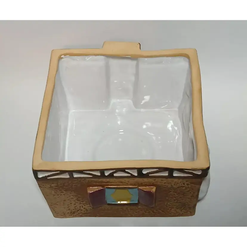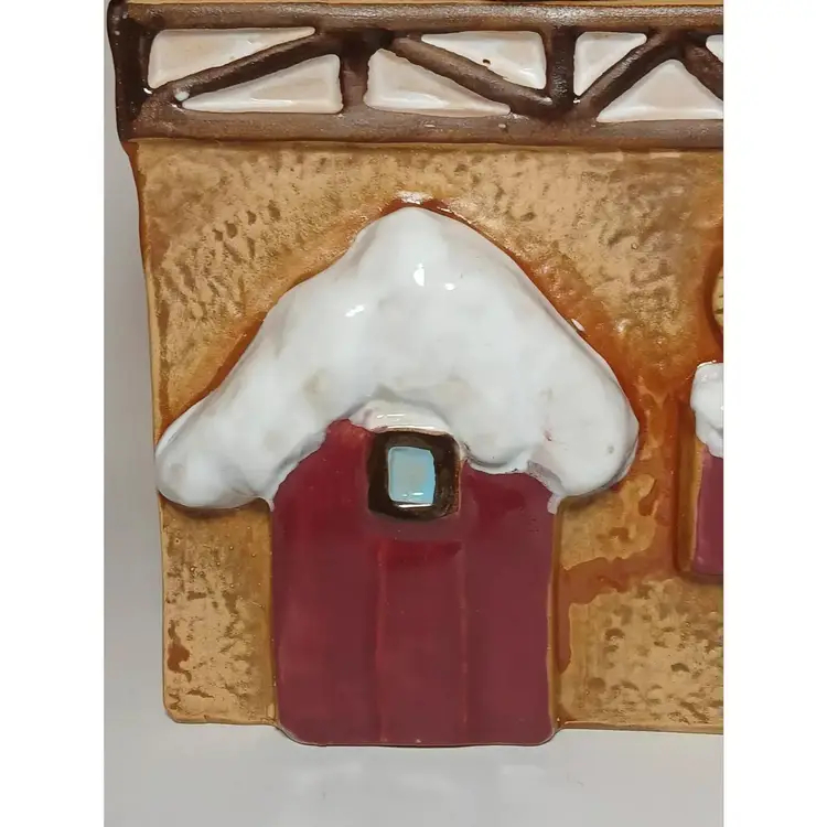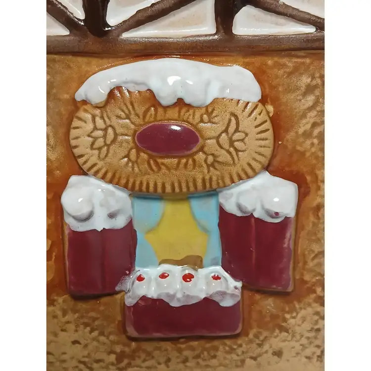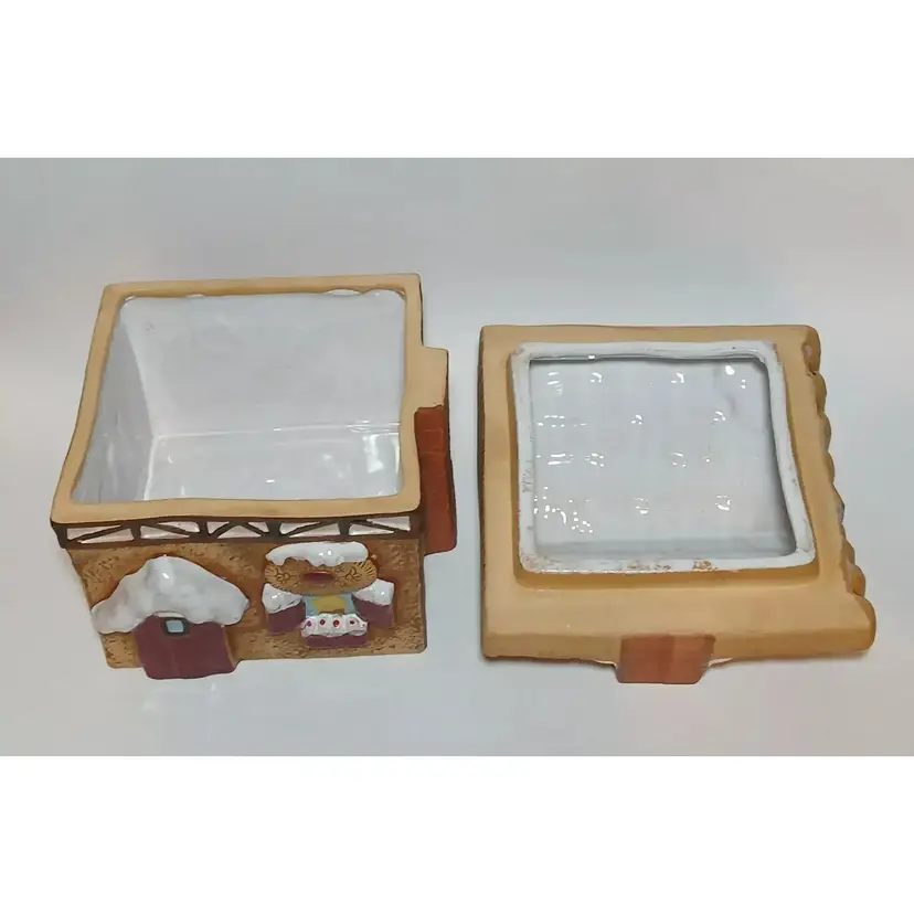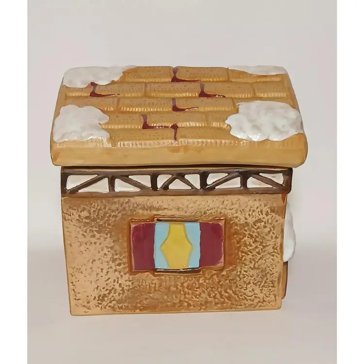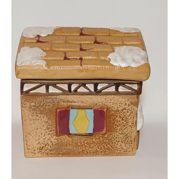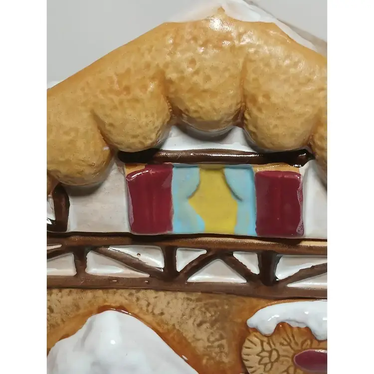 Vintage Japan Enesco Christmas Cookie Jar. Gingerbread House design. Faux wood and Stucco ceramic. Shortbread cookie roof and window shutter. Glossy paint on windows and doors. Tudor House Style Lid. Very little paint wear - very good used condition. A few tiny nicks and a little paint wear on the chimney, which is normal for age. This really is a unique and rare addition to a vintage collection.
