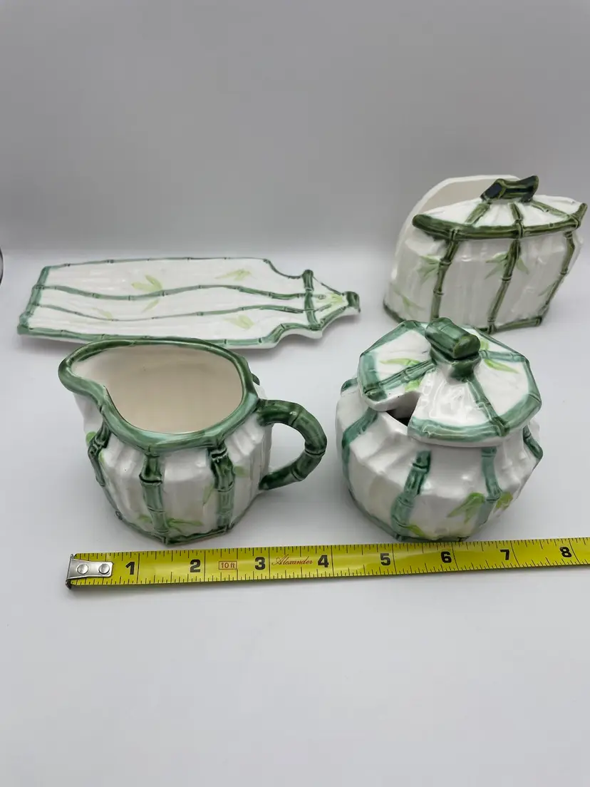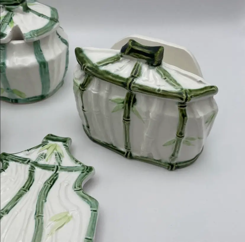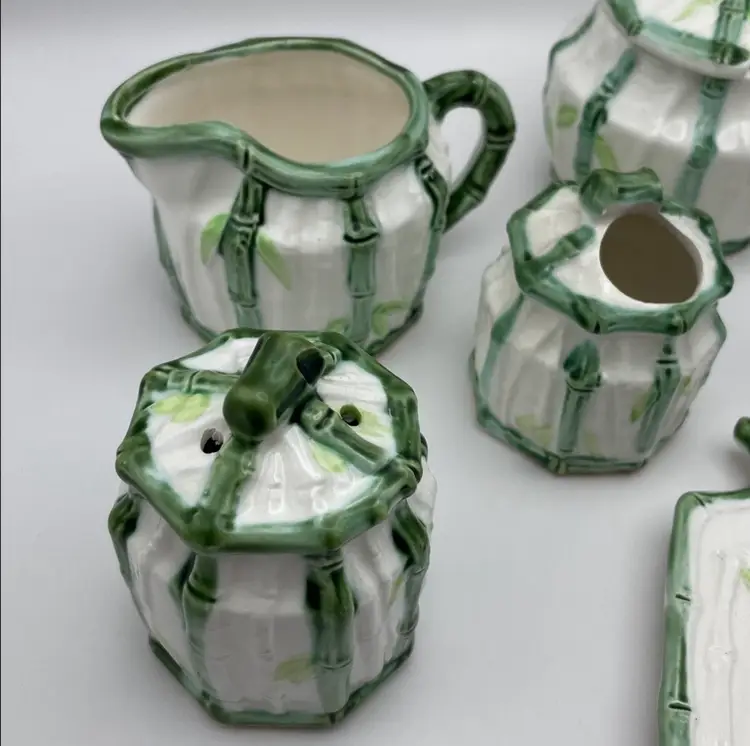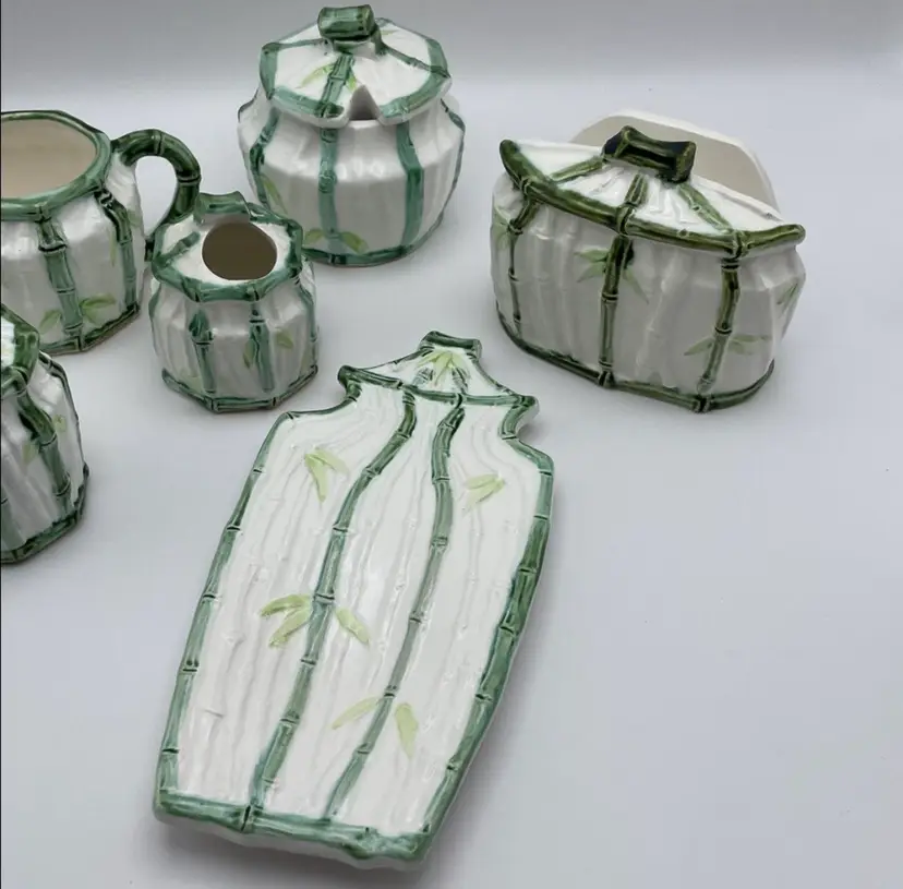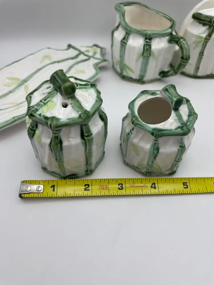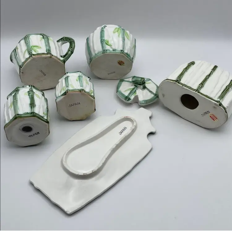 Vintage Enesco, Japanese, Green/White Bamboo Motif, Ceramic Table Serving Set includes: Napkin Holder Spoon Rest Creamer/Sugar Pepper Shaker Salt Cellar?