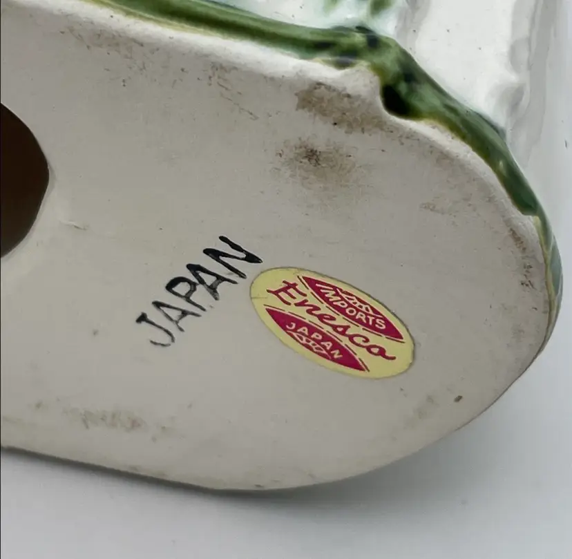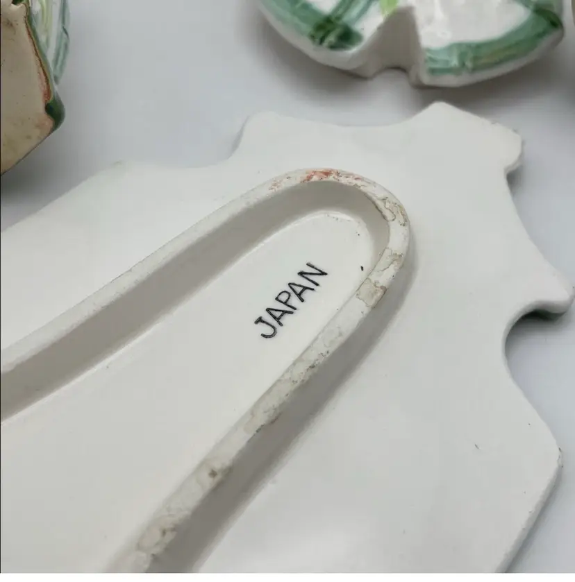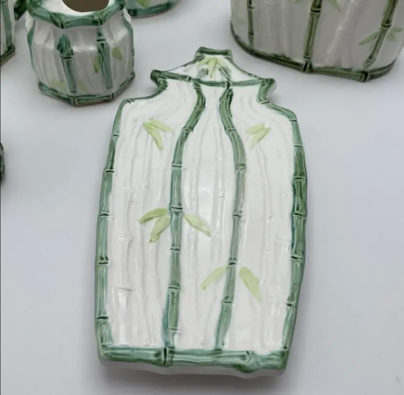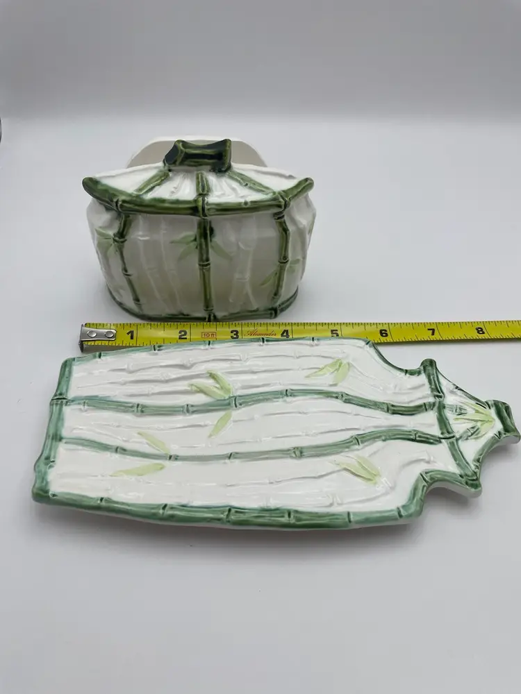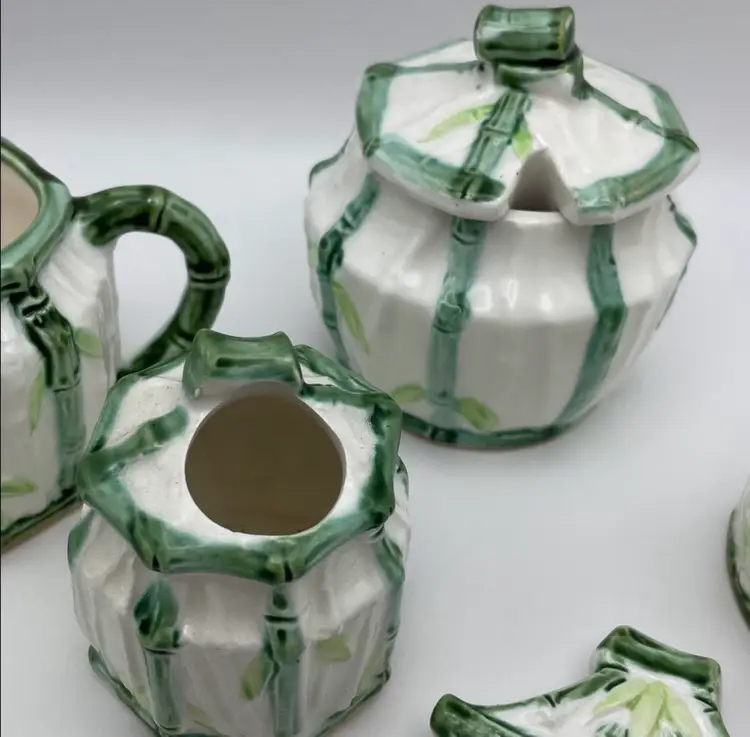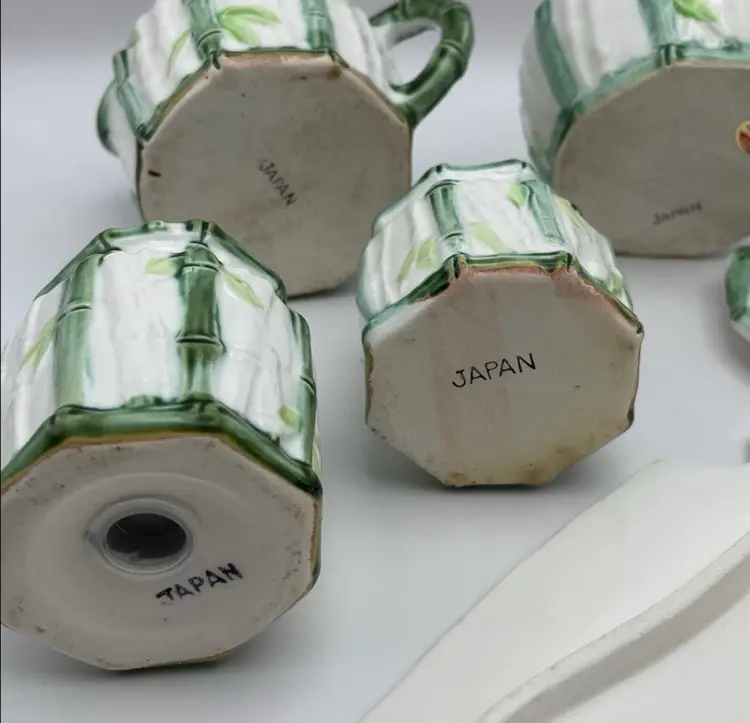 Vintage Enesco, Japanese, Green/White Bamboo Motif, Ceramic Table Serving Set includes: Napkin Holder Spoon Rest Creamer/Sugar Pepper Shaker Salt Cellar?