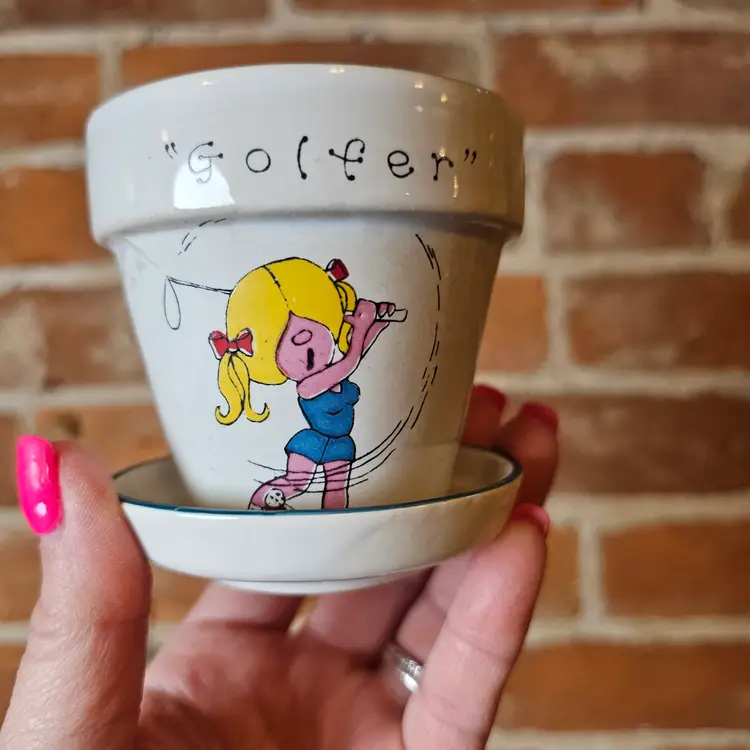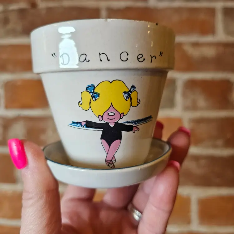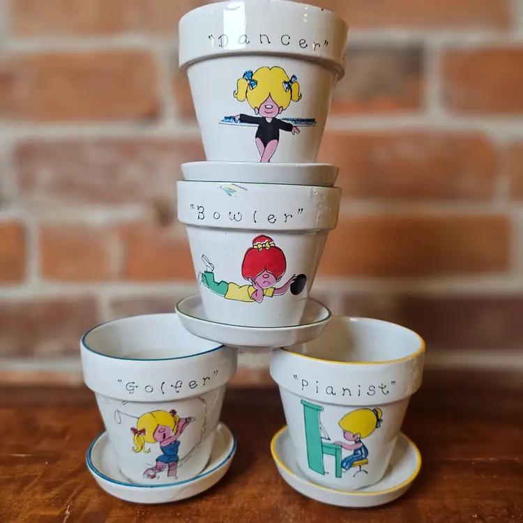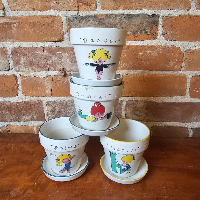 3" tall. 4 flower pots in this lot. No flaws. Some wear on this insides of the pots from use. No chips or flaws.