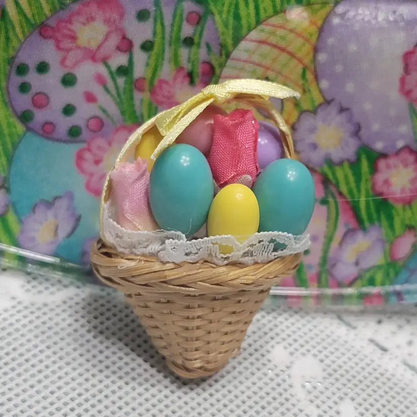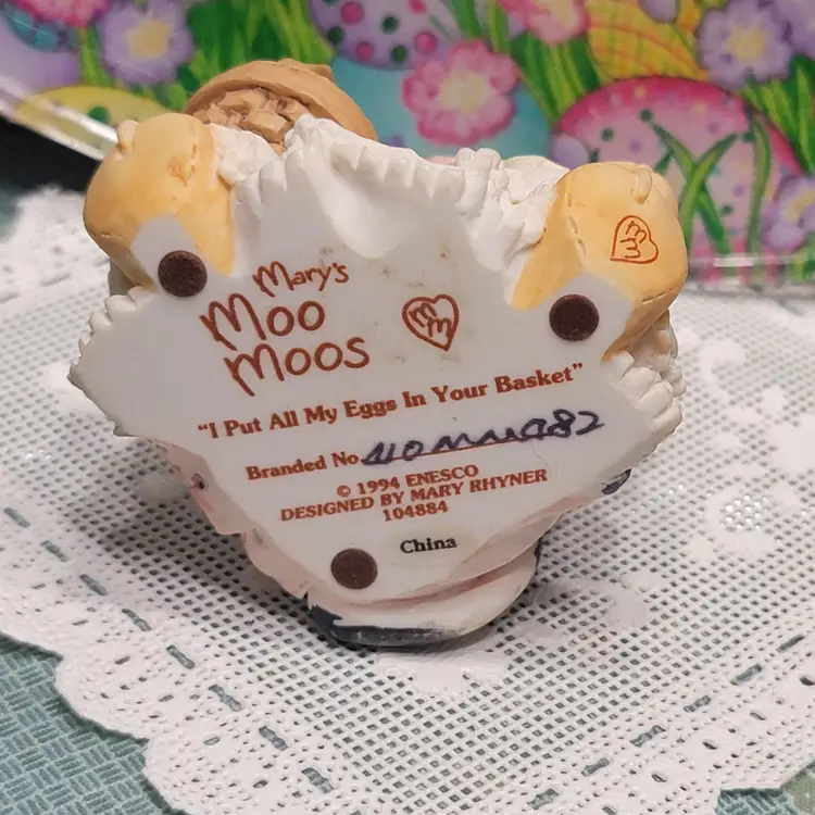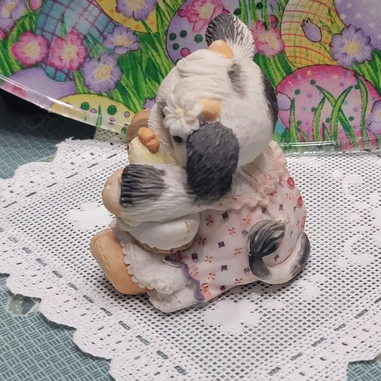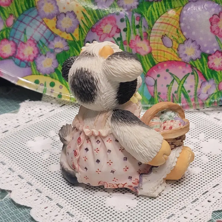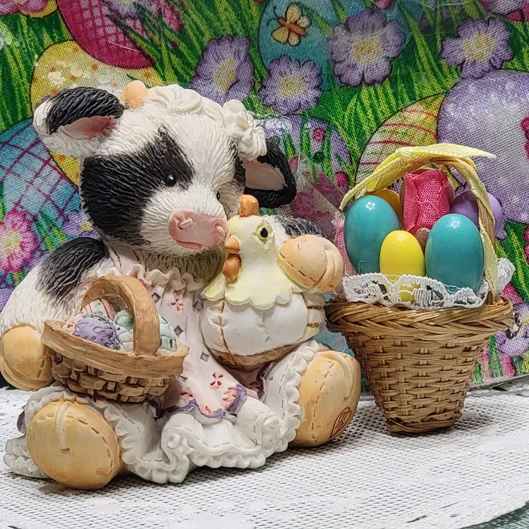 Adorable vintage Enesco figurine "I Put All My Eggs In Your Basket" featuring a charming cow and chicken duo celebrating Easter. Added with this figurine is Avon's vintage Easter basket Brooch.