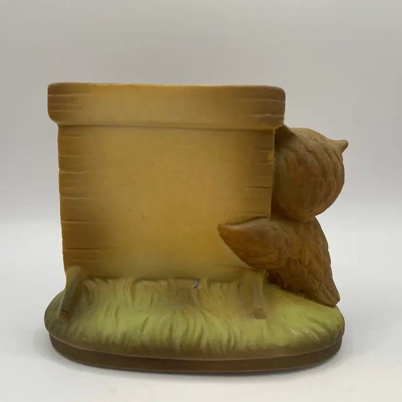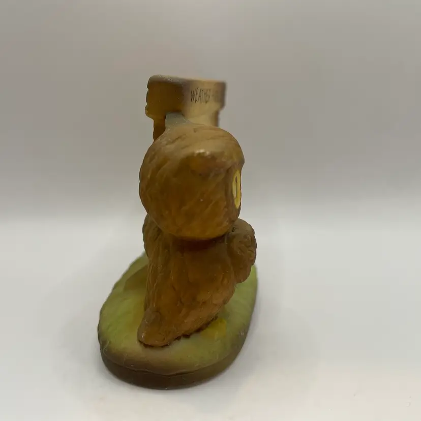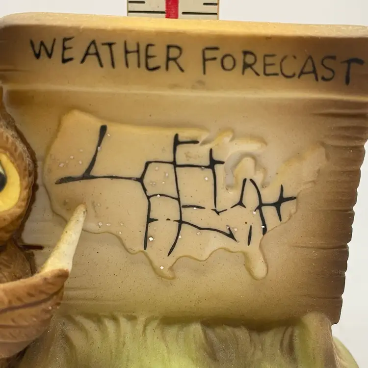 Adorable weather forecasting owl with map. Gold glitter sparkles to represent cities. So cute! A tiny bit of paint loss on it's ear and on one side below grass as seen in photos. 2.5" tall by 3" wide by 1.75" deep