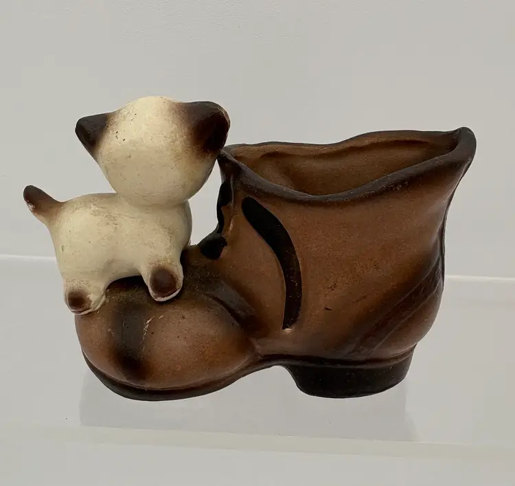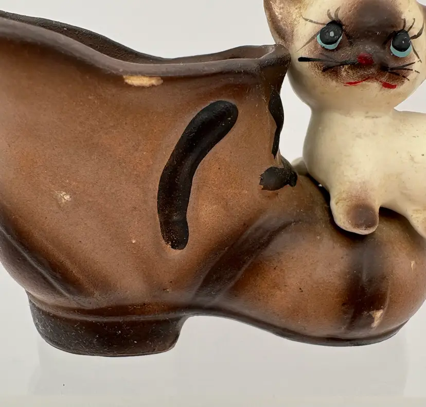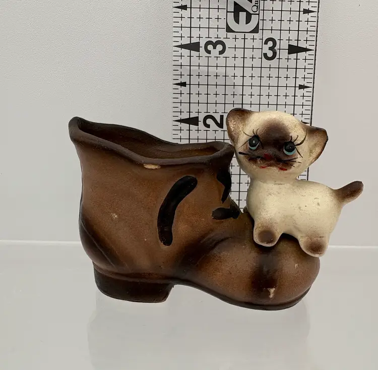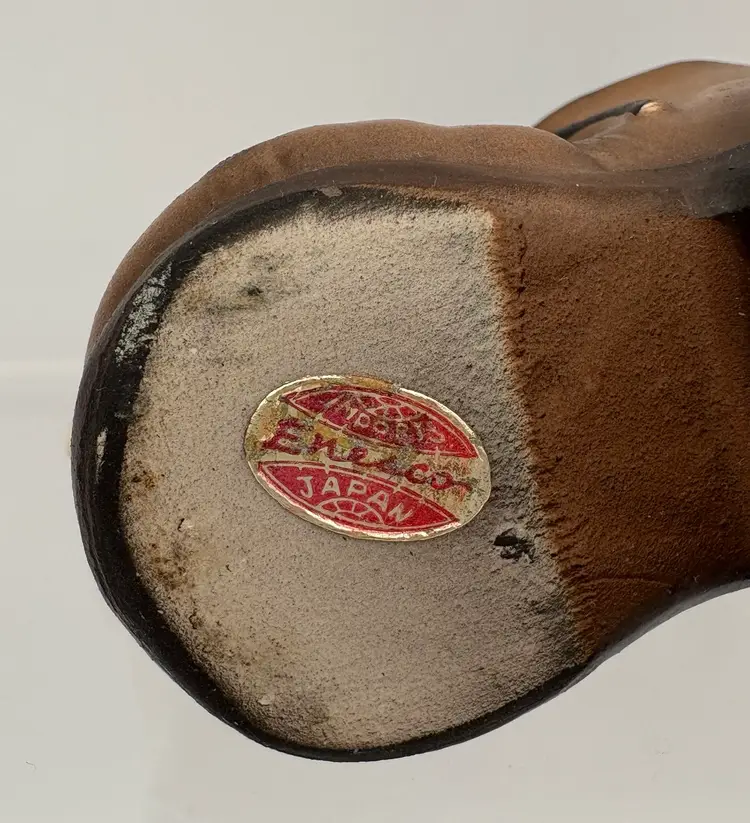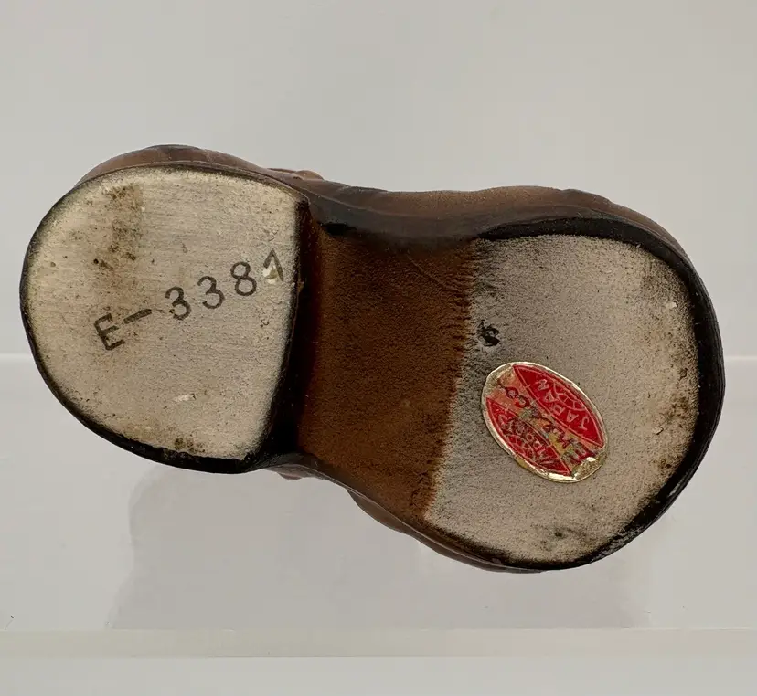 3 1/2”W x 2 1/4”H x 1 1/2”D Some rubbing on boot edges. Enesco label on bottom. Made in Japan.