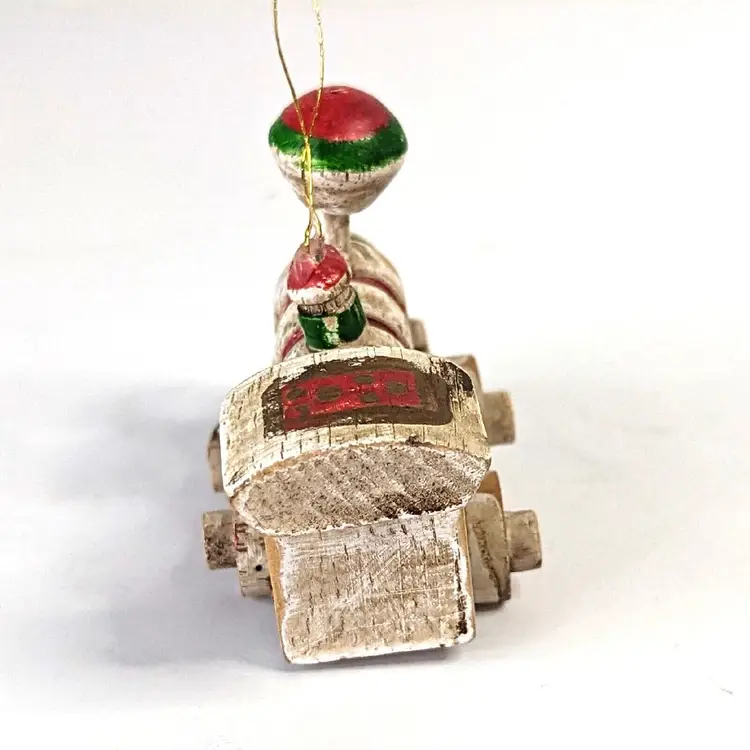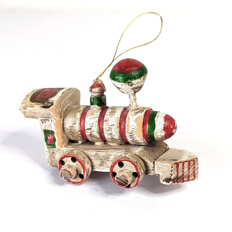 Vintage Enesco Wooden Train Steam Engine Christmas Ornament. Condition is used. One of the wheels is glued higher so leaves the train out of balance. Approximately 3.5 inches long.