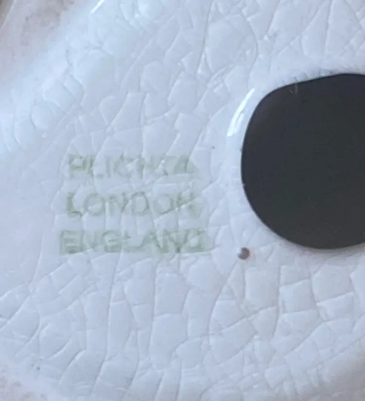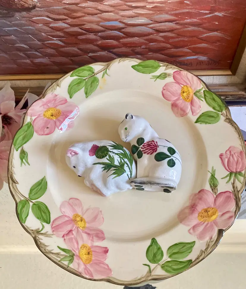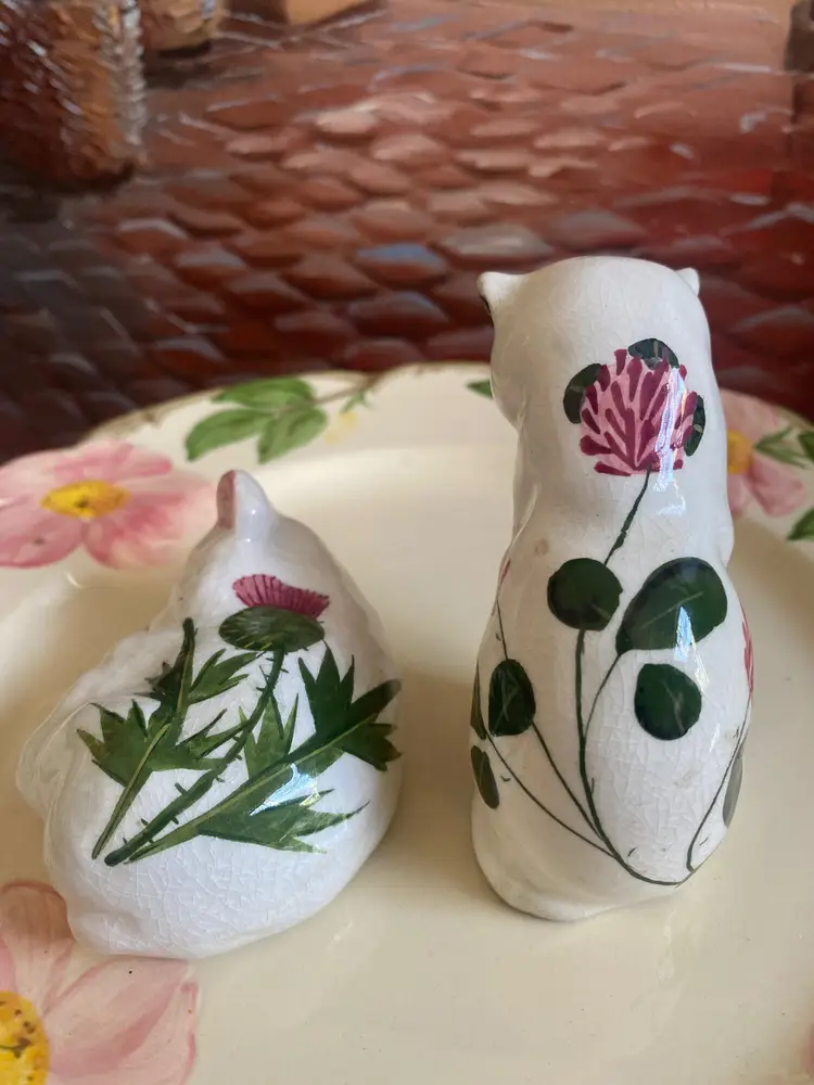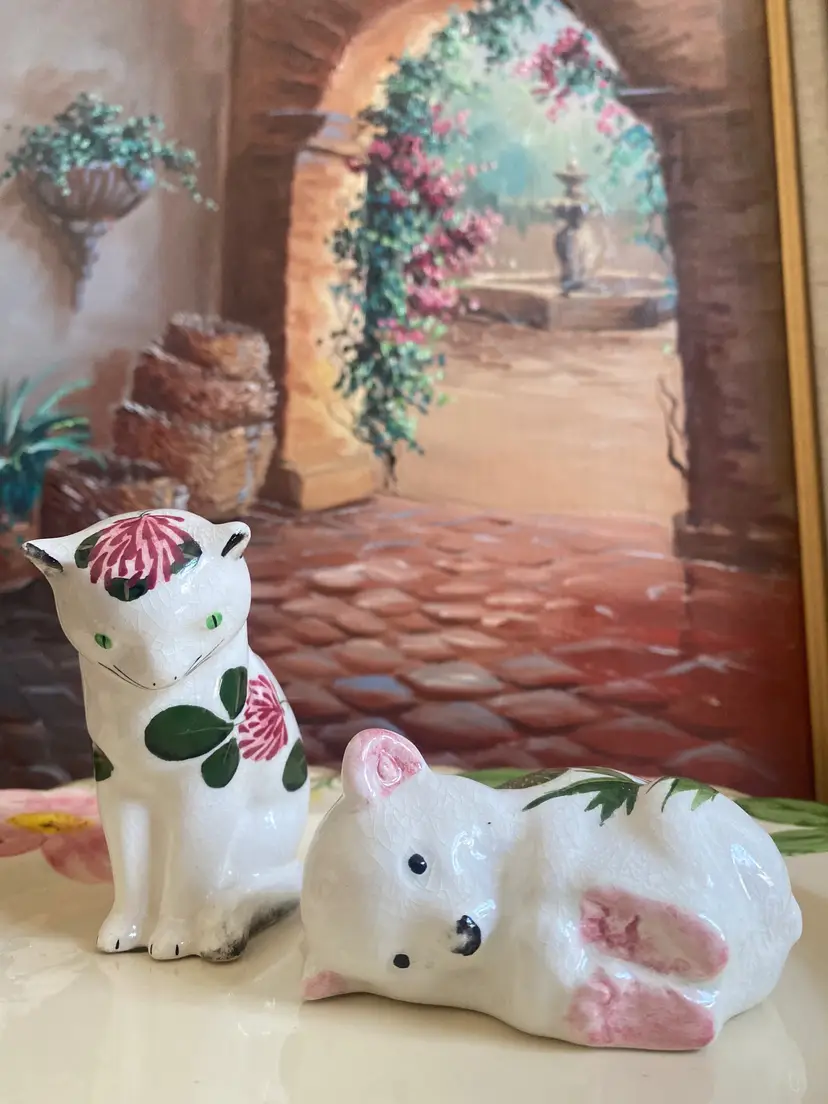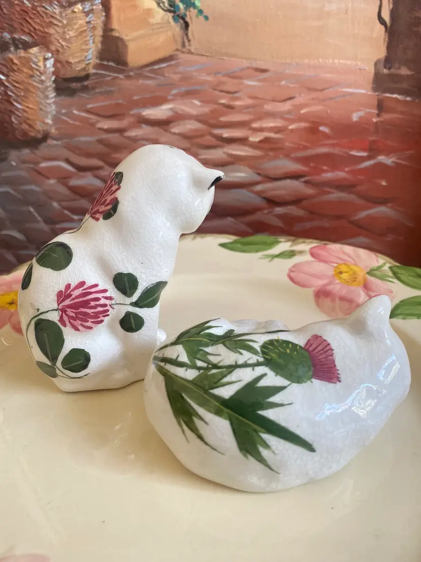 Vintage, very sweet Plichta, London England bear and cat figurines. White glazed with pink/purple thistle flowers and green leaves. This design dates back to the 1930s. Pink ears and feet. These eye catching super cute collectible Plichta Polar Bear and Cat Figurines display beautifully from every angle and would make a great addition for any Art collection. Absolutely adorable. Bear measures approximately 3.5” L x 2.5” W x 1.75” H. Cat measures approximately 3.25” L x 1.5” W x 3” H.