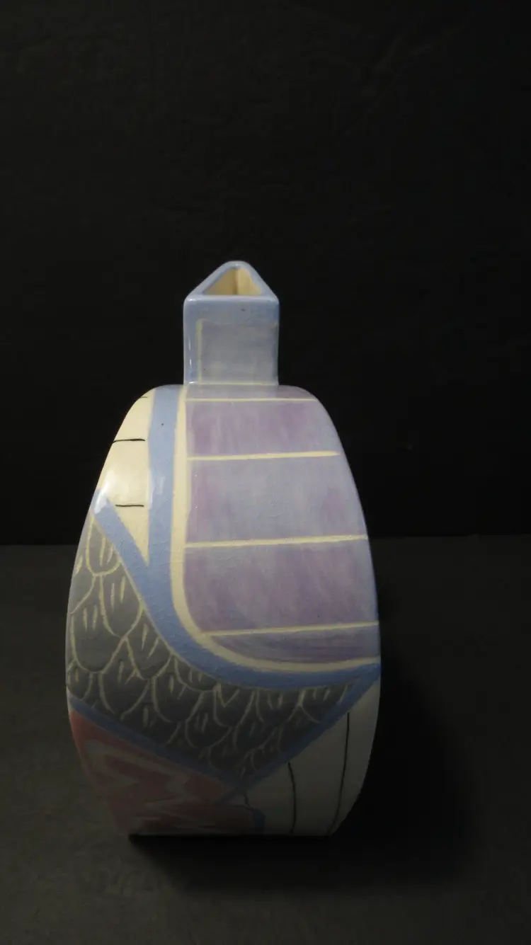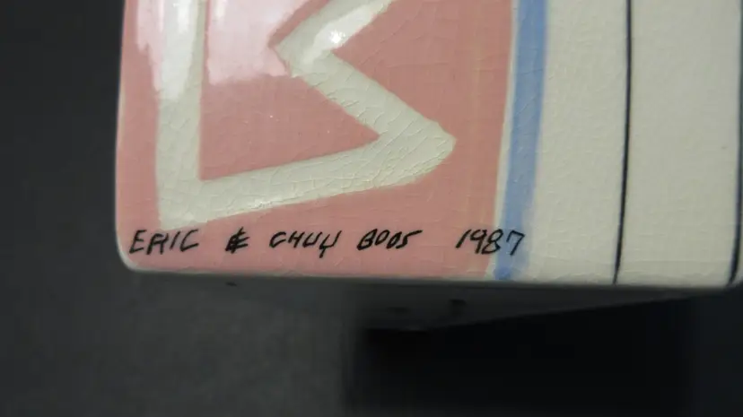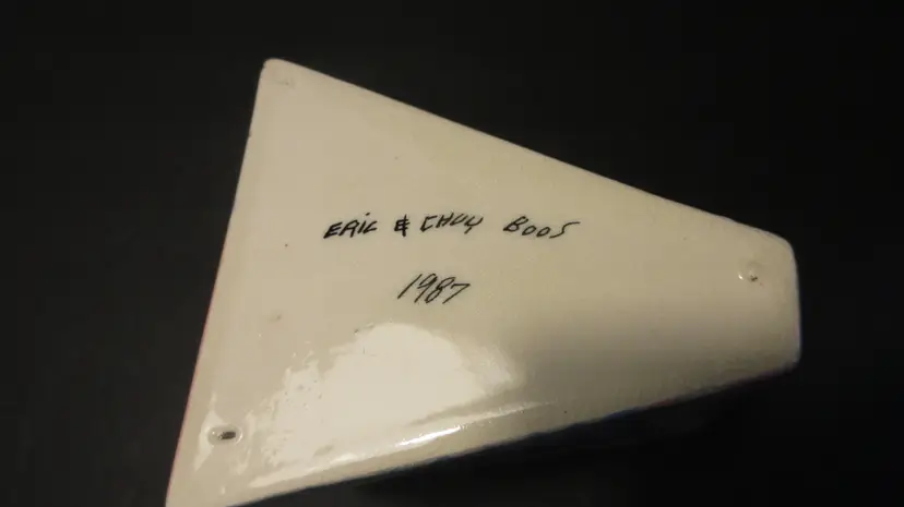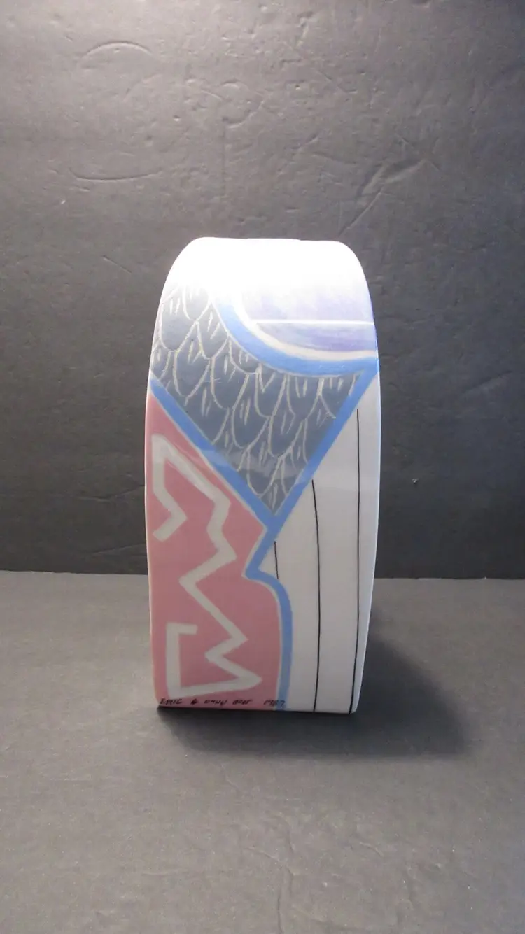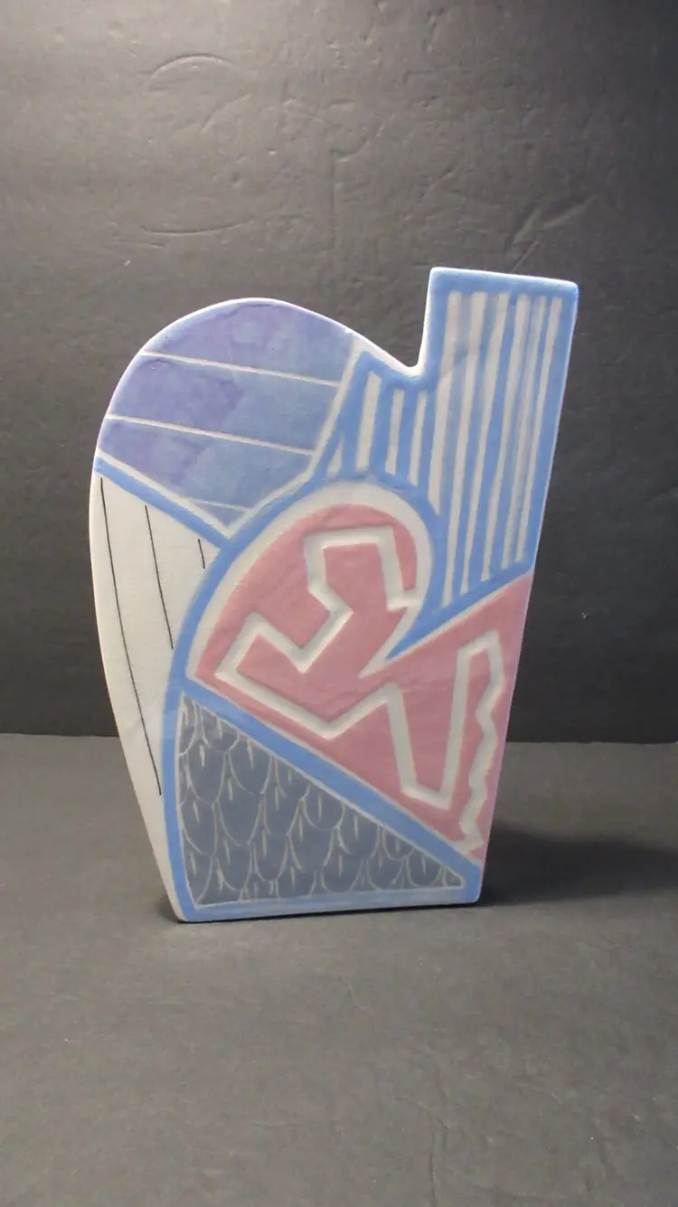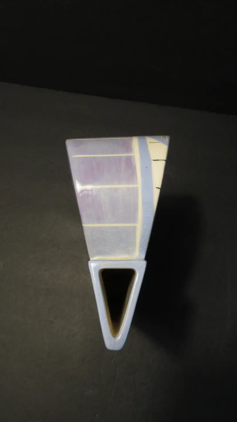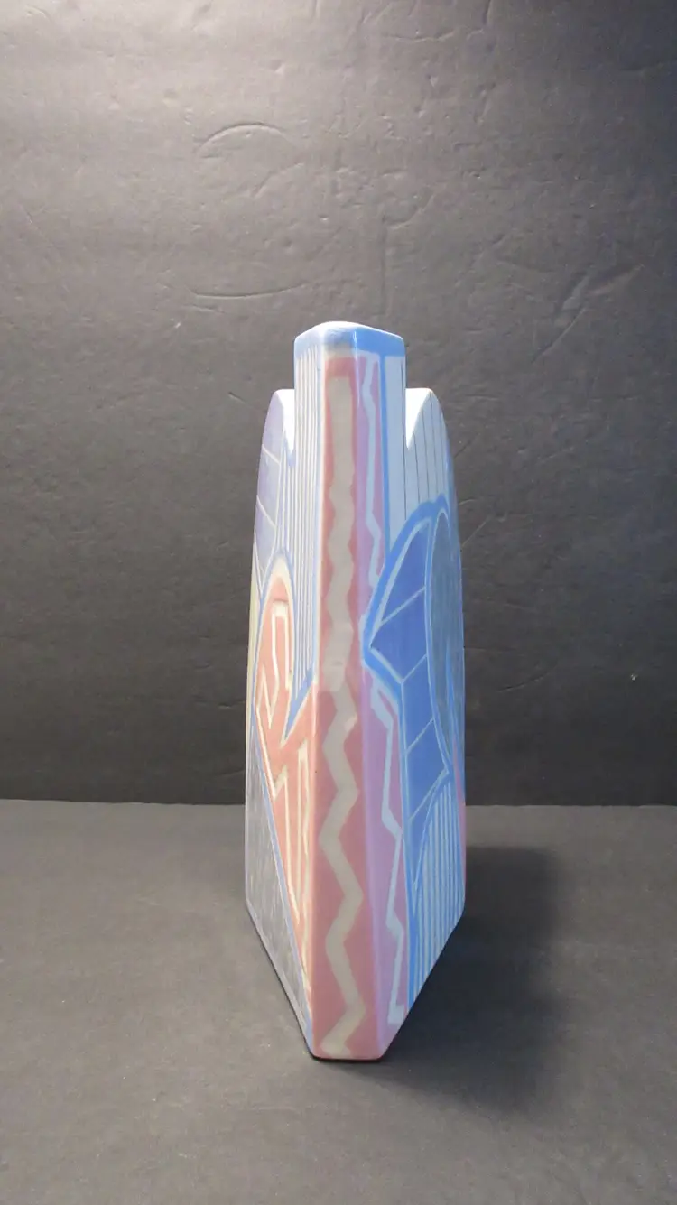 This is an AWESOME VINTAGE handmade pottery vase from Eric & Chuy Boos from 1987. The vase has a very abstract shape that was super popular in the 1980s and 1990s. It is painted in GLORIOUS 1980s pastel colors of blue, purple, pink, and gray. It is wedge shaped, so it is much wider at the back than at the front. It is perfect for a few long-stemmed flowers or some dried fronds. It's also perfect as-is for display. This vase is 9.5 inches tall and 6 inches long. The width at the back is 4 inches, but this diminishes at the front to just about 1 inch. This vase is signed and dated on the bottom and on the back near the base. It is in EXCELLENT VINTAGE CONDITION! There are no cracks, chips, nicks, stains or discoloration. However, there is lots of crazing.