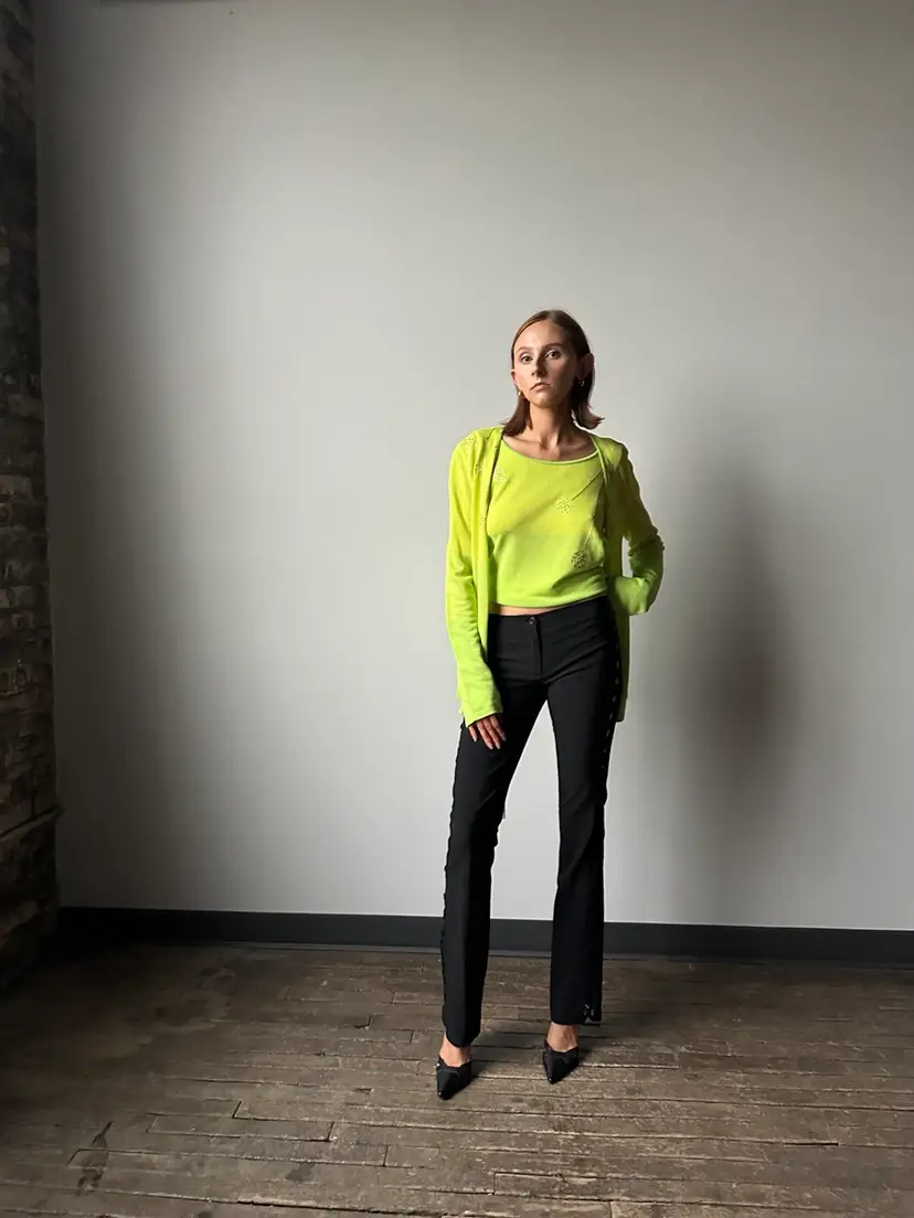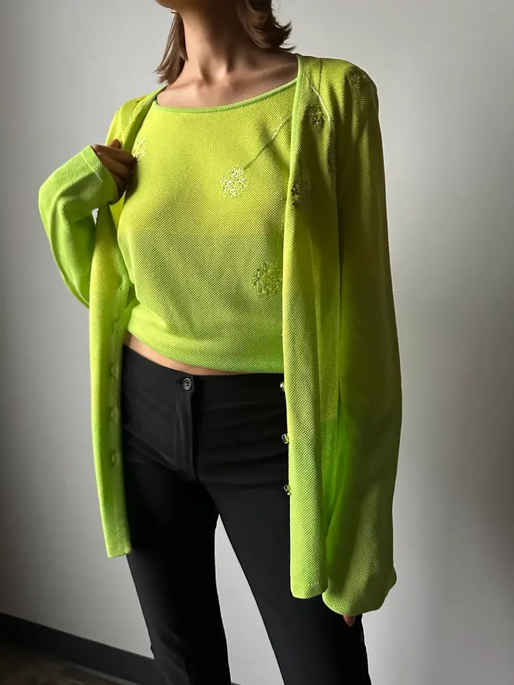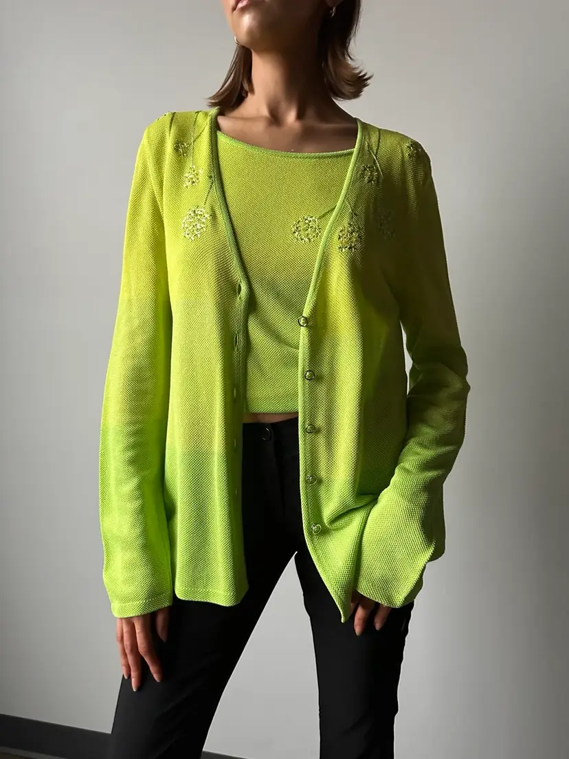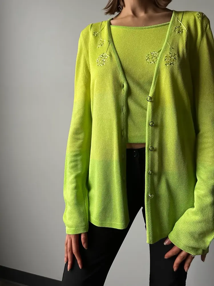 This neon bright green matching cardigan and tank is the perfect way to add a pop of color to your wardrobe.