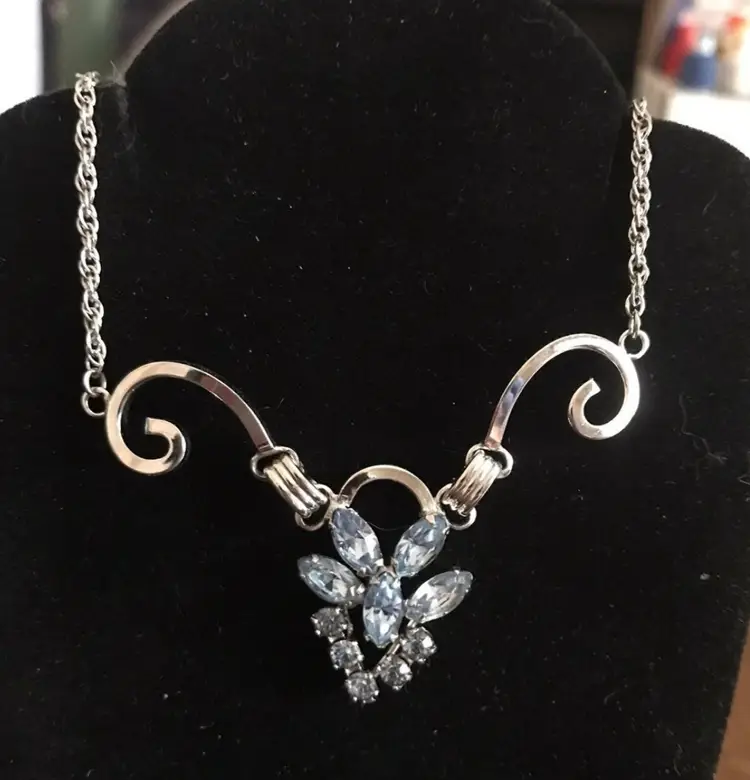 Sterling silver choker withe blue rhinestones. Signed Espoflex and Sterling on the back. 16 inch long sterling rope chain with spring ring clasp.