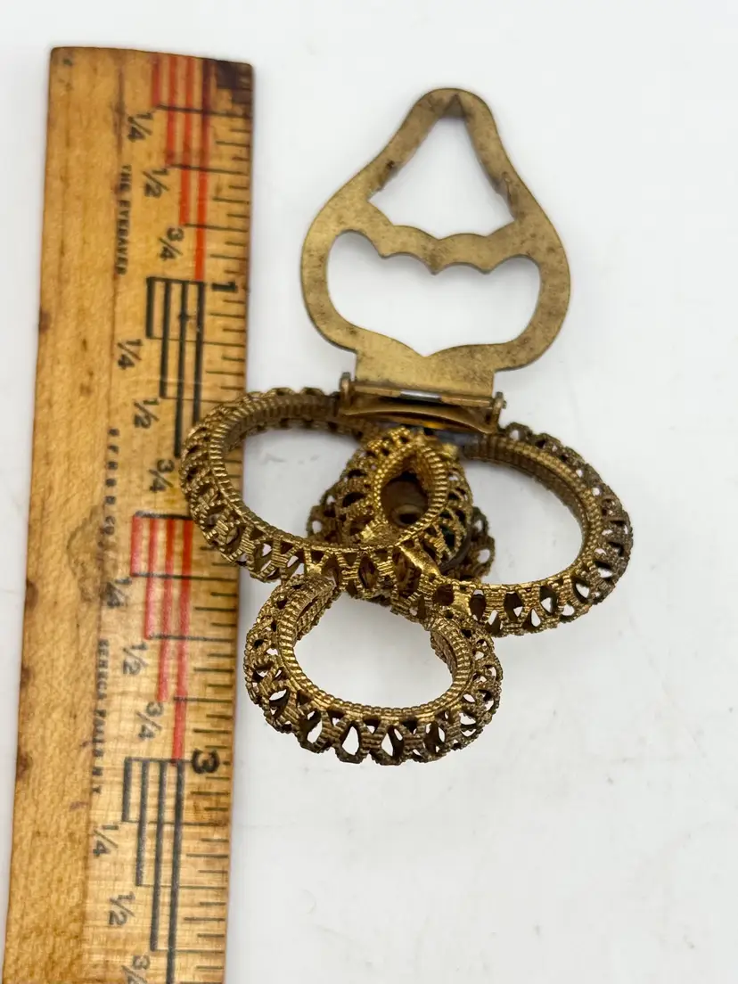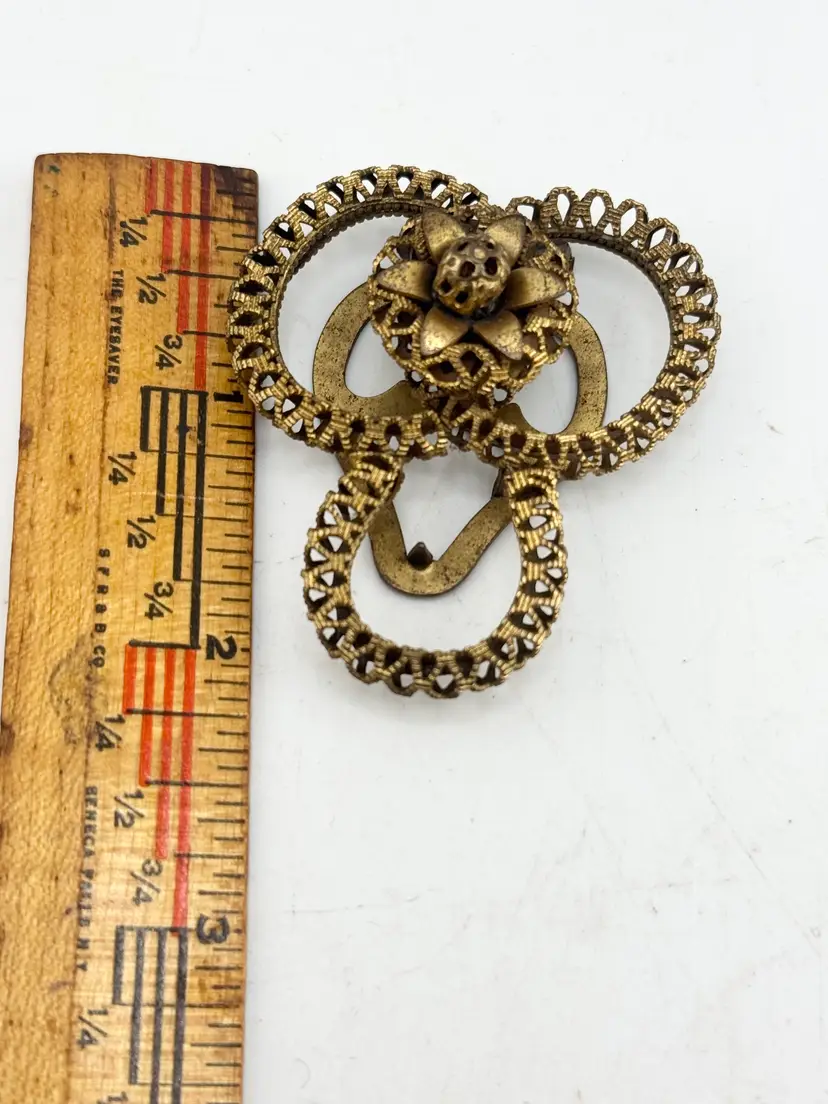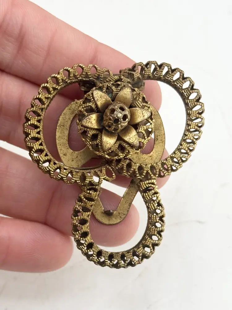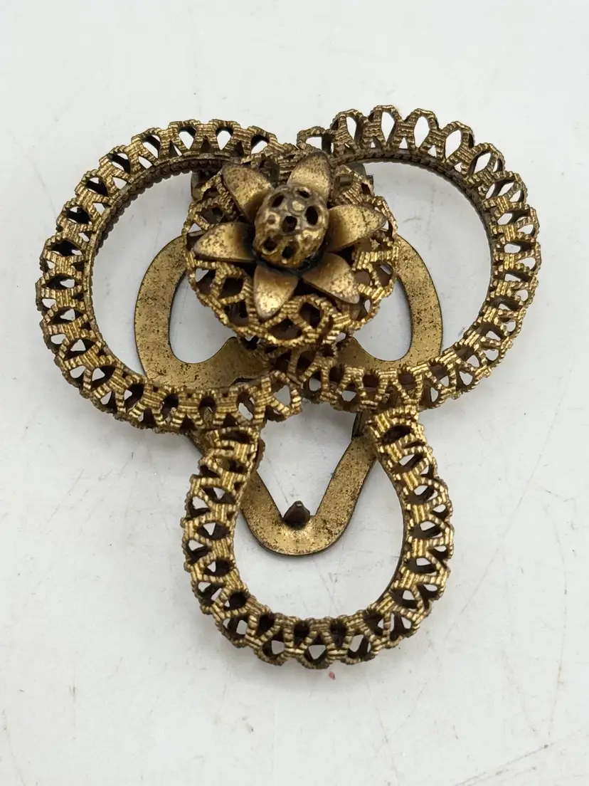 Vintage estate filigree flower dress clip. Vintage Estate dress clip with filigree and flower design. Gold tone. MN52GH.