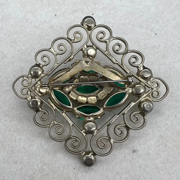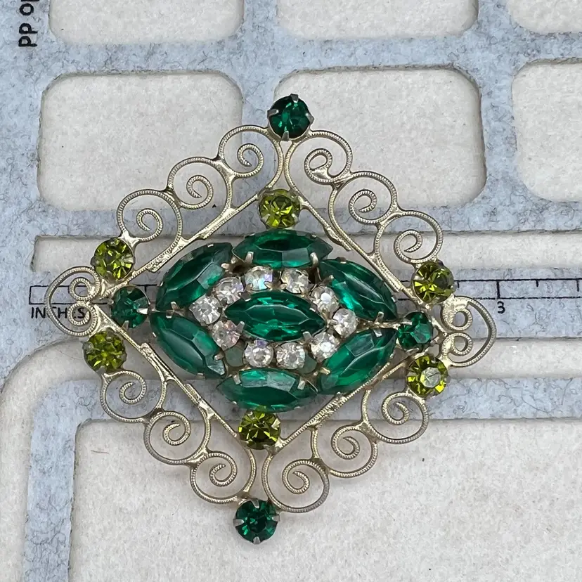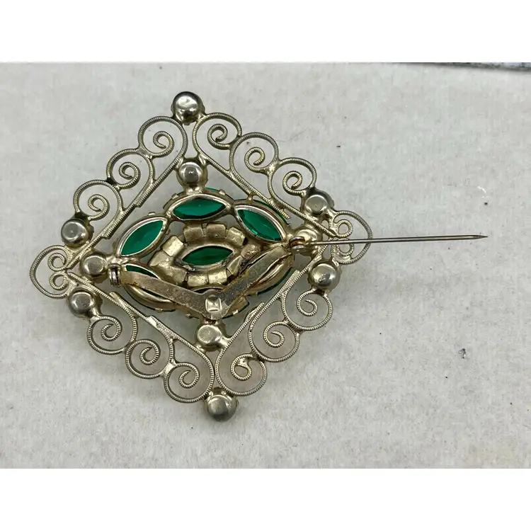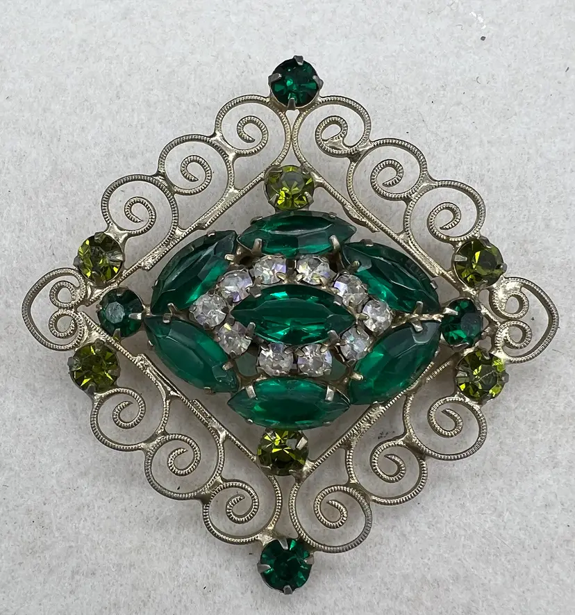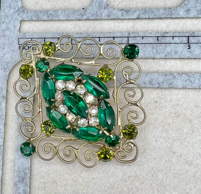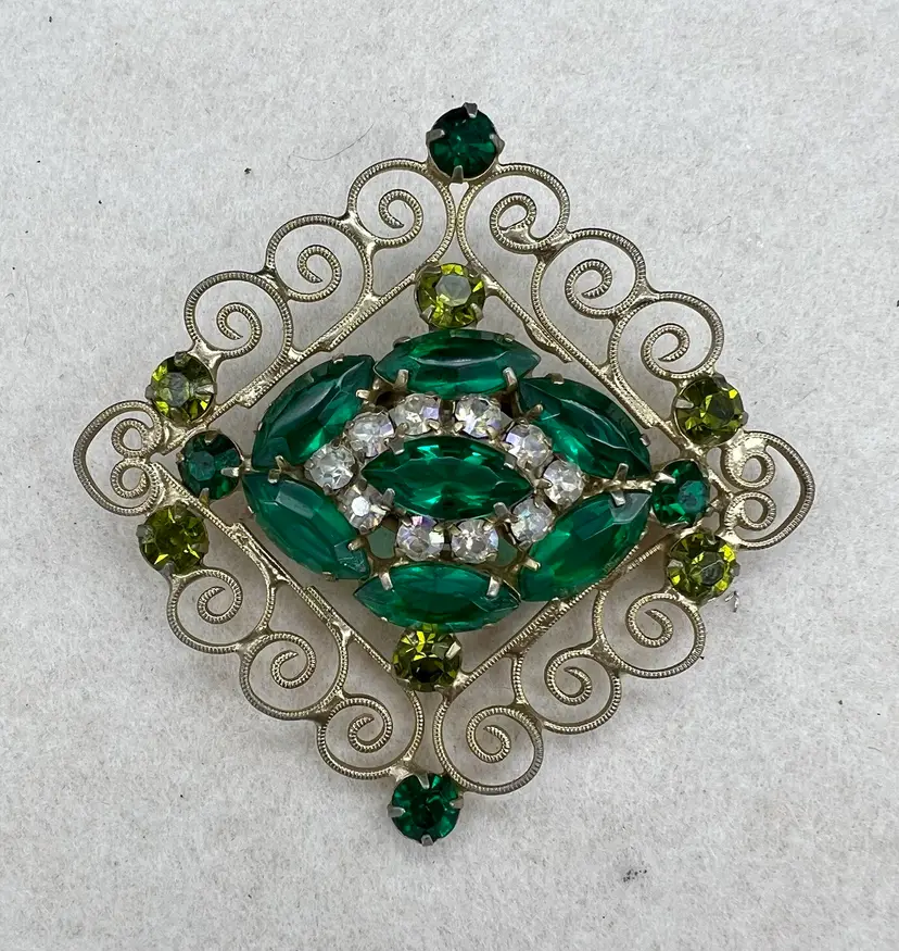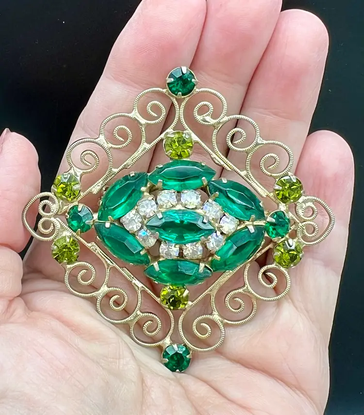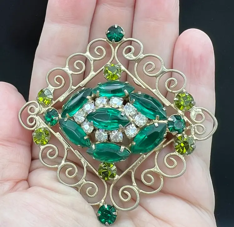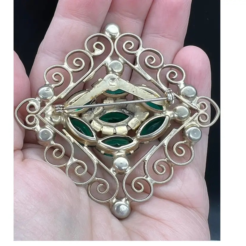 Statement estate sale Emerald Green Rhinestone Brooch Gold Metal Heart Scroll Design. 3 inches. Vintage 1960s