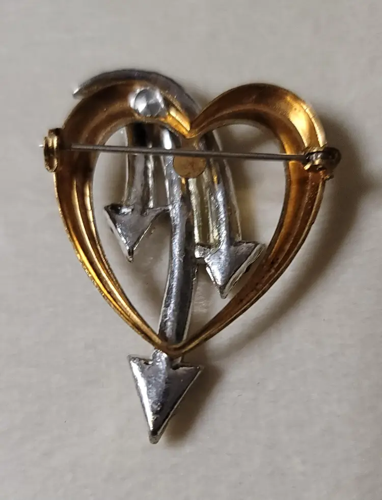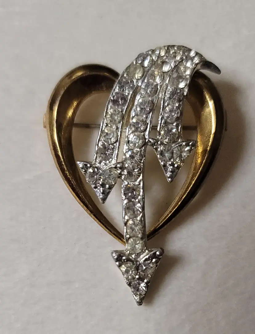 Vintage estate two tone heart w/ rhinestone arrows brooch pin. Gold toned heart shape and silver arrows with rhinestones. Dimension: 2 in by 1 1/4 in