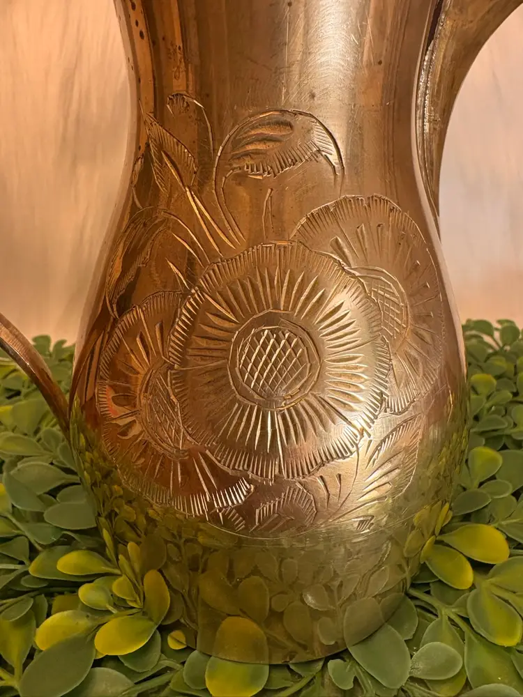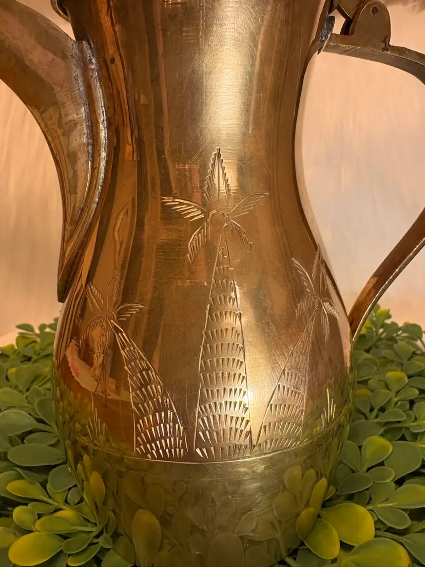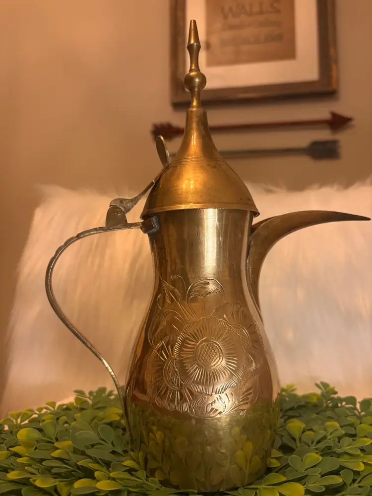 Vintage Etched Brass Dallah Traditional Arabic Coffee Pot 11.5” tall, very detailed