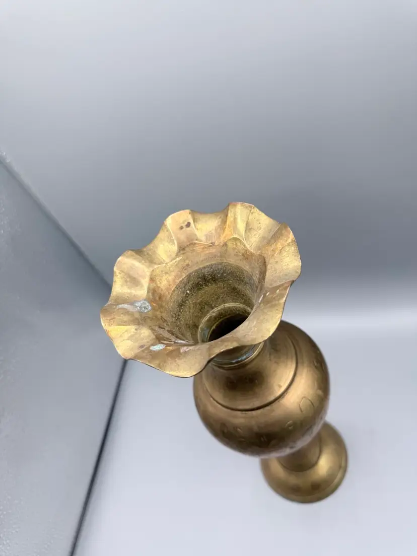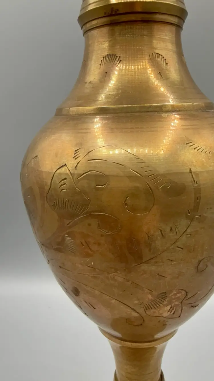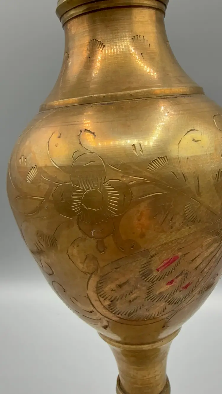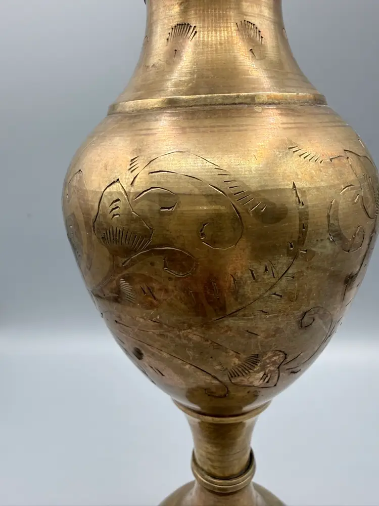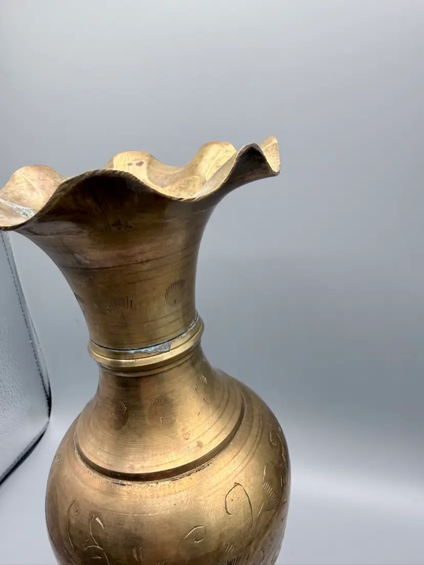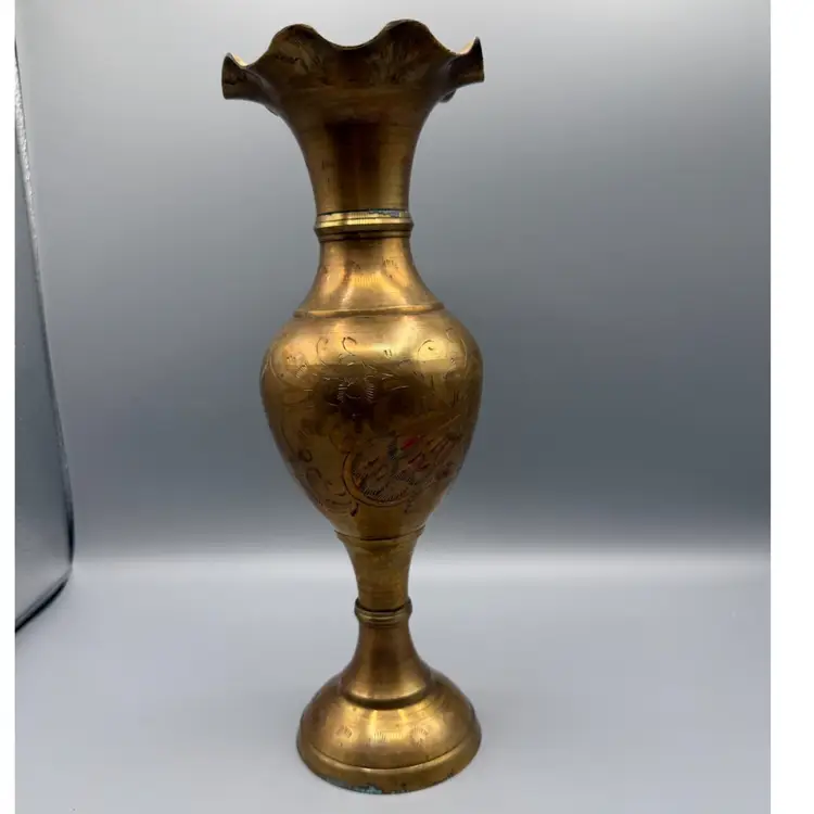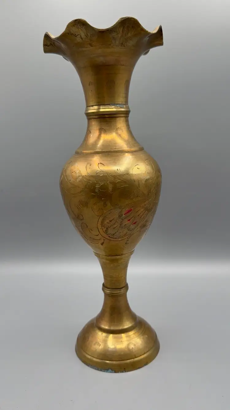 Features a classic, ornate design with a bulbous body and a tall, narrow neck that flares into a ruffled or scalloped rim. The entire surface is adorned with intricate, hand-etched floral, leaf. At one time may have been accented with black or gold finishes in the recesses, shows remnant of red paint.