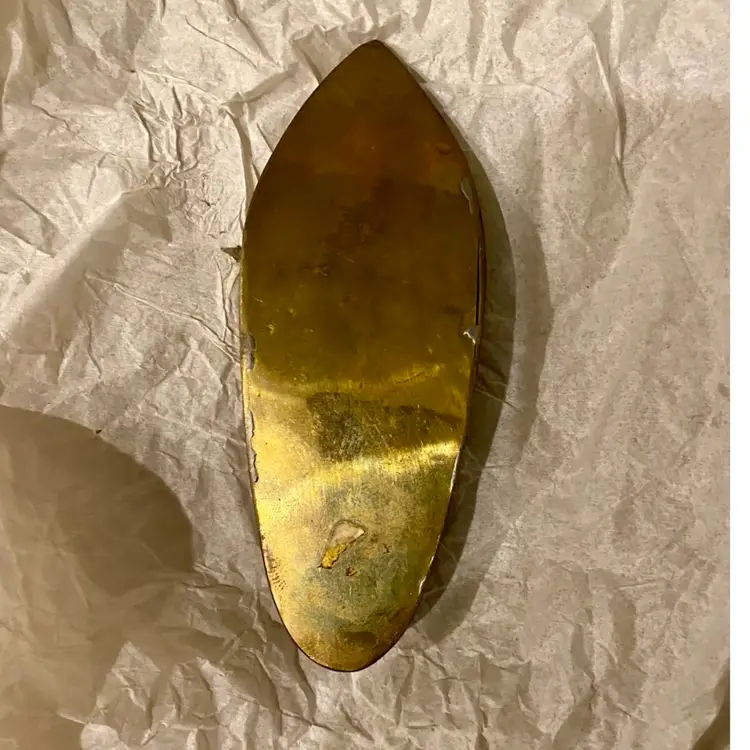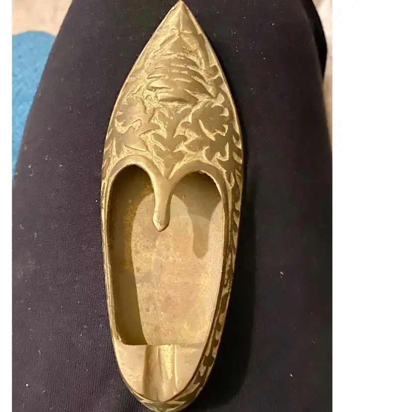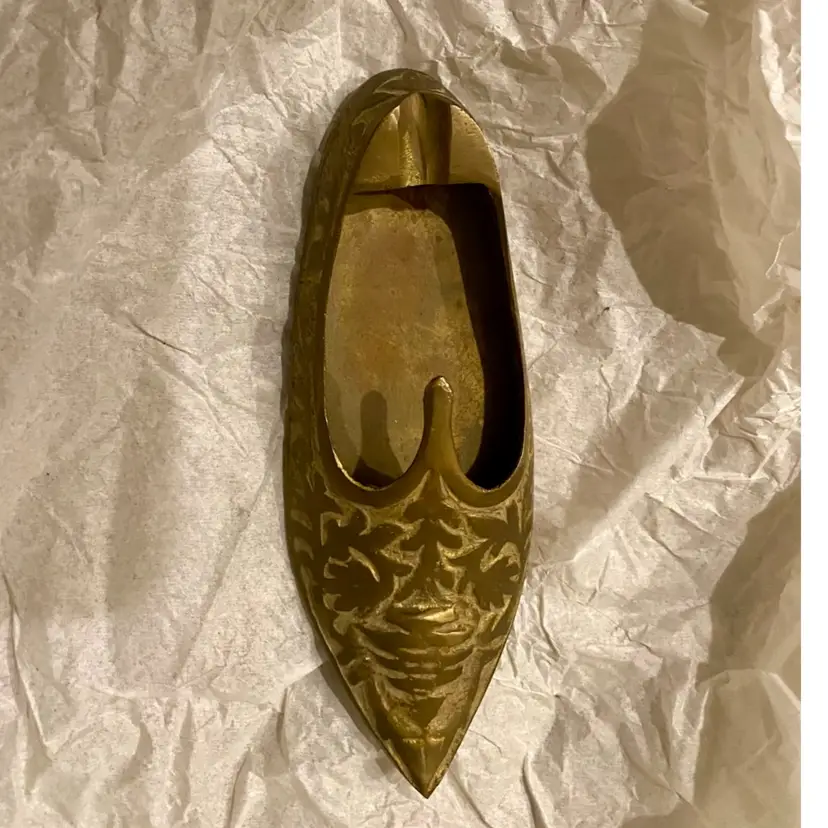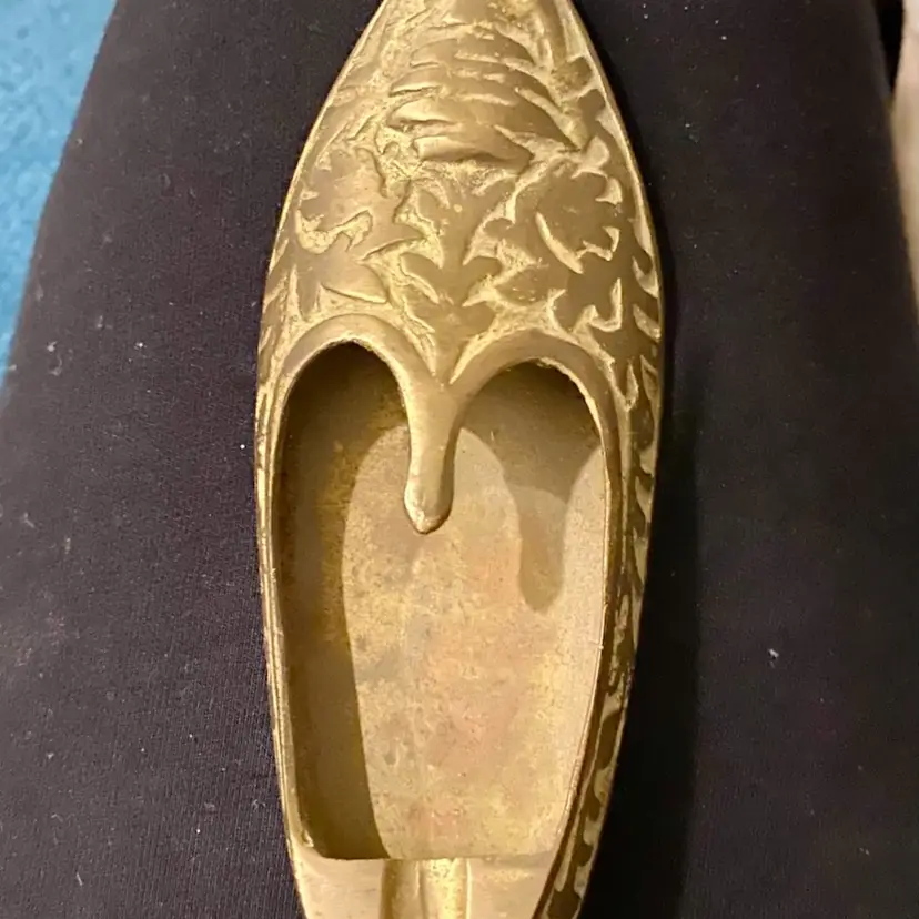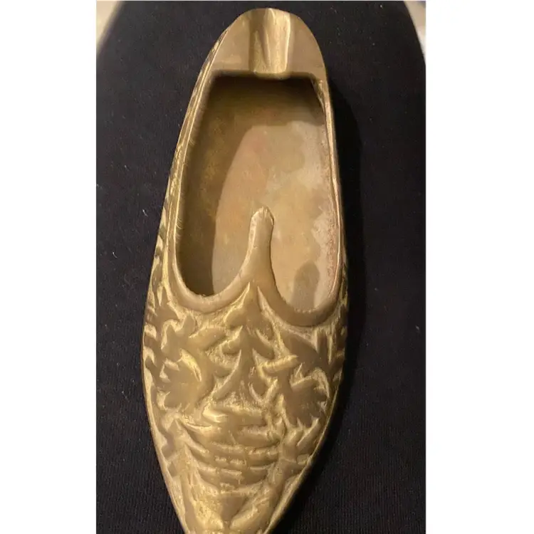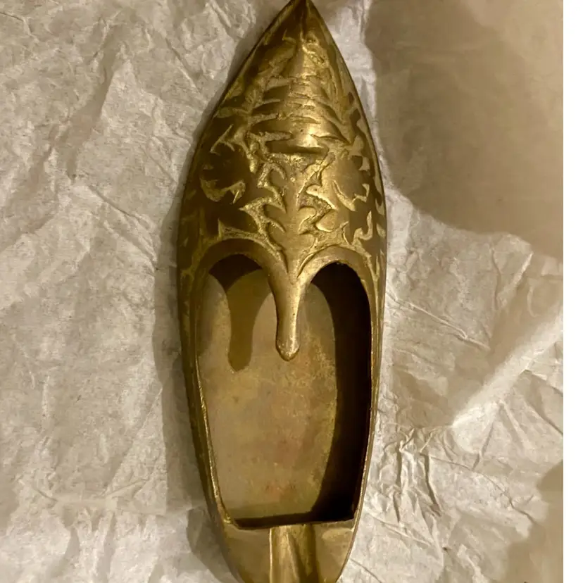 What a cool conversation piece! This is a beautiful ETCHED BRASS SLIPPER ASHTRAY, ALSO CALLED AN ALADDIN SHOE ASHTRAY. It is an Indian design, likely from the mid-20th century. It measures a little over 5” long and 2” wide. This will be a very unique addition to any home!