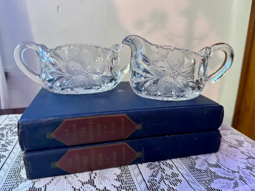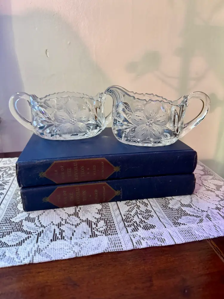 Add a touch of vintage refinement to your table with this etched glass creamer and sugar bowl duo. Featuring ornate floral and leaf patterns, scalloped edges, and graceful handles, this set is perfect for tea service, shelf styling, or bridal decor. The clear glass catches light beautifully, making it a versatile accent for any season. Excellent vintage condition; no chips or cracks.