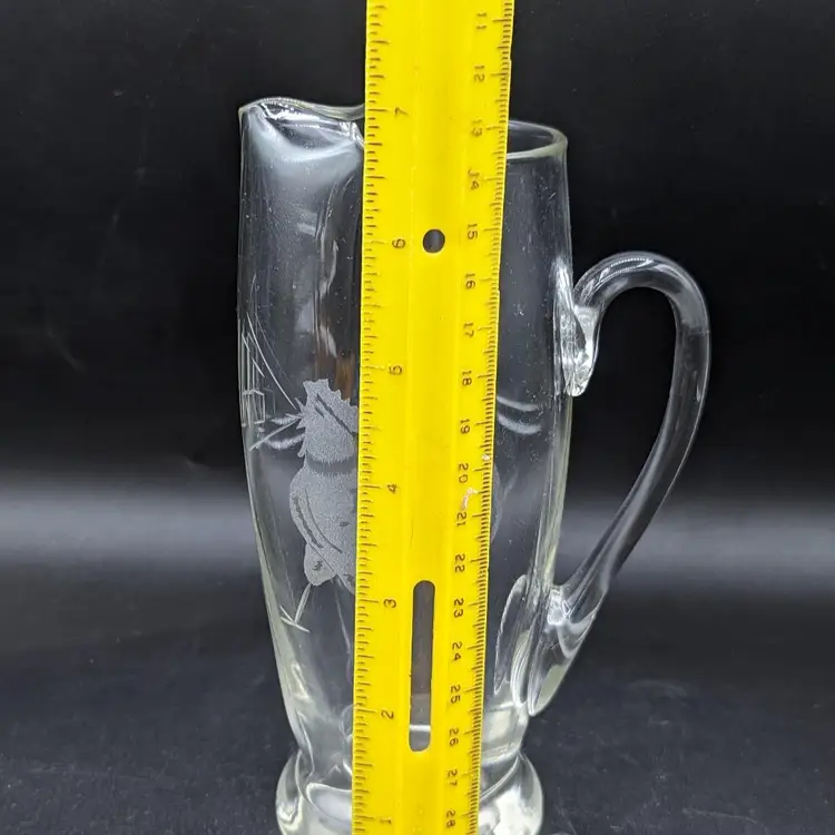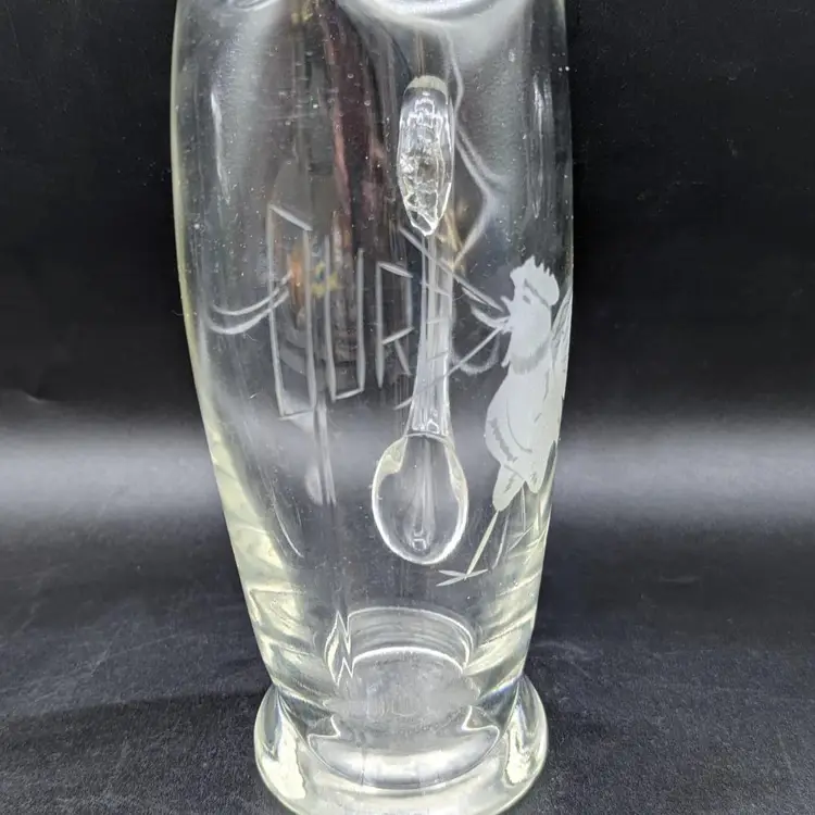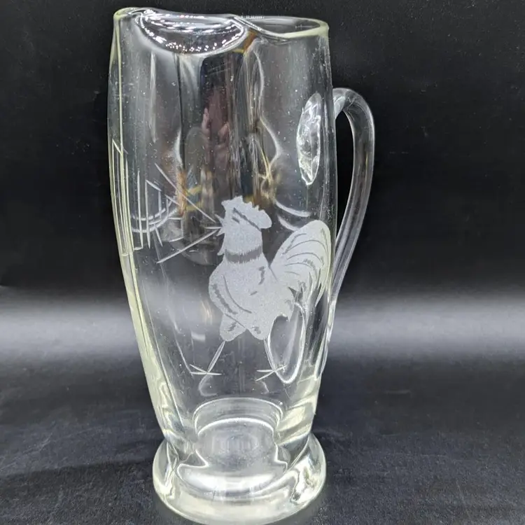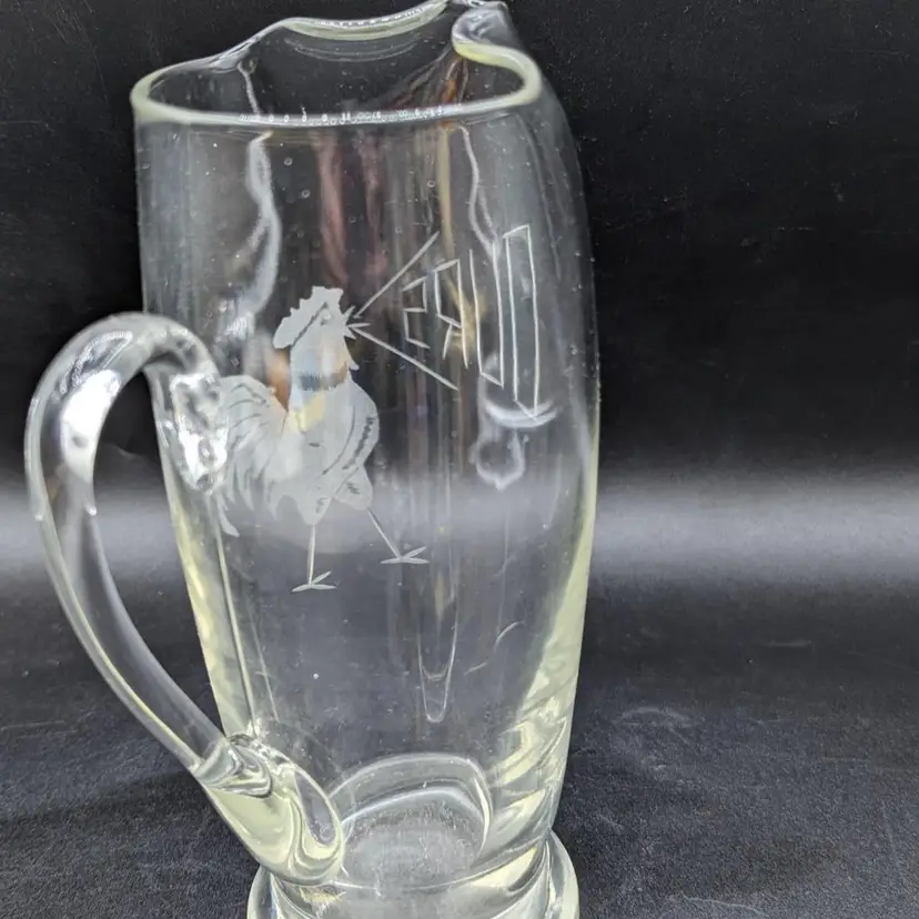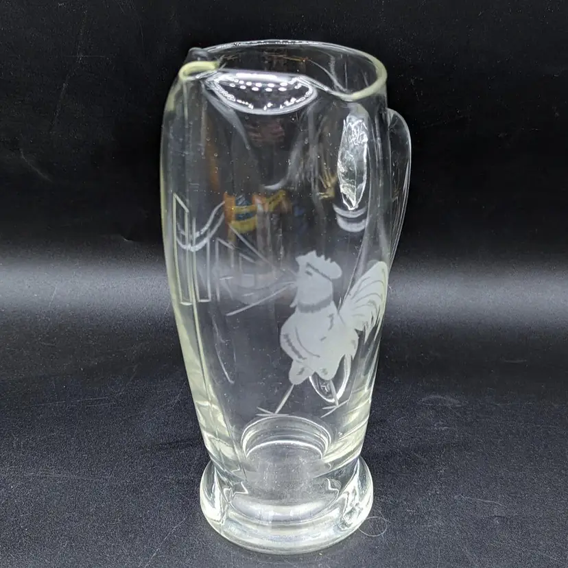 Vintage Etched Glass Martini Pitcher Mid Century Elegant Barware. image is of a rooster crowing in the word "ours"