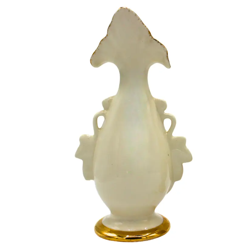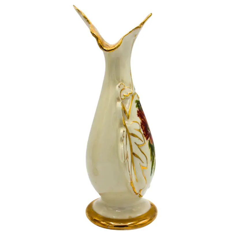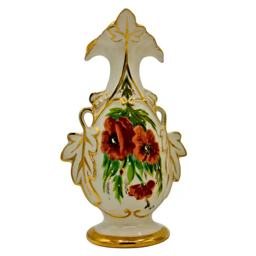 Vintage hand-painted porcelain vase Ornate leaf-like handles Porcelain / China / Ceramic Ornate Victorian Style Marked: Hand Painted Eton China Design: Rich, varying colors of red motif with green leaves, gold accent trim