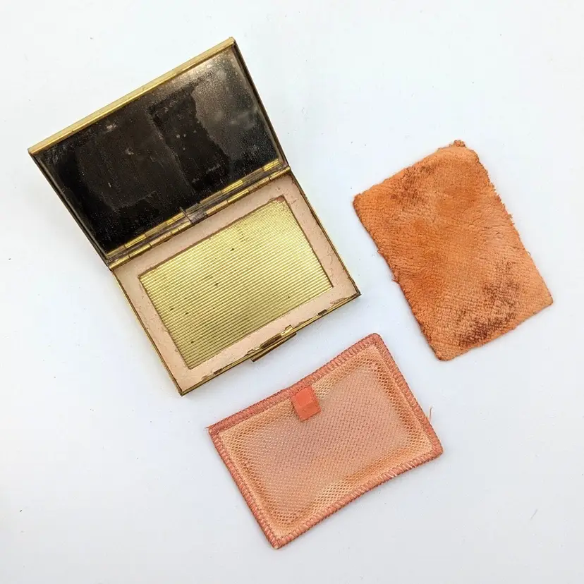Good condition for its age. Some wear and scratches on outside of case. The mirror is intact but has some tarnish. The powder puff and screen are present but they are used. Basically normal wear for age and use. Please see all photos.