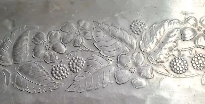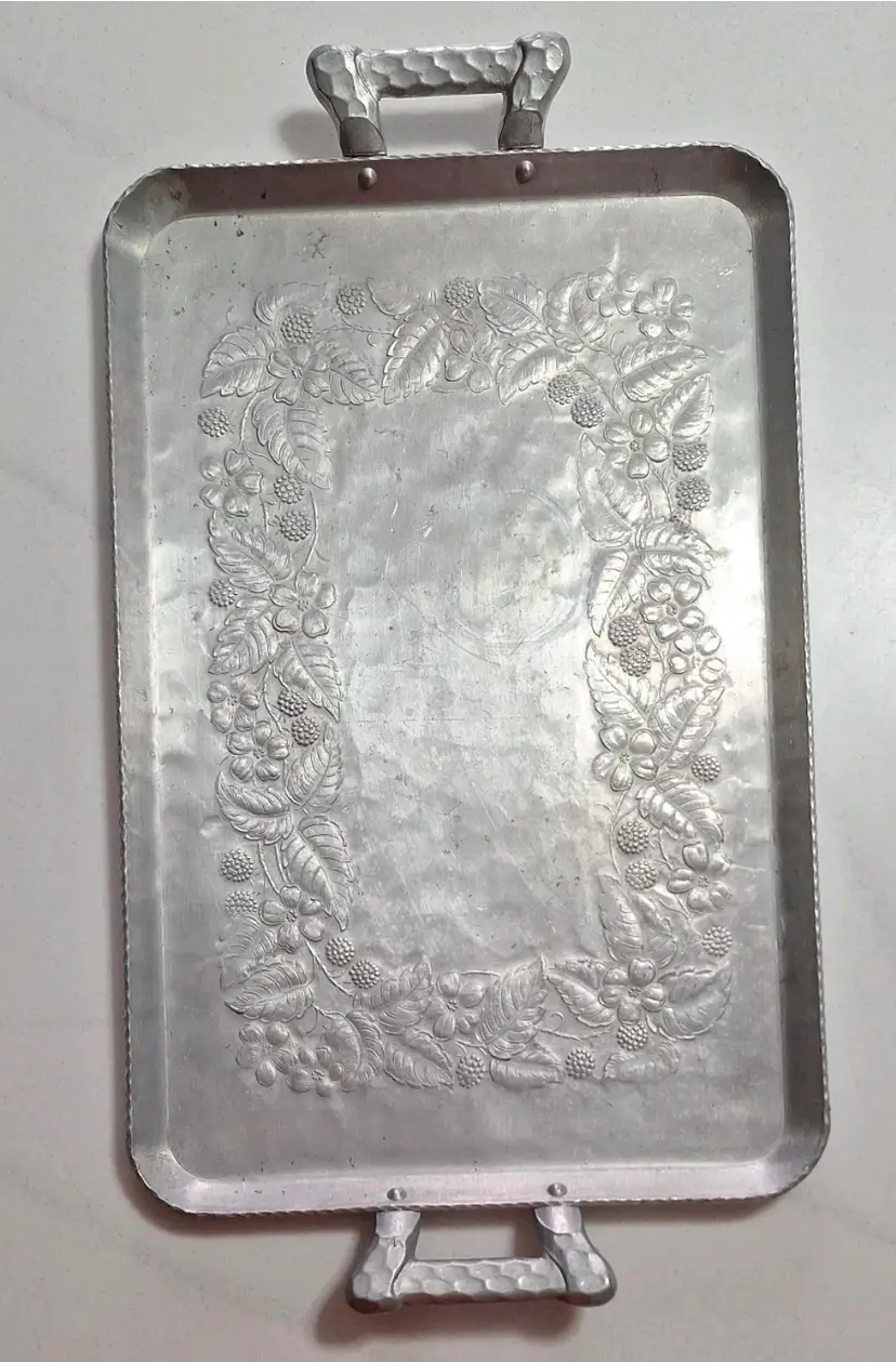 This vintage Everlast forged aluminum serving tray features a charming floral and berry pattern, showcasing its handmade craftsmanship. Made in the United States, this tray is a unique piece of metalware collectible. The durable aluminum material ensures longevity, making it a practical and decorative item for serving or display purposes. The intricate design adds a touch of vintage charm to any home decor setting.