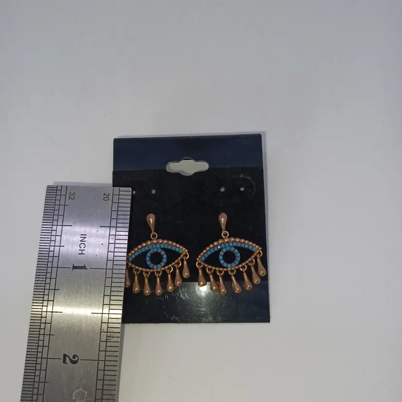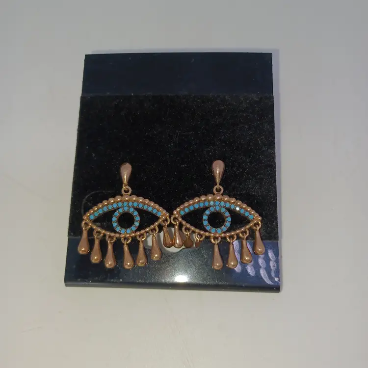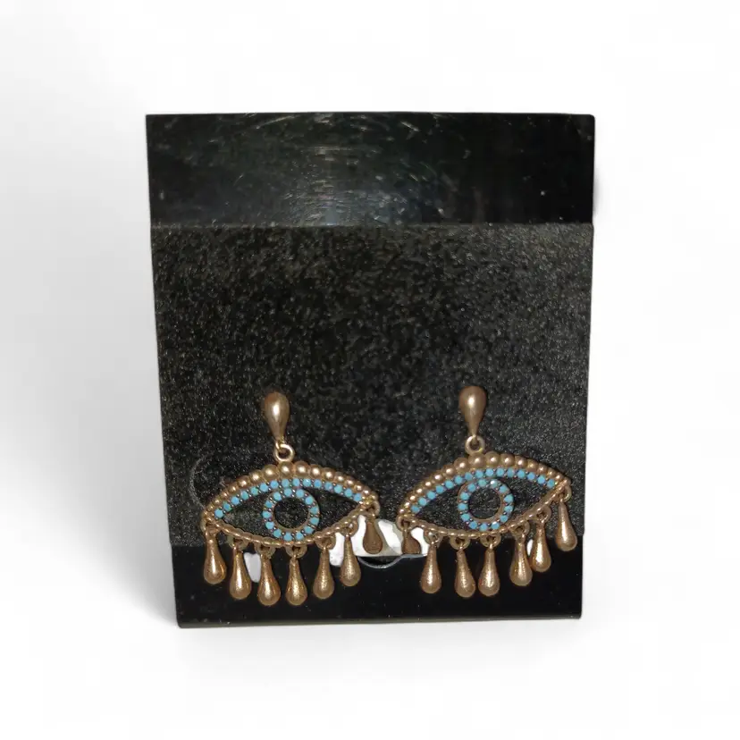 Vintage evil eye dangle earrings turquoise colored stones with little teardrop dangles measures approximately 1 1/2 in tall gold tone metal (possibly gold filled no markings) please see all pictures as they are the best description all items from a smoke-free home with pets experienced fragile shipper