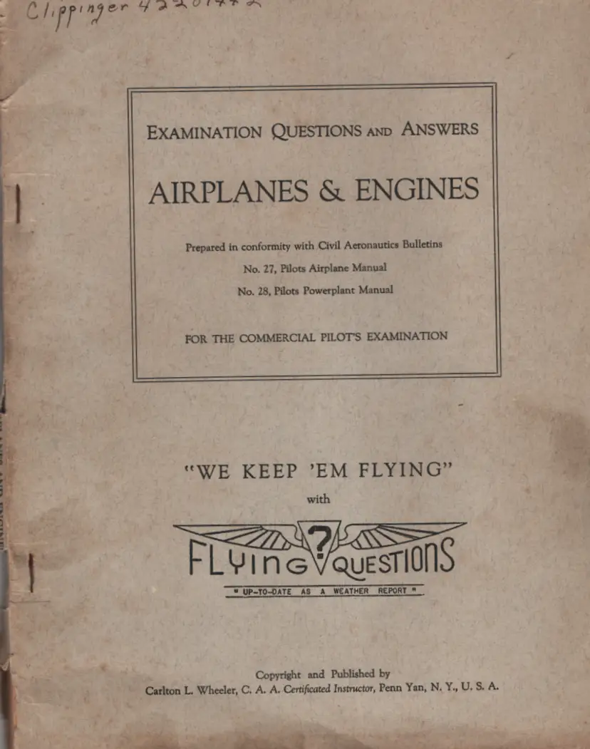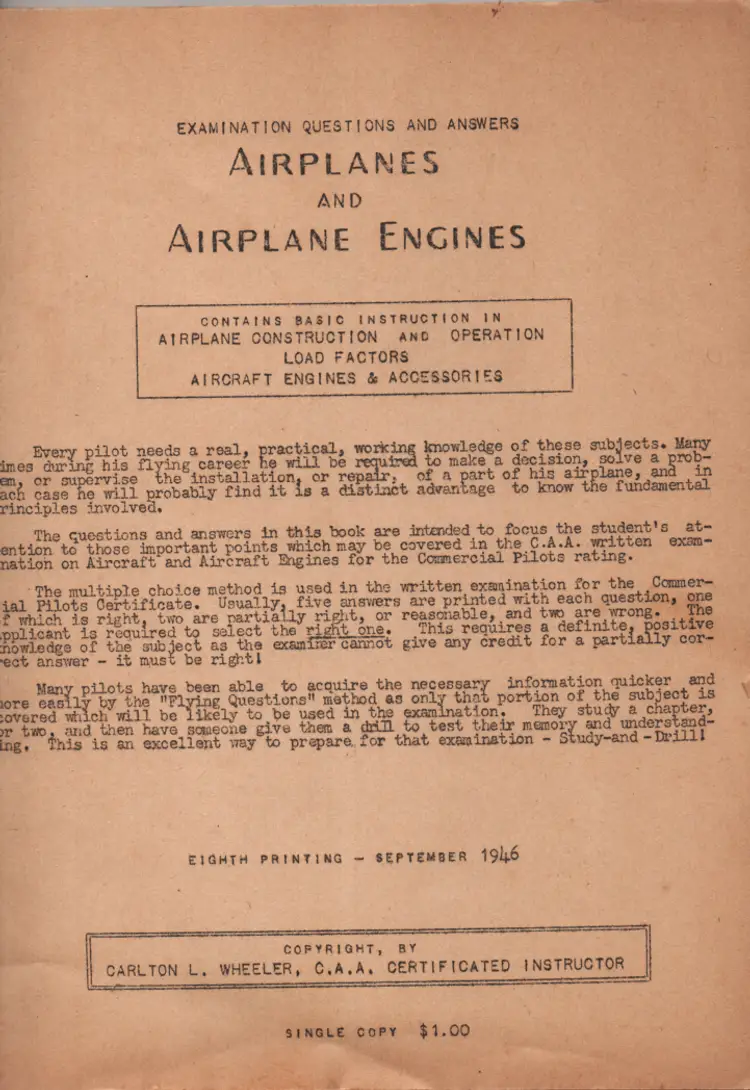 Sept 1946 version Examination Questions and Answers Airplanes And Engines For The Commercial Pilots Examination Carlton L Wheeler Penn Yan NY.