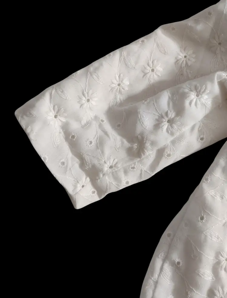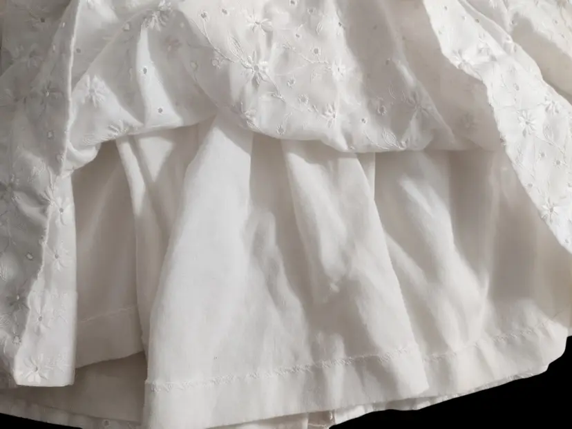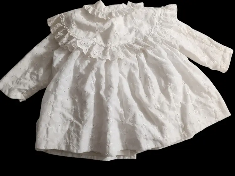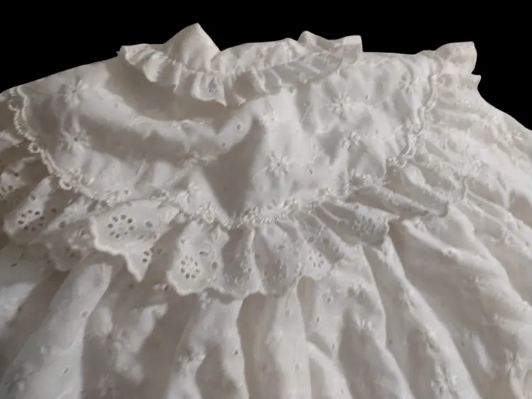 This is such a pretty vintage thick lined eyelet lace button up dress or tunic with a ruffle collar in front & back, pink Satin buttons as well as a bow & embroidered flowers all over. Shoulder to shoulder measures 10" x pit to pit measures 24" x shoulder to hem measures 16".