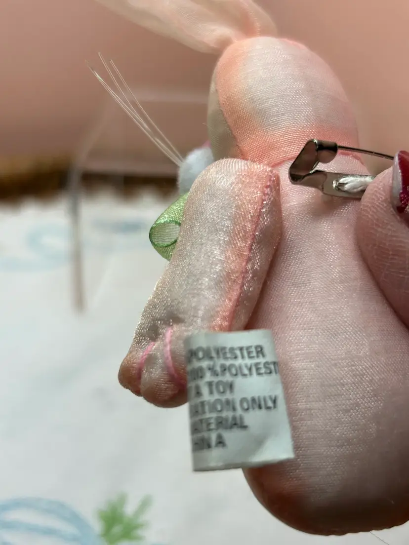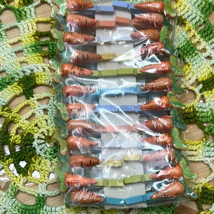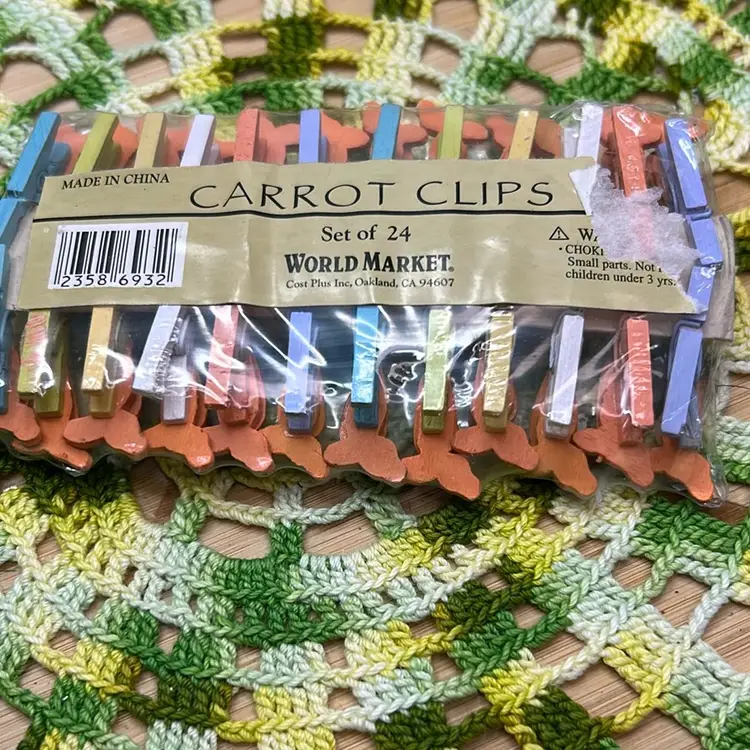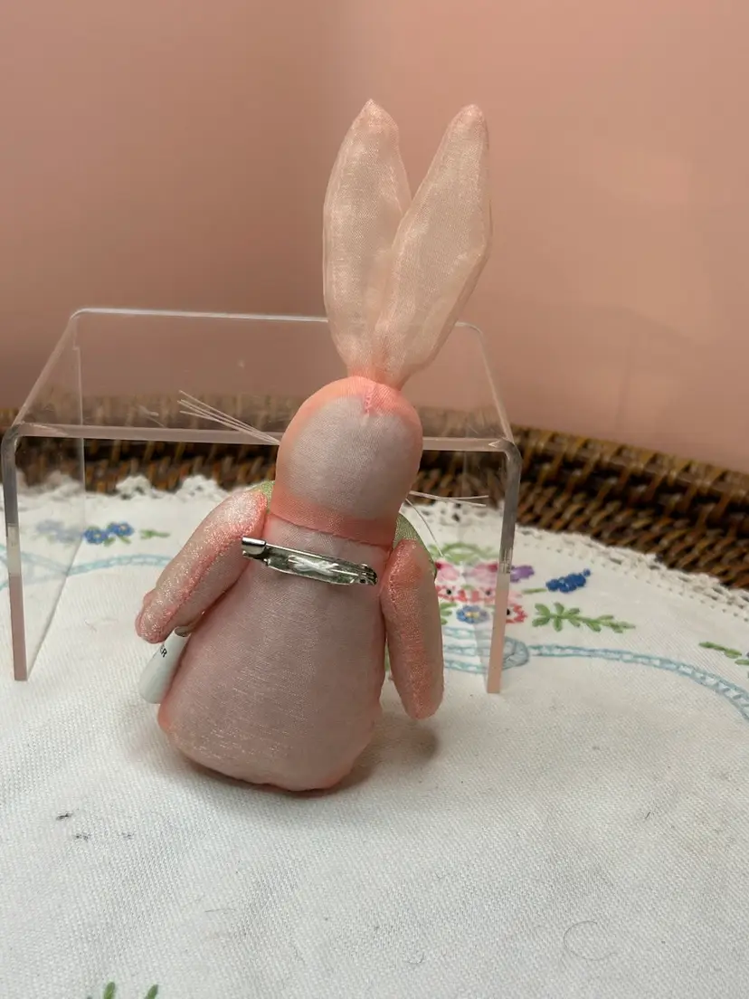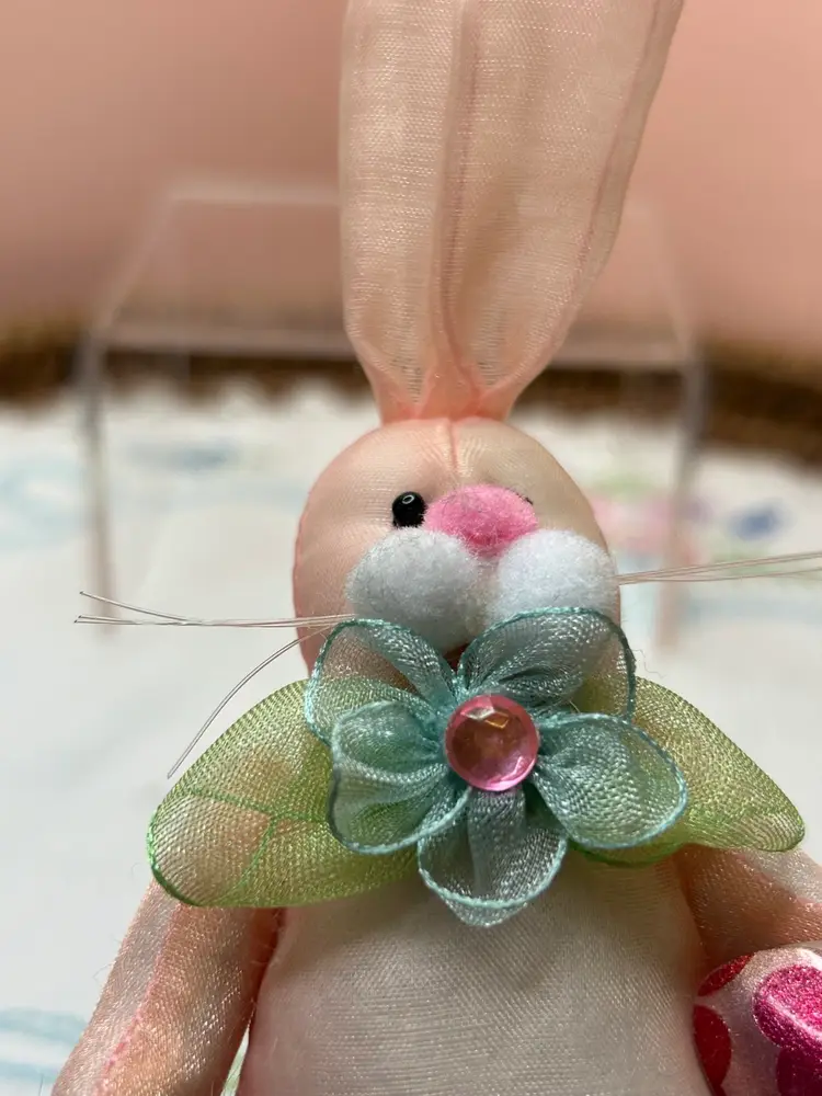 Made of polyester, with flower and “jewel” decoration. 5” tall including ears, 1.5” wide. BONUS: Carrot Clips (see last 2 photos).