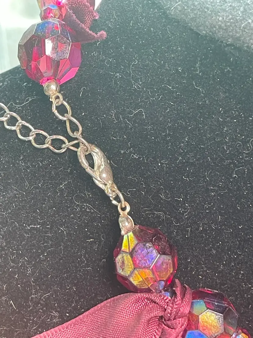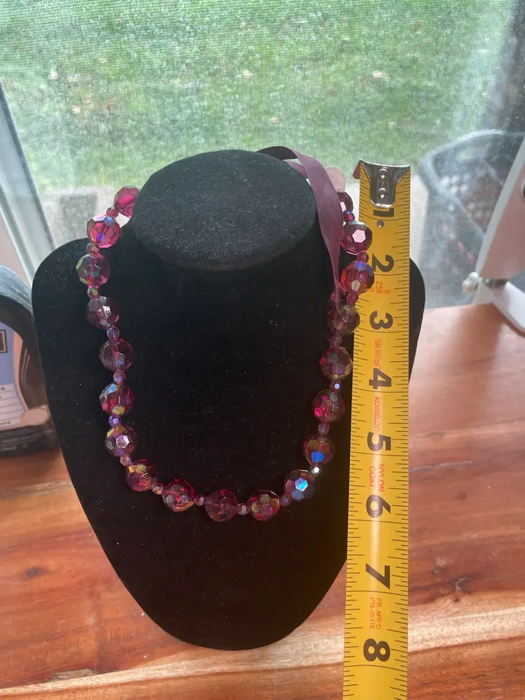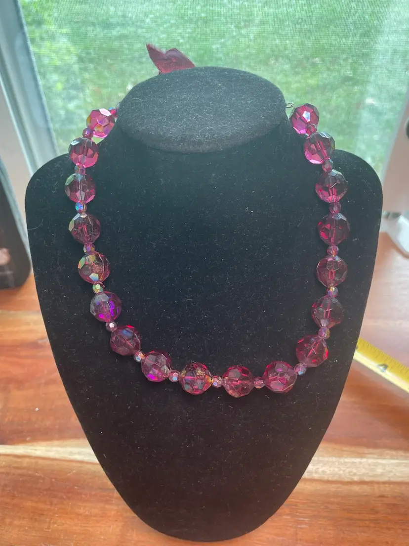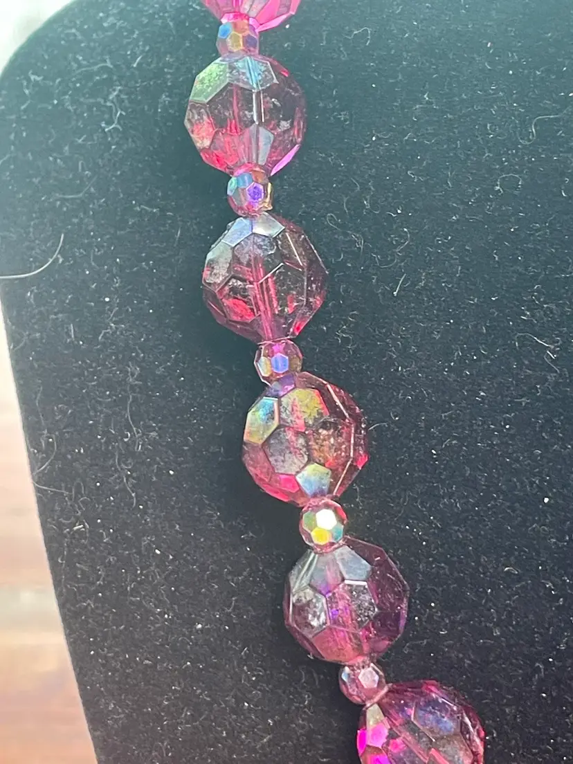 This is a faceted pink glass beaded necklace, likely as being from the Art Deco era or mid-century (1930s-1950s). The faceted beads are designed to reflect light and have an iridescent quality.