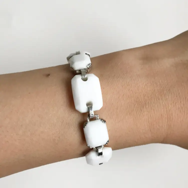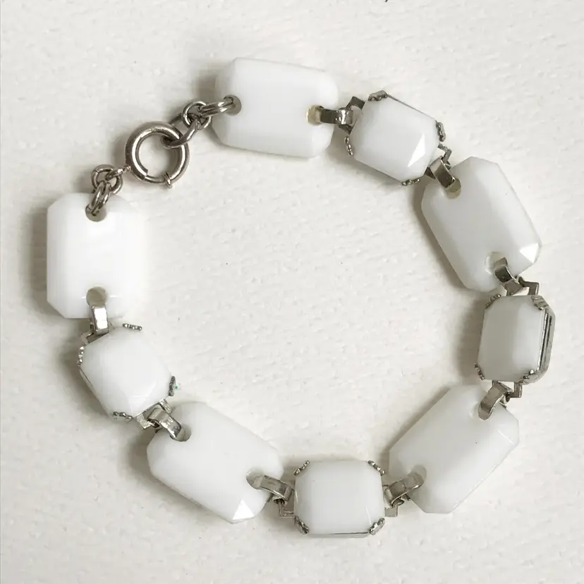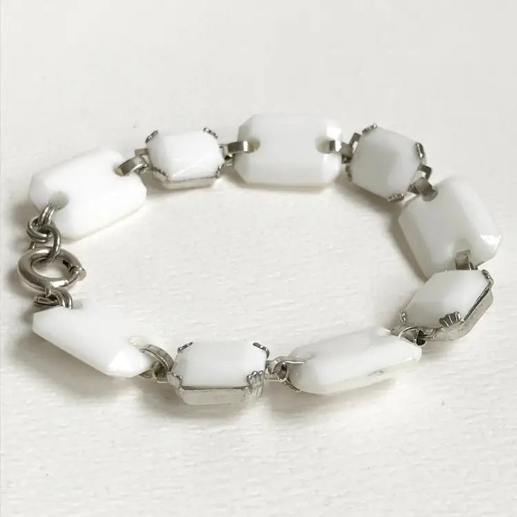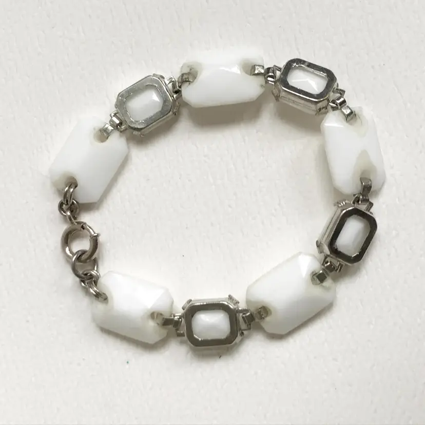 Bracelet features white glass stones with alternating prong set smaller ones set in silver tone metal and a spring ring clasp.