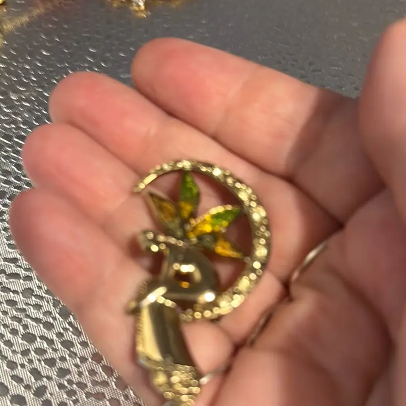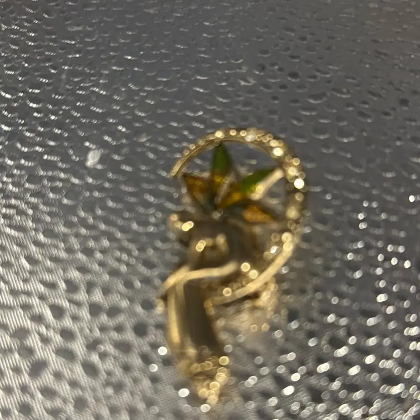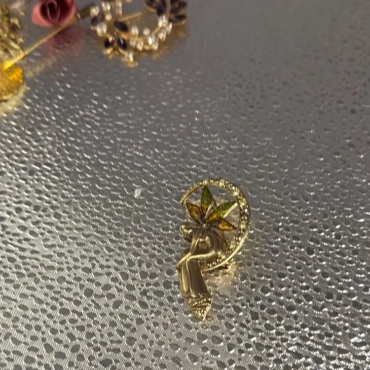 This gold tone metal brooch is so beautiful. Her wings are made of green enamel. Layering the outside the crescent moon are faux diamonds.