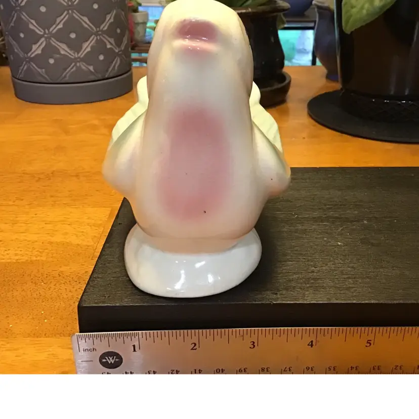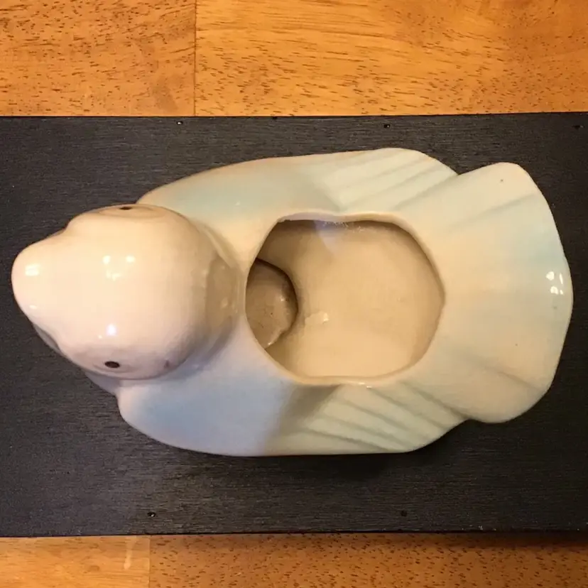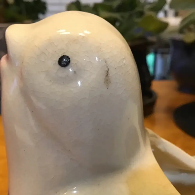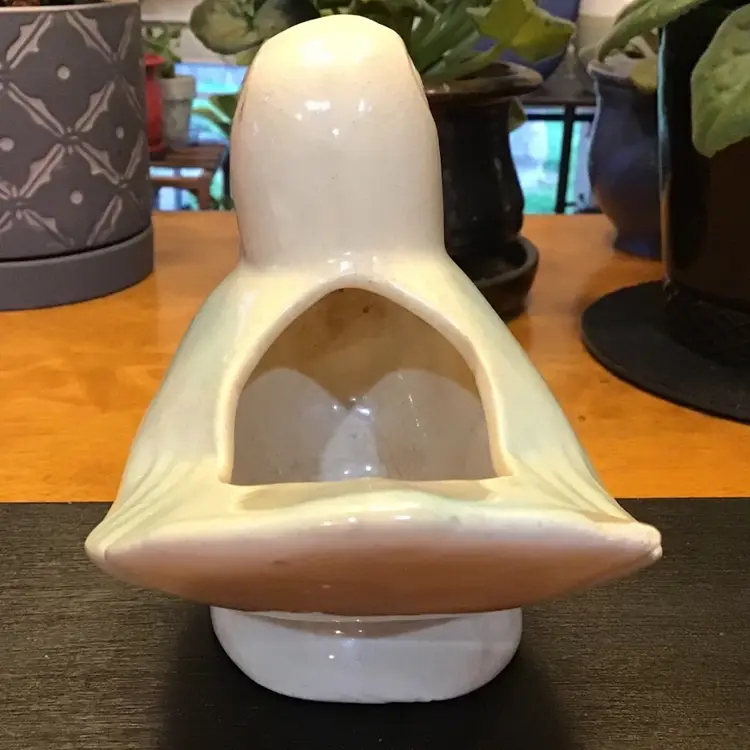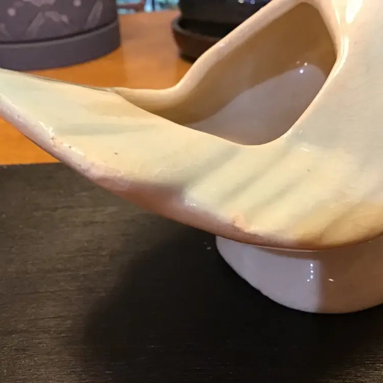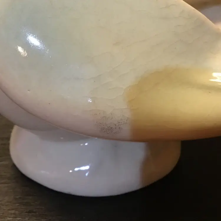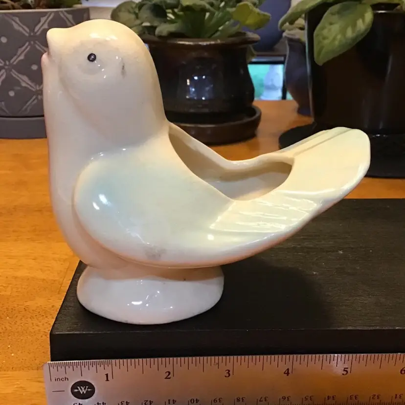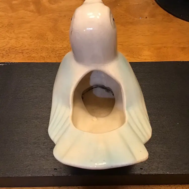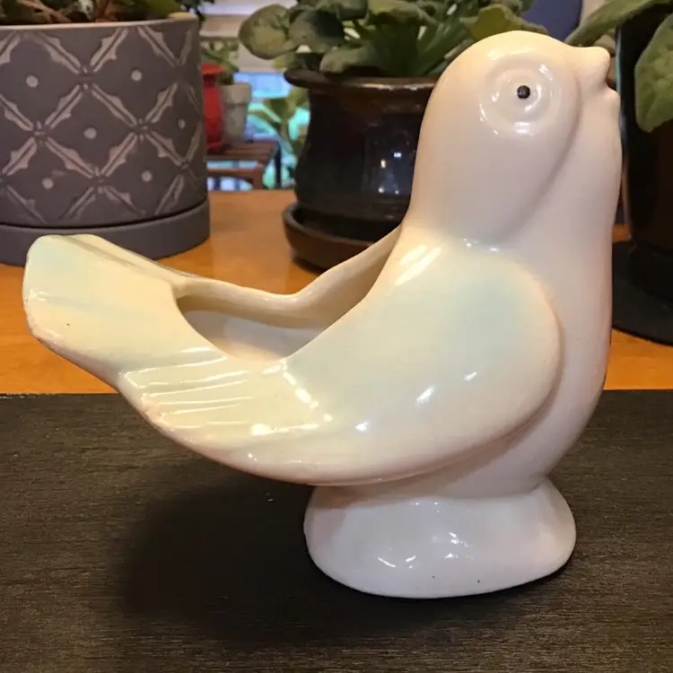 Cute bird planter is in good condition. It does have crazing and a few black marks. It also has a couple of tiny chips along the edge of his tail. No other issues. Size is in the pictures. See all pictures as they are an important part of the description.