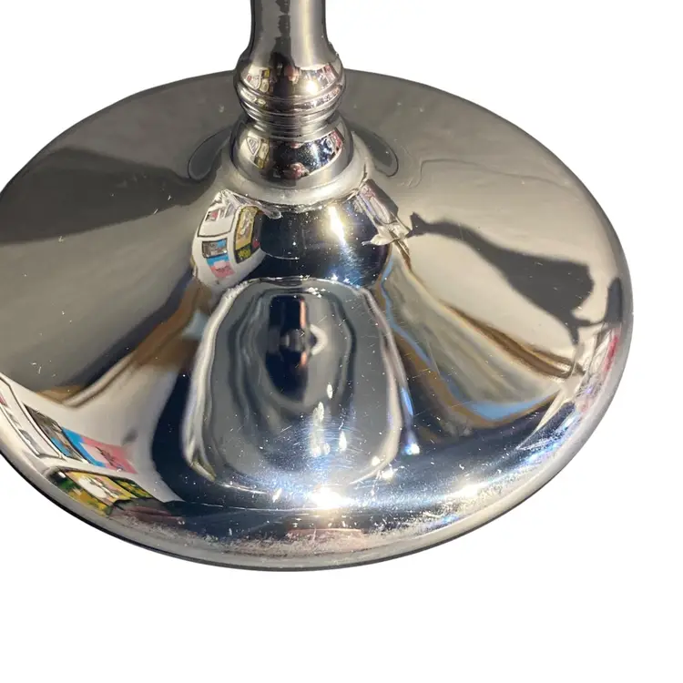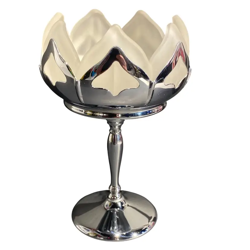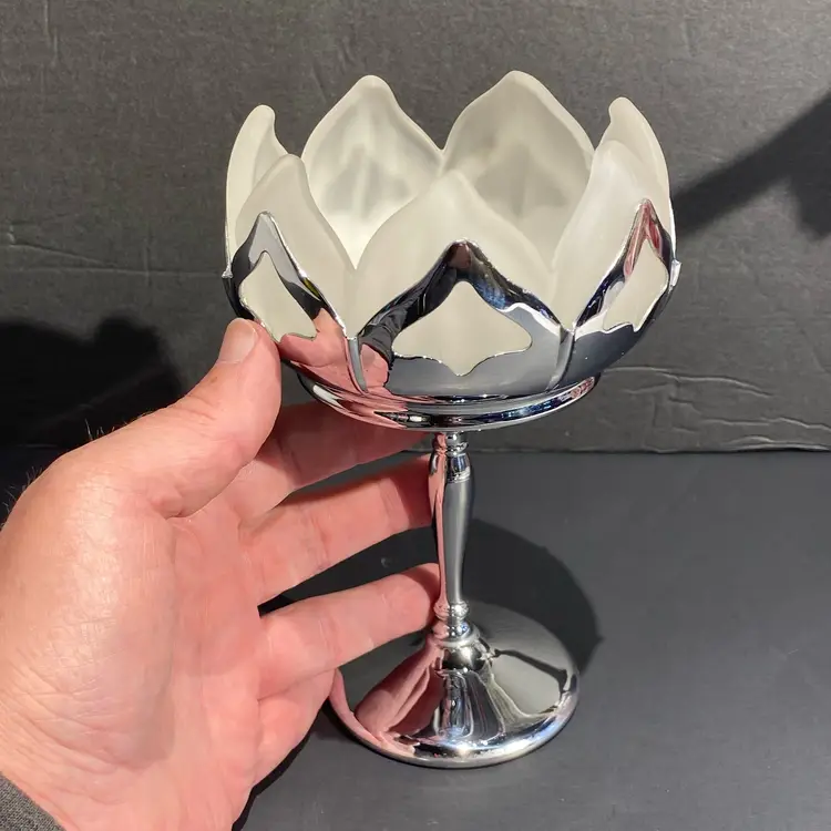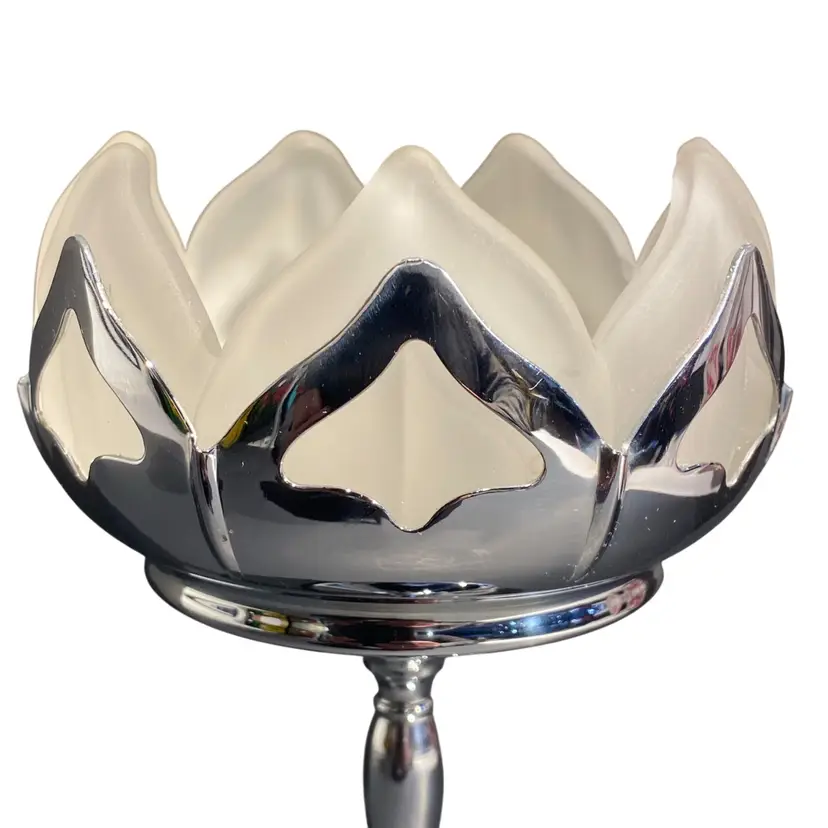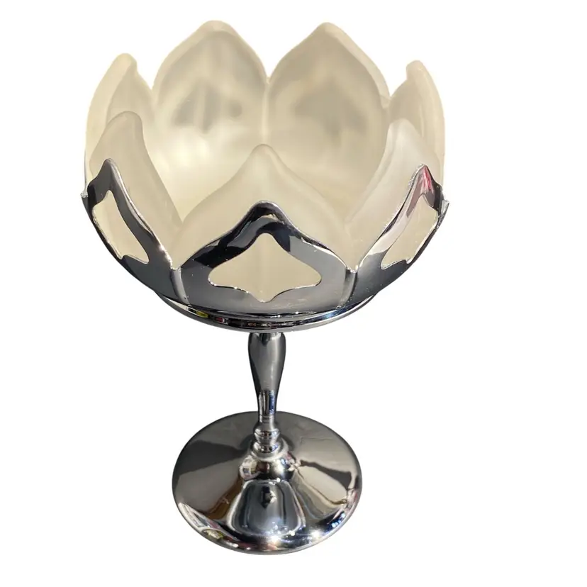 Vintage Farber Bros, NYC Chrome Frosted Lotus Flower Compote Candy Dish Maker marked and Pat # located on the bottom as seen in photos. 6 3/4” T X 4” W at center of bowl. Used pre owned. No chips or cracks. Some tiny scratches on chrome. As seen in photos.