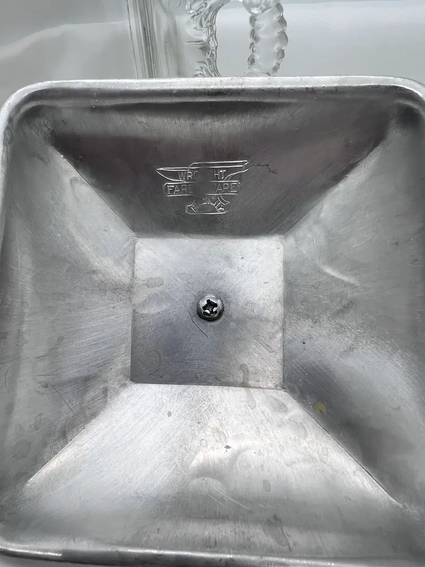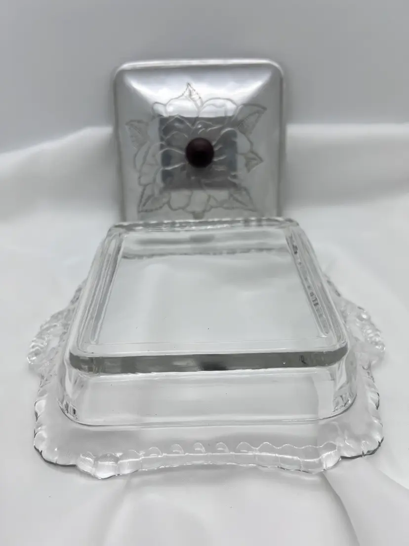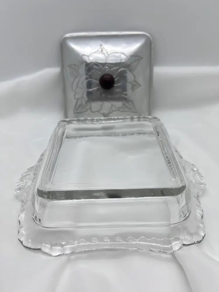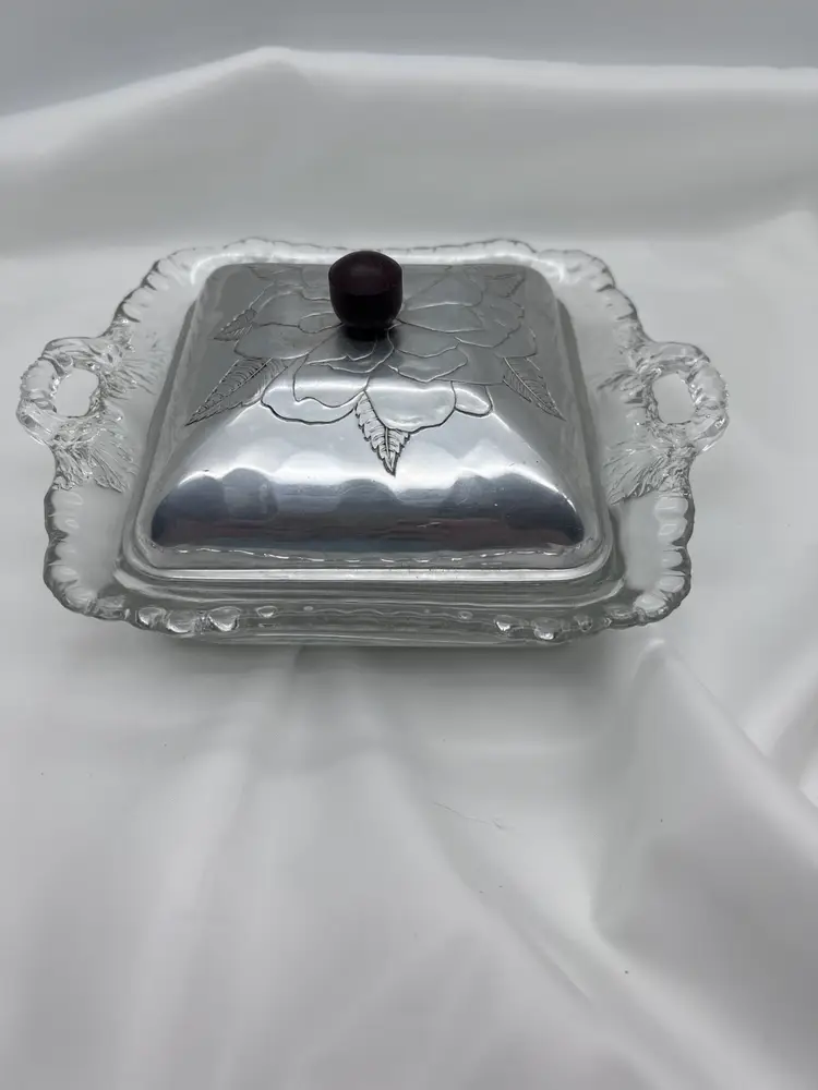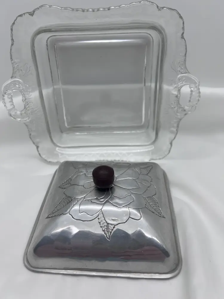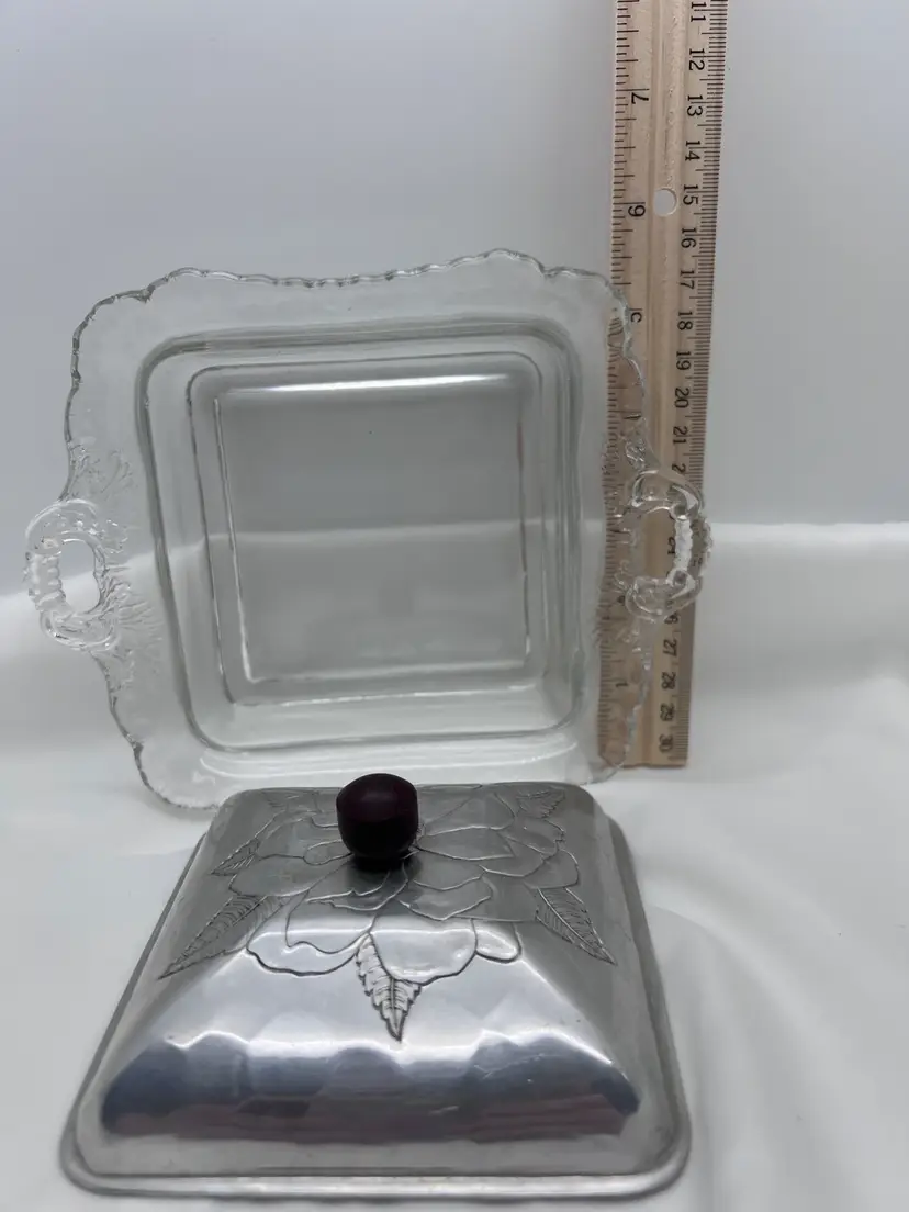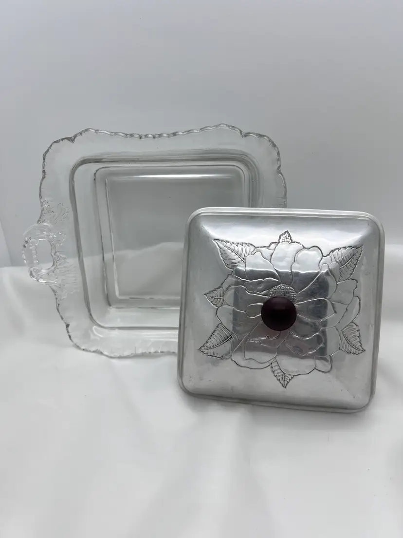 Beautiful vintage covered serving dish. Ornate pressed glass dish 5 1/2” x 7”. Aluminum lid has an etched floral design and Bakelite handle. Could be used as a trinket box as well Unique piece to add to your collection. In very good used condition - No chips, cracks, dents or dings.