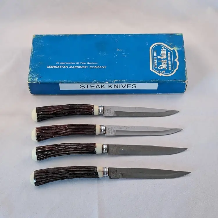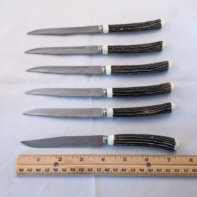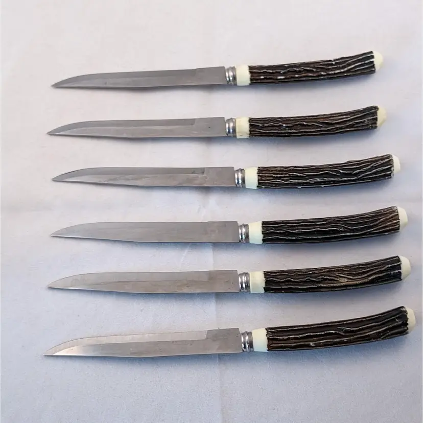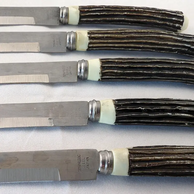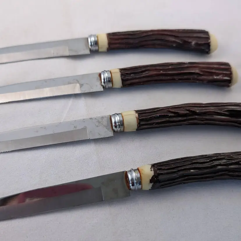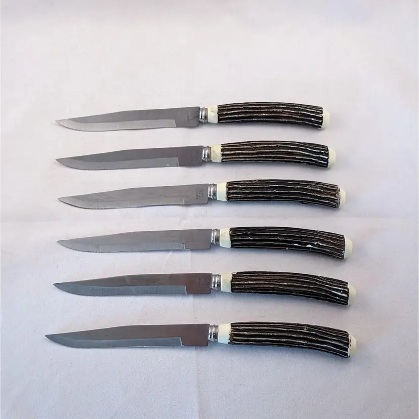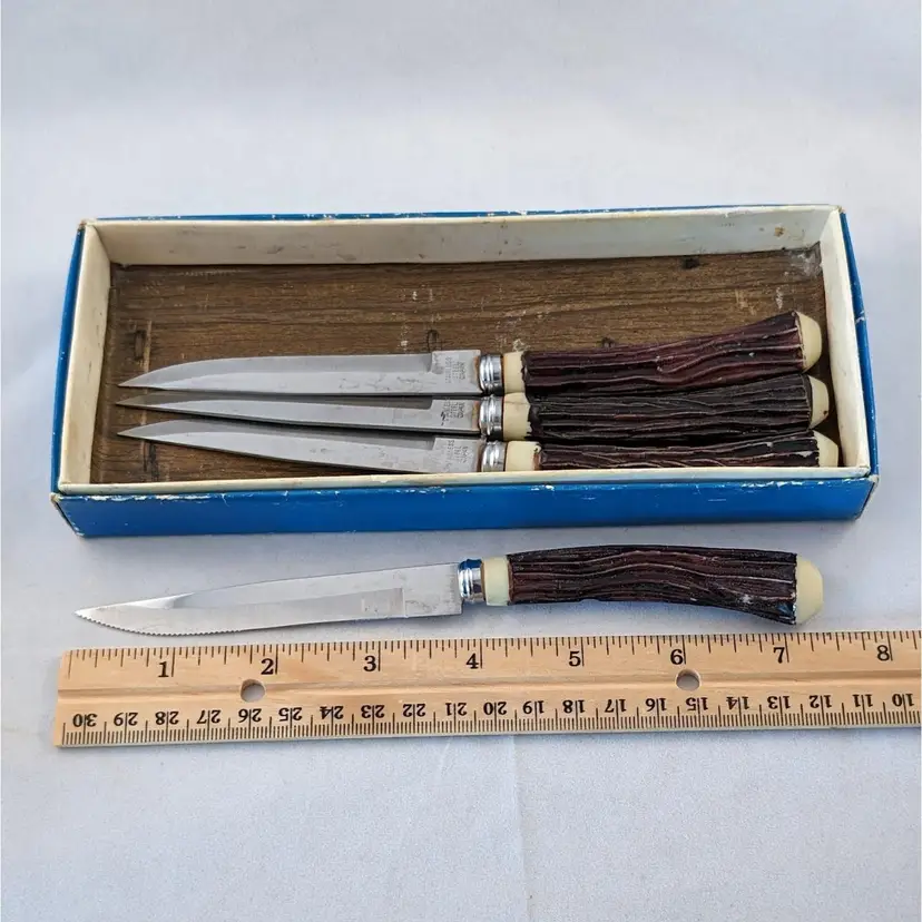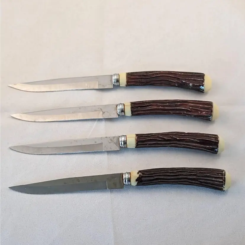What fun are these steak knives! This lot included 2 different sets of steak knives. There are 4 that came in the blue box and 6 that were separate. They are all in used condition, please see the pictures for wear, cracking, tarnish/rust.