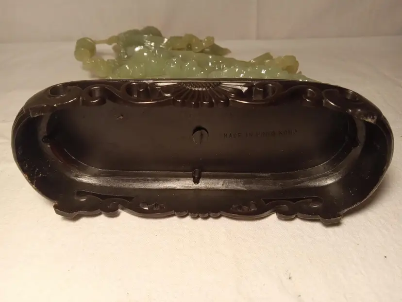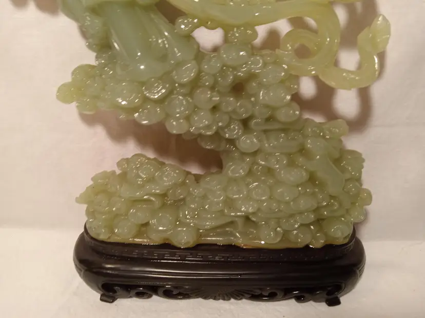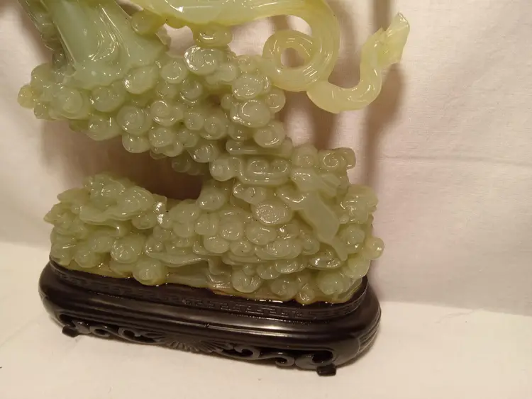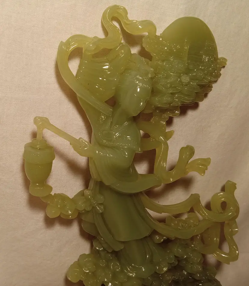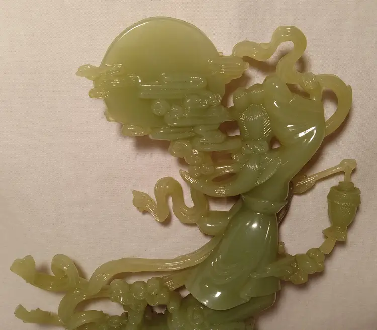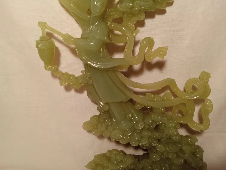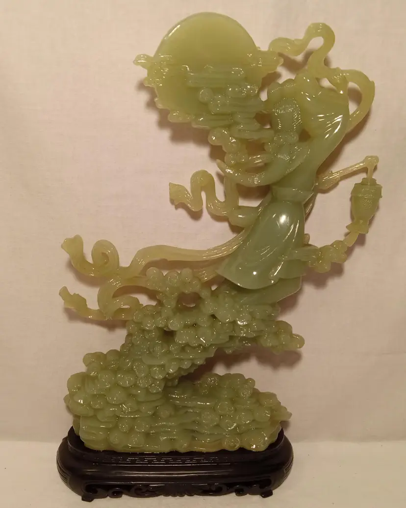 Vintage Faux Jade Figurine of an Oriental Lady Holding a Vase With Clouds, Houses and a Bunny. Bottom is Plastic. Made in Hong Kong. 12.5" tall. The figurine is in mint condition.