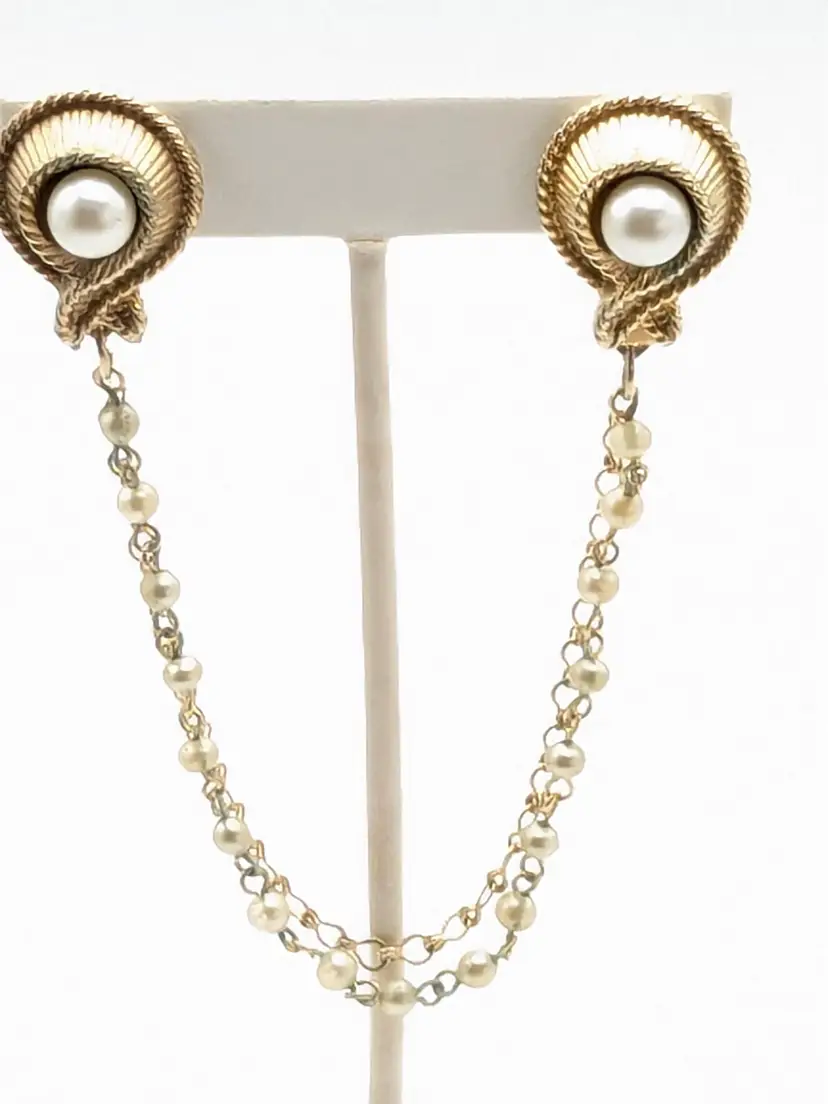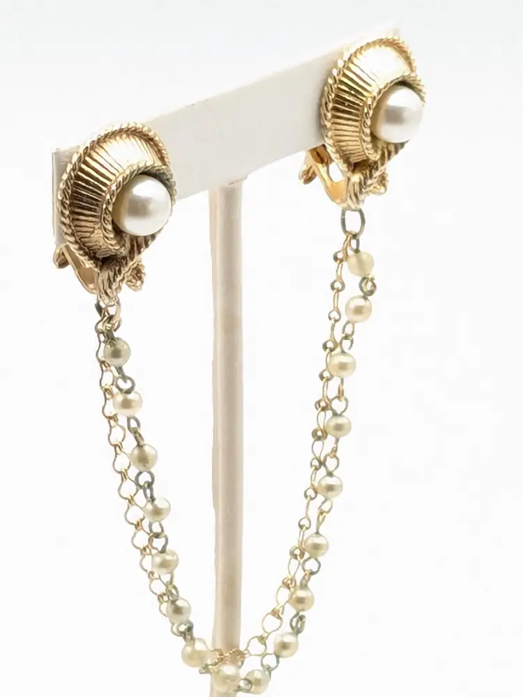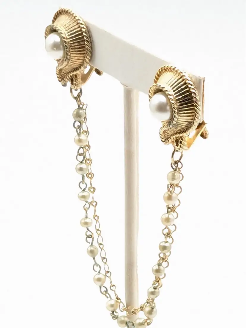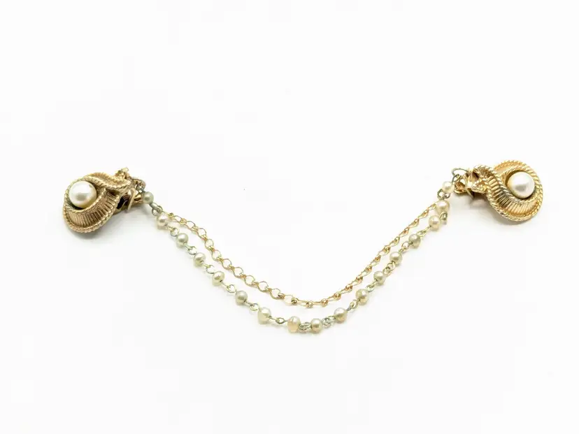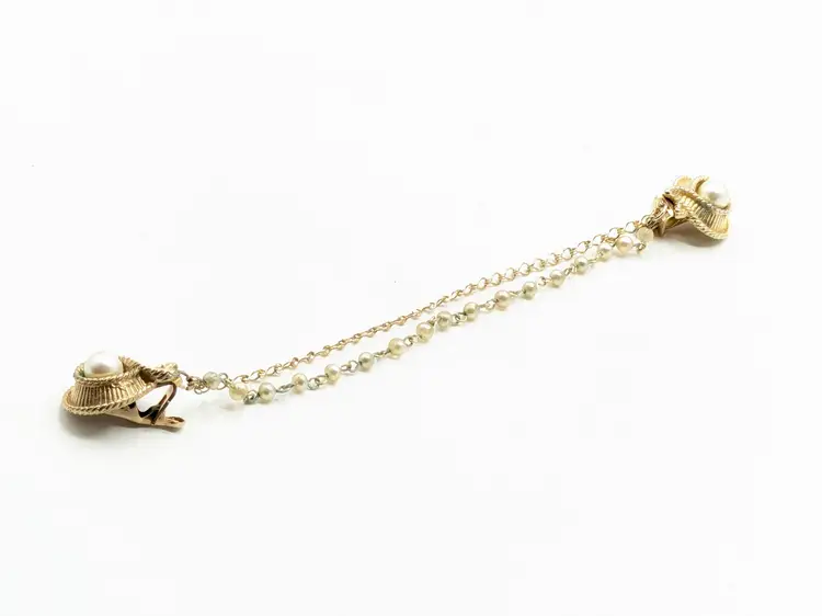 Good condition with a little verdigris on the chain. Elegant gold-tone clips with faux pearl centers and a delicate chain. Perfect for adding a touch of vintage charm to your outfit. Chain measures 7 1/2". Pearl clips are both 3/4" x 1". EN2