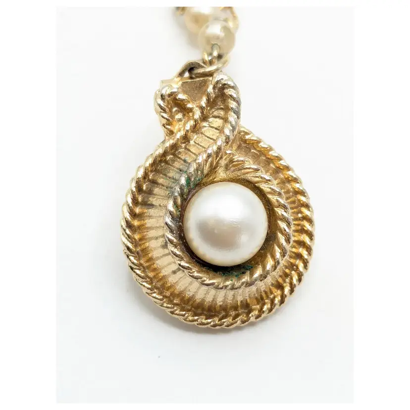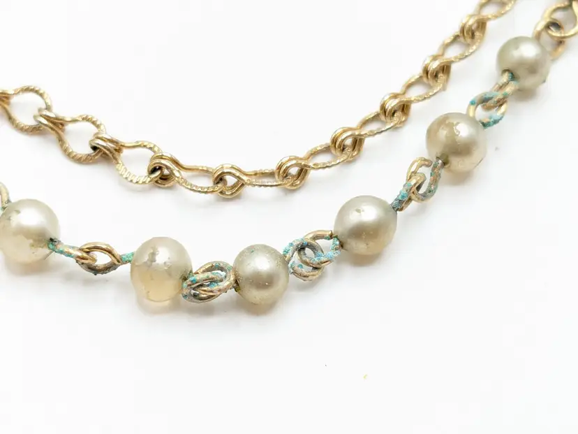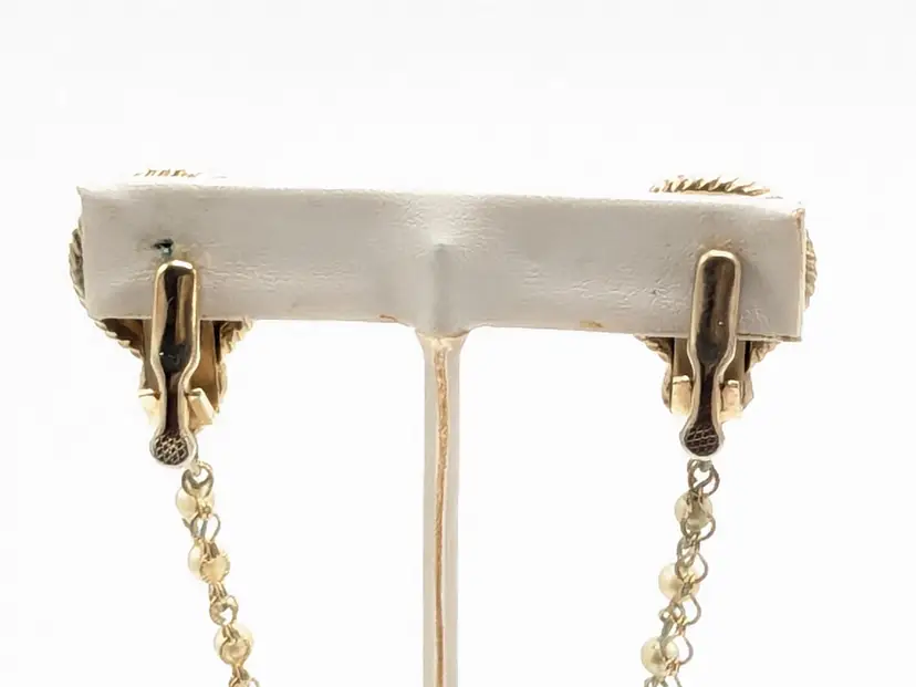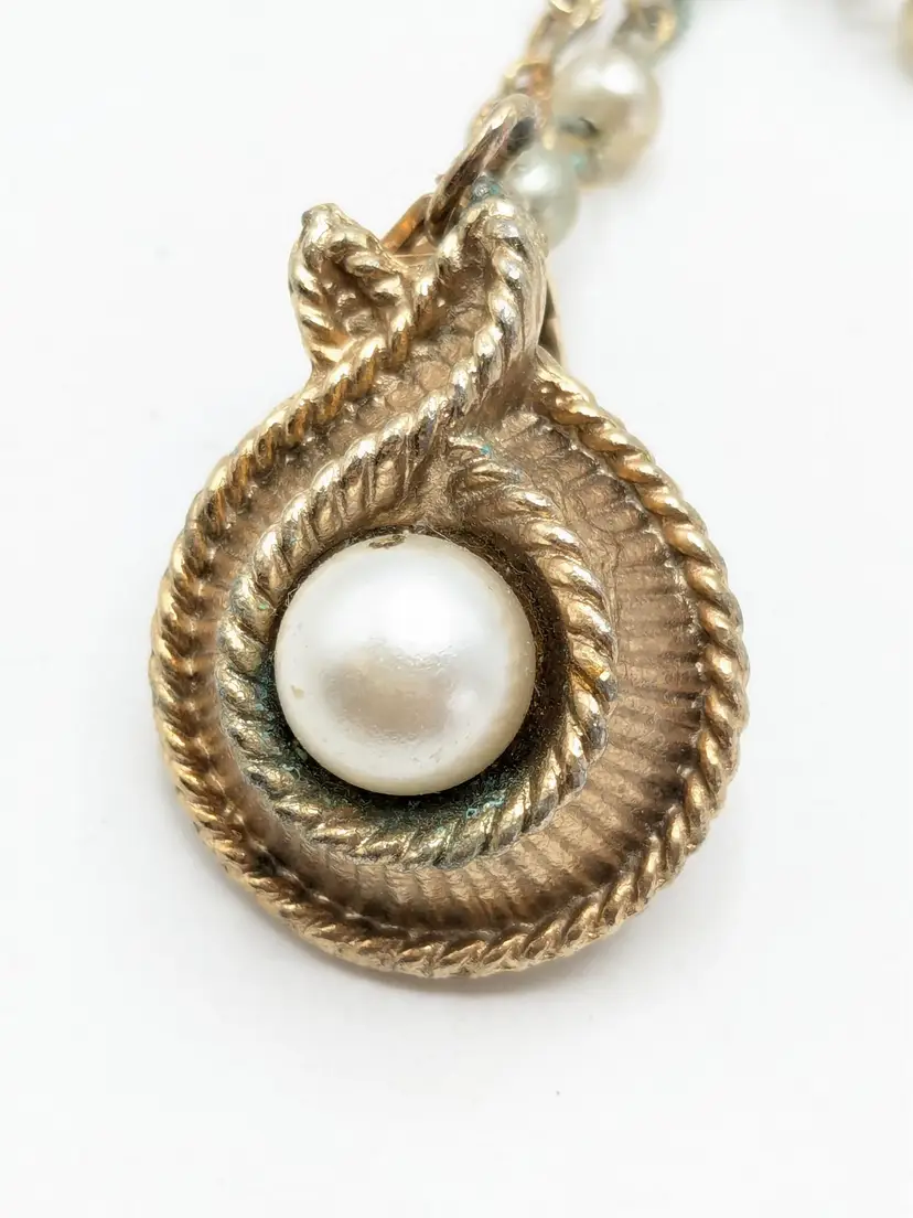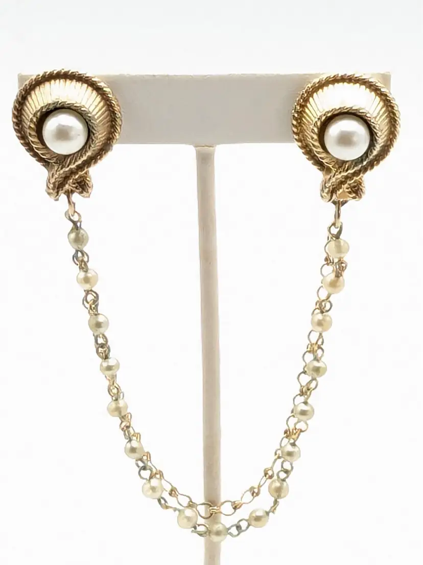 Good condition with a little verdigris on the chain. Elegant gold-tone clips with faux pearl centers and a delicate chain. Perfect for adding a touch of vintage charm to your outfit. Chain measures 7 1/2". Pearl clips are both 3/4" x 1". EN2