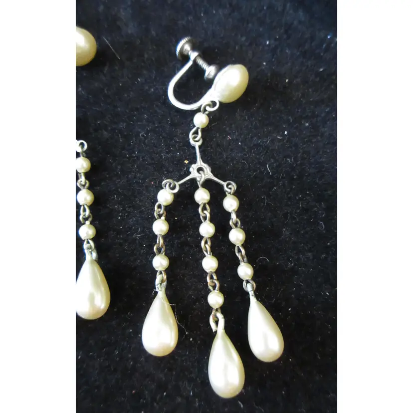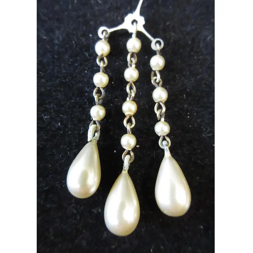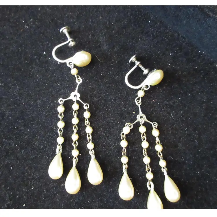 This is a BEAUTIFUL VINTAGE pair of silver tone metal dangle chain earrings with faux pearls. The earrings are about 2.25 inches long and feature a faux pearl button on the ear and 3 dangling teardrop-shaped faux pearls on 3 separate chains. The chains are covered with tiny faux pearls as well. It's a faux pearl extravaganza! These earrings are from the 1960s or 1970s and feature a screw back closure.