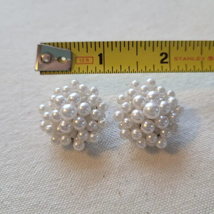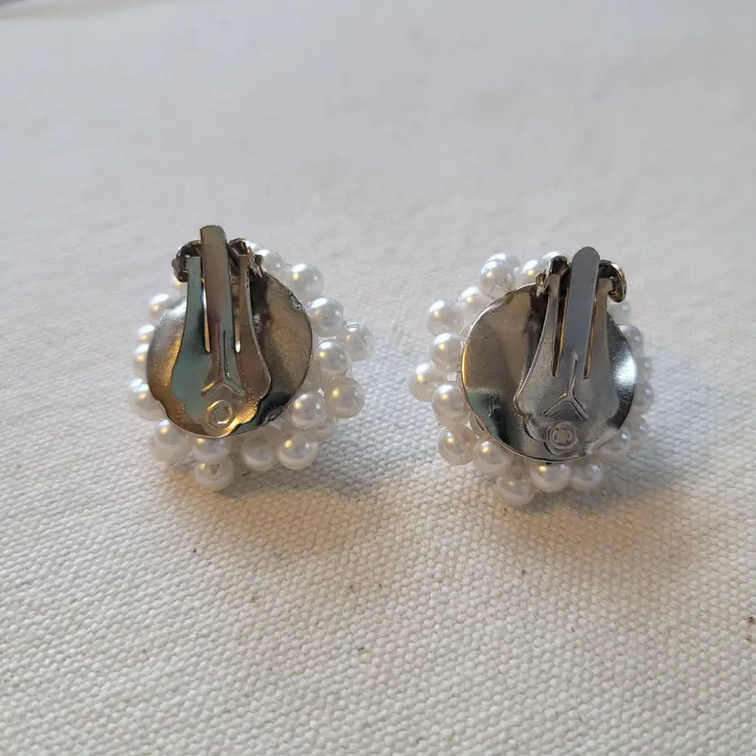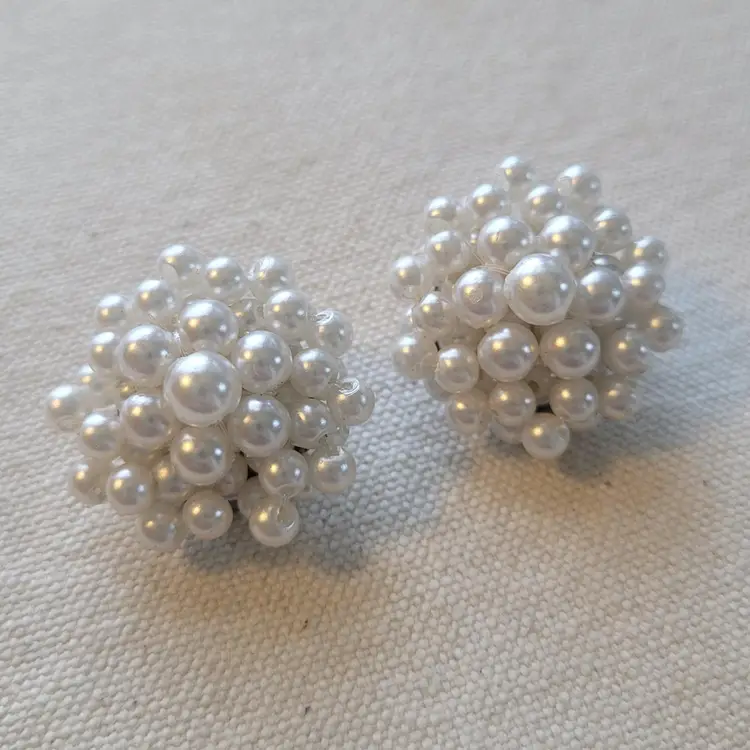 Step back in time with these classic faux pearl cluster clip-on earrings. Perfect for adding a touch of elegance to any outfit. Pre-owned with a vintage charm, they show minimal signs of wear. Clip mechanisms function well. See pics for a closer look.