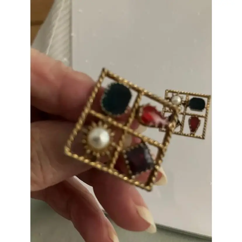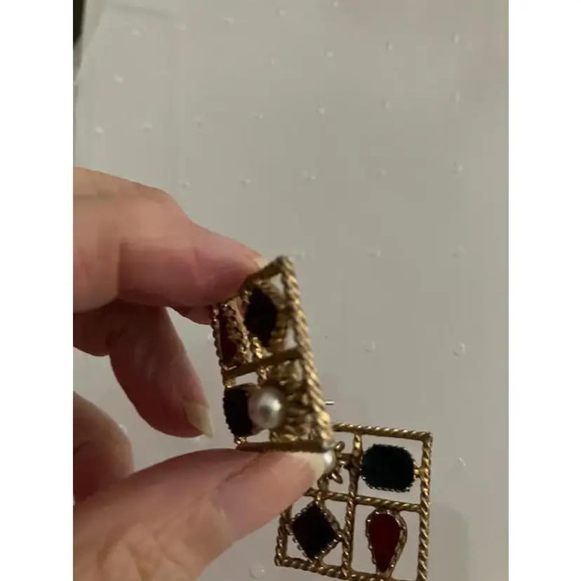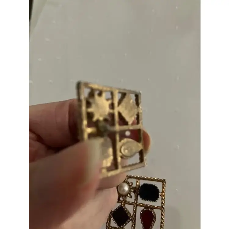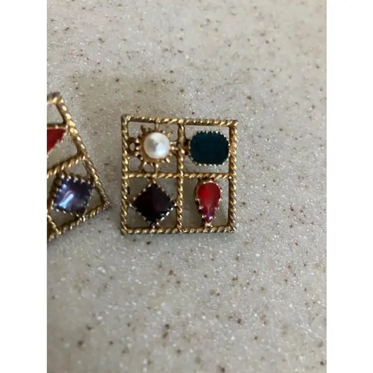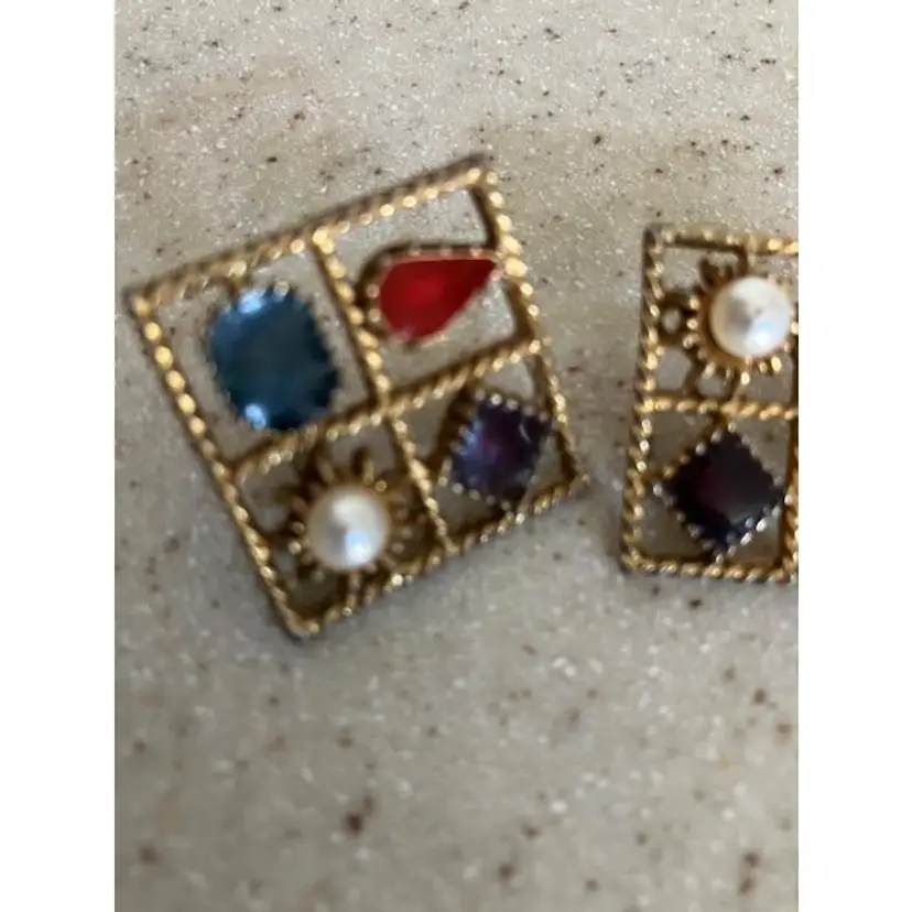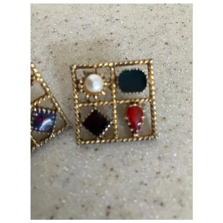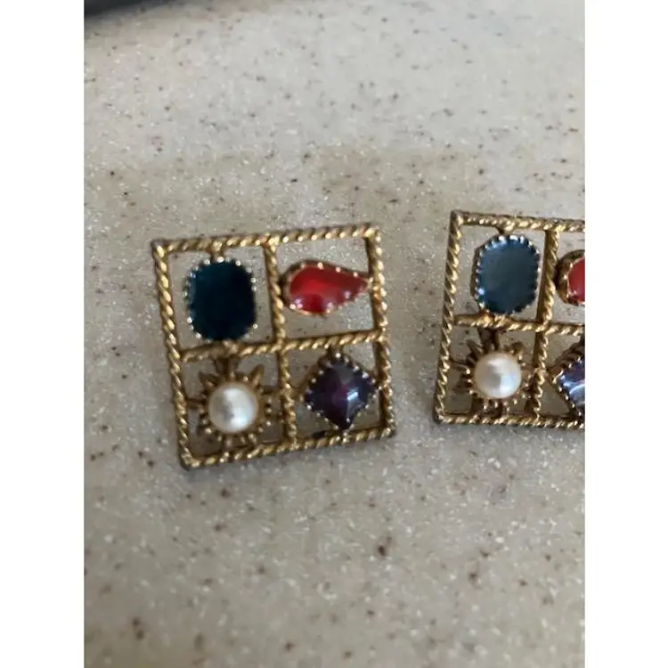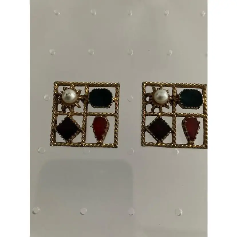 Square gold tone vintage faux pearl with red, purple & blue colored stones pierced earrings. Can sparkle when the light hits them. Otherwise the finish seems matte like. The 1st picture shows a scratch on the pearl on the left earring. They measure 1" x 1". They are stamped PISCES.