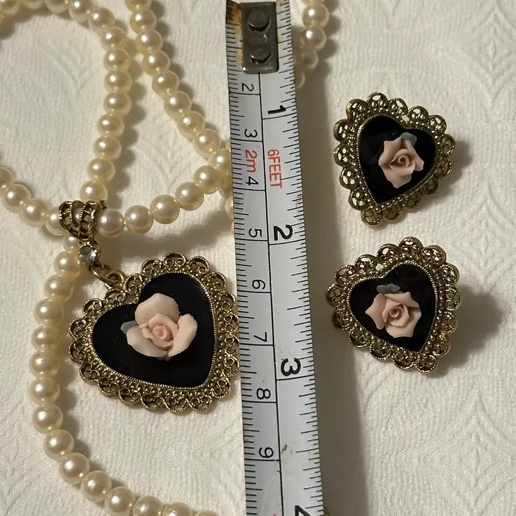 Beautiful set! One earring has a small chip, but you can’t tell from the front. Nice overall. 17” with 2” pendant