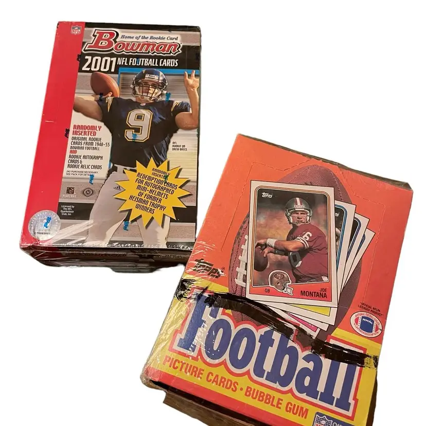 Join the chase for some of the most iconic football rookie cards of the past 50 years as you get one (1) pack of 1988 Topps Football (chasing RCs of Bo Jackson, Kevin Greene (HOF), Sam Mills (HOF), Chris Doleman (HOF), Vinny Testaverde, Christian Okoye, Seth Joyner, Clyde Simmons, Neal Anderson, and Brian Bosworth) and one (1) pack of 2001 Bowman Football (chasing RCs of Drew Brees, LaDainian Tomlinson, Michael Vick, Richard Seymour, T.J. Houshmandzadeh, Deuce McAllister, Reggie Wayne, and Todd Heap).